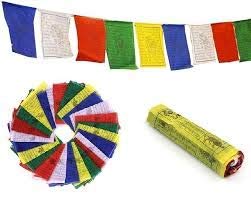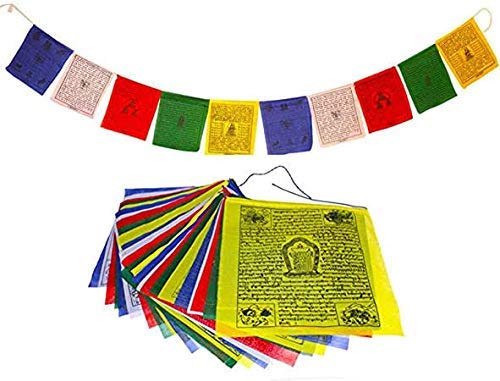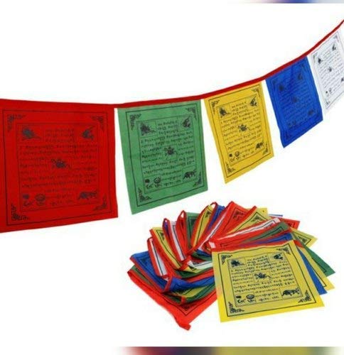 WIND HORSE FLAG The five bright colors represent the basic elements: Space air fire water and earth. When the wind blows it emits positive spiritual vibrations. TIBETAN BUDDHIST This prayer flag with look captivating hung outside your home on trees or mountain tops showing supports for Tibetan people. BEAUTIFUL GIFT Clear decals are printed on a stunning polyester material. It promotes peace compassion strength and wisdom. These flags would also look attractive in your home or on the yard. SPECIFICATIONS The string is 16 feet long with 25 clear block prints on high quality polyester. Each flag measures 8 x 10 inches. WARRANTY We stand behind our products! sold and fulfilled by Divine Buddha handicrafts.