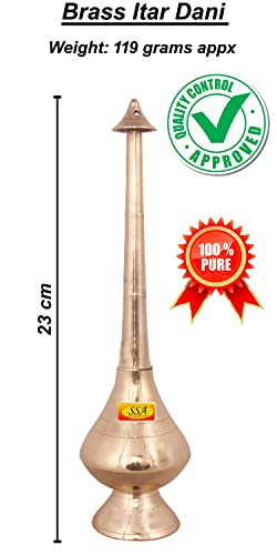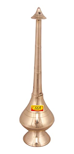 Shiv Shakti Arts Present Brass Gulab Pash - an elongated vase with a perforated sprinkler top is a rose water container widely used in royal courts (durbars) during ceremonies and festivals. It is of Persian origin and introduced in medieval India widely in the Mughal courts. Originally an article of everyday use it attained a special place and with fine embellishments it reached the stature of paraphernalia widely in every Muslim or Hindu court. The cultivation of various fragrant flowers for obtaining perfumes including rose dates back to Sassanian Persia. Locally it was known as gulag in Middle Persia and as zoulápin in Byzantine Greek. The present day production of rose water through steam distillation was refined by Persian chemists in the medieval Islamic world which led to more efficient economic uses for perfumery industries. In ancient times roses were used medicinally nutritionally and as a source of perfume. The ancient Greeks Romans and Phoenicians considered large public rose gardens to be as important as croplands such as orchards and wheat fields. Rose perfumes are made from rose oil also called its of roses which is a mixture of volatile essential oils obtained by steam-distilling the crushed petals of roses. This was first developed in Iran(Persia)