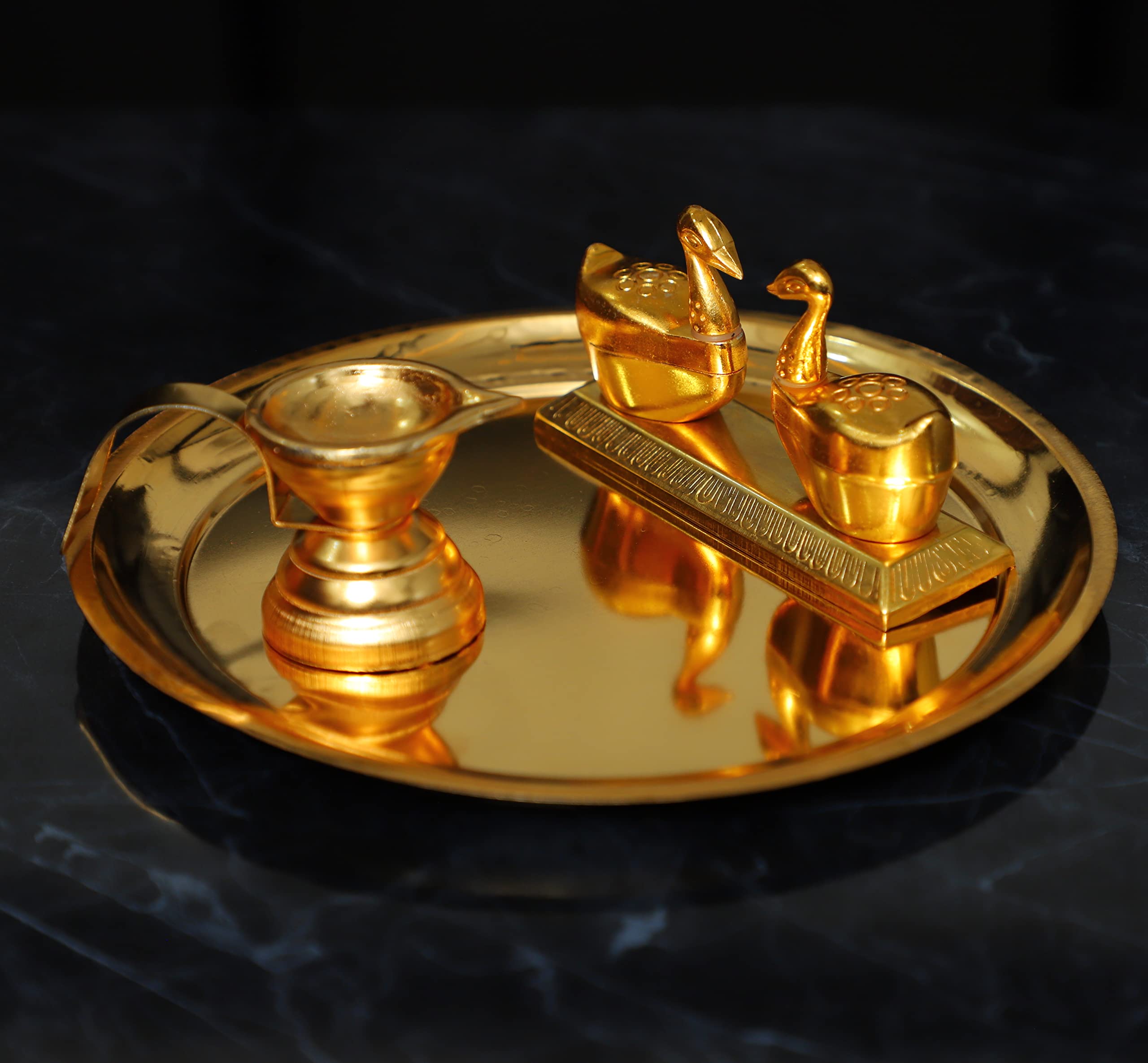 DHOKRA CRAFT Metal Golden Finish Pooja Thali With Diya And KumKum Box. Pooja Thali With Diya And KumKum Box is antique finish so looks very beautiful and use for the purpose of worship and for home decorative. It's design to looks traditional stylish and inspiration from the day's of royal touch that is made in white-metal casting with silver antiques finish white metal to bring elegance to your home. This is hand made handcrafted items use it to religious worship of god&goddess. That is use and utility items & an ideals gift it to your dear once to pass on your best wishes that is an ideal gift for have House warming anniversaries birthday wedding gifts return gifts corporation gifts religious-gifts & Indian festivals. Our White Metal Gold Plated articles is an impressive piece of art that is made from the finest-grade raw materials and intricately designed by our teams of adroit designers and craftsmen using high-end technologies.