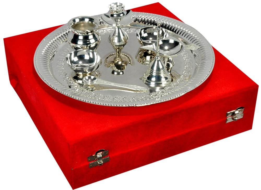 Elevate your spiritual rituals with our Elegant Silver Plated Pooja Thali Set a 7-piece sacred ensemble for divine devotion