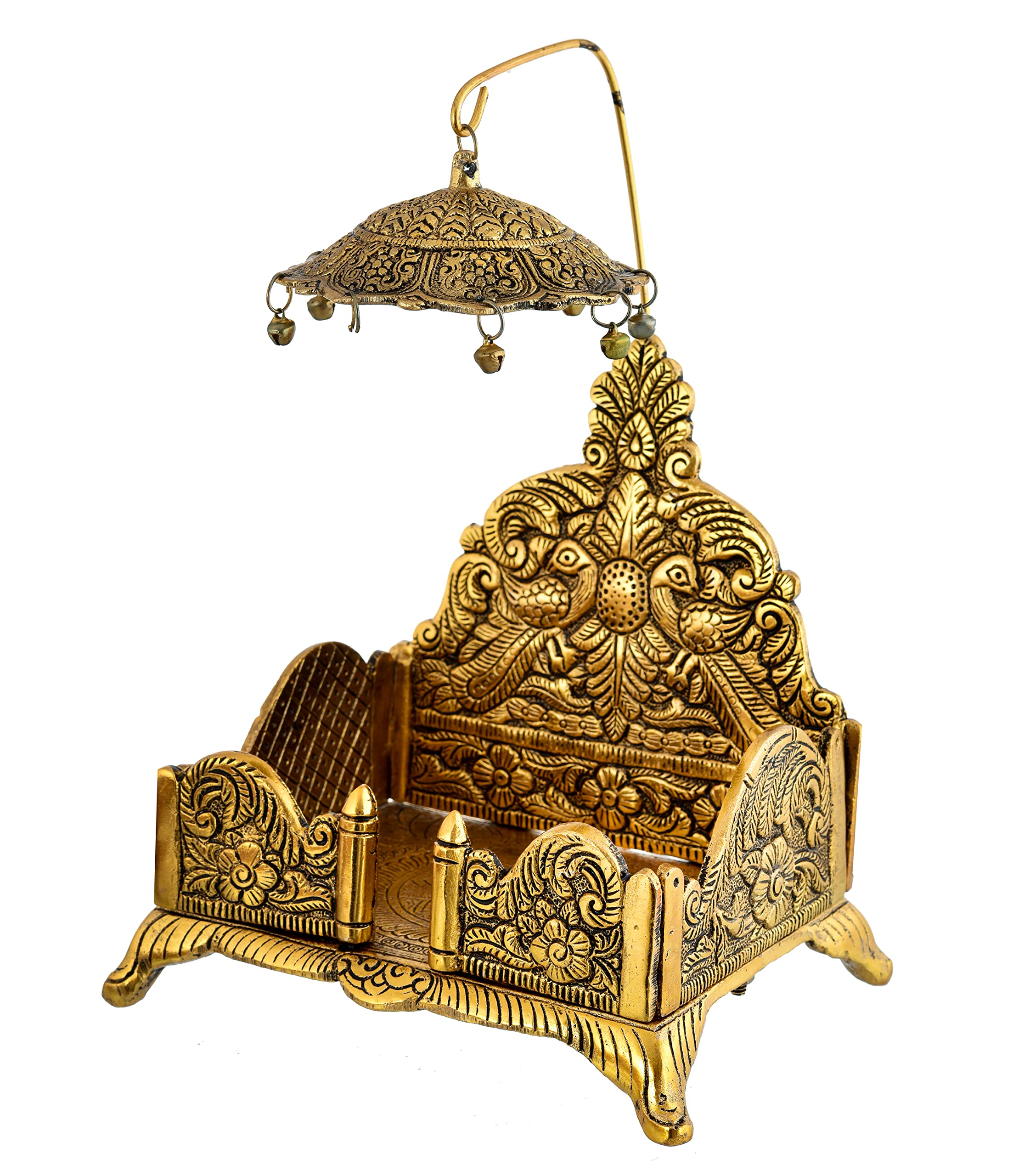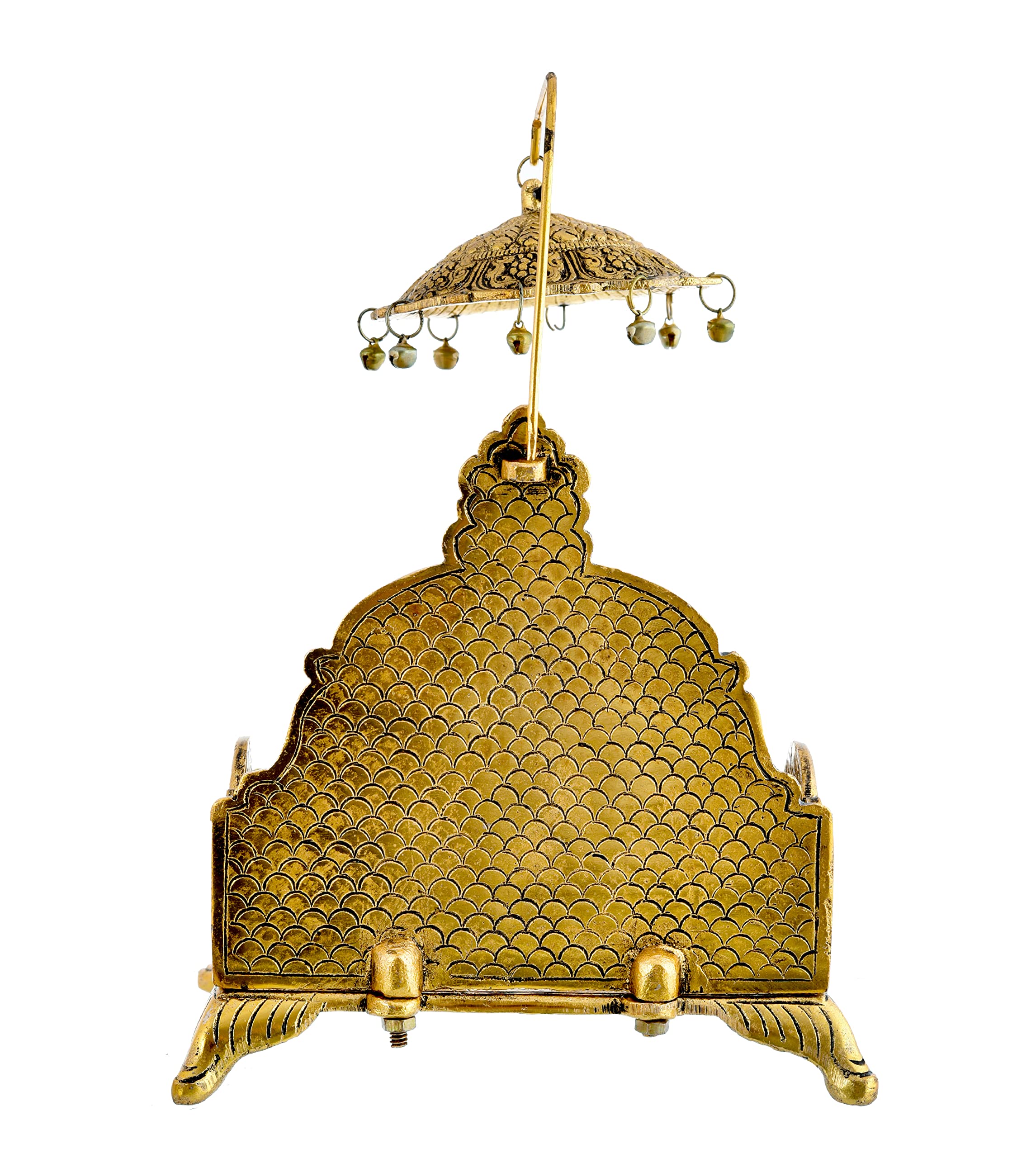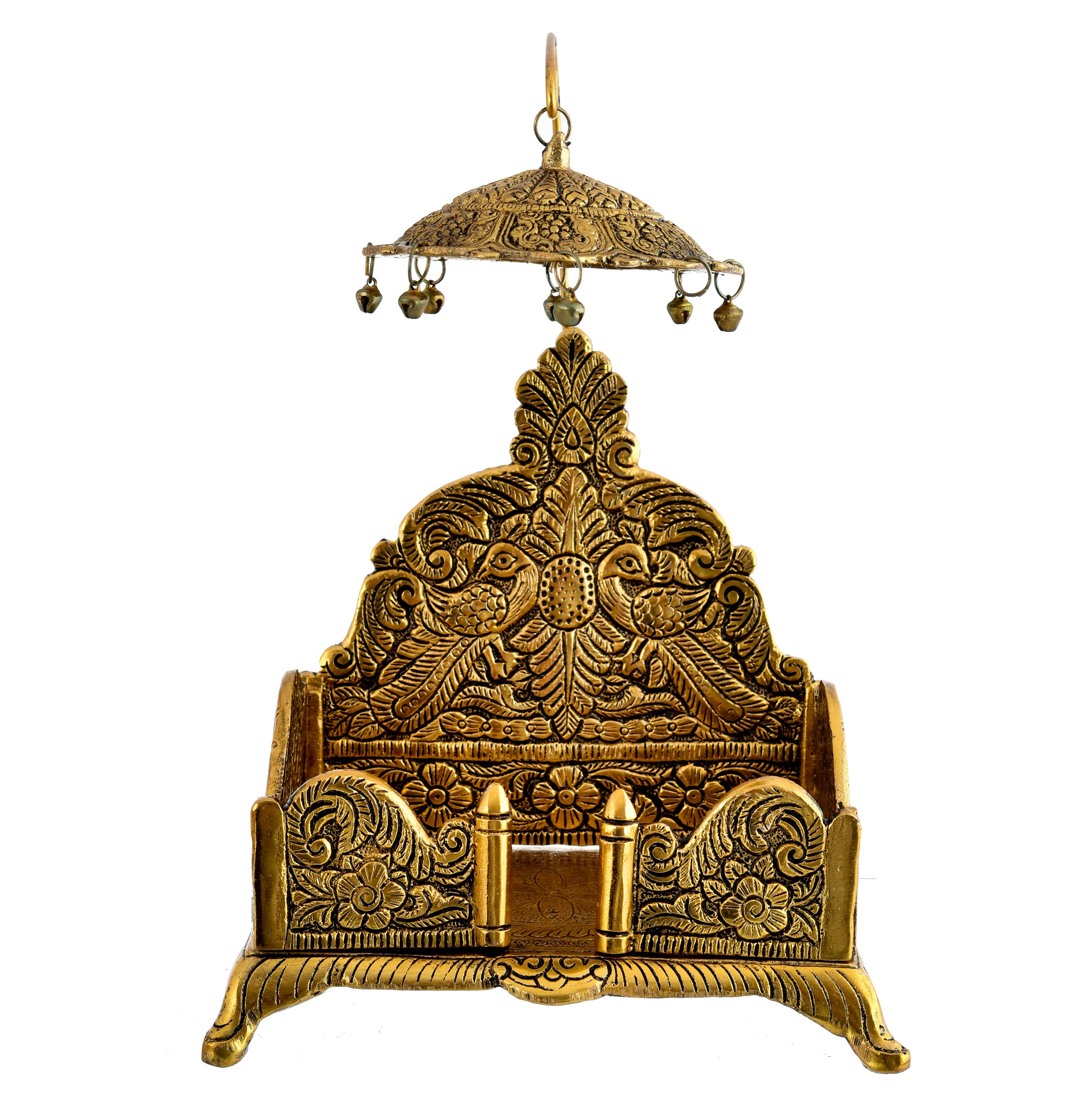 This beautiful and innovative designer singhasan is an amazing piece of art. The throne is made of beautifully carved peacocks. The idols of gods can be placed on it and the chhatra is there to cover the idol. It is a very beautiful piece to be kept in any pooja room. It is an elegant and different piece. It can be the best gift to your friends and relatives on all occasions like birthdayshousewarming gifts etc. As it is handmade slight changes in colour and design might vary
