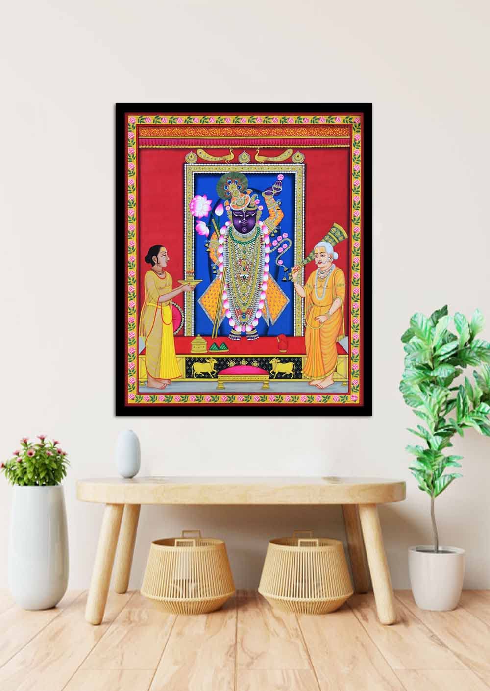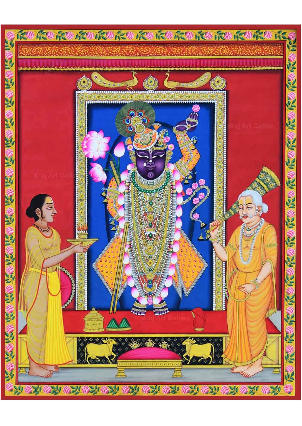 Pichwai is one of the most spectacular ancient & traditional forms of art which originated in the villages of Nathdwara in the state of Rajasthan India. This 400-year-old art form generally depicts and narrates the tales of Lord Krishna's life. The Sanskrit word "Pichh" means back and "wais" means hanging so Pichwais are paintings or hangings which form the backdrop behind the main deity of Krishna temples. The making of a traditional pichwai painting takes a considerable amount of time ranging from a couple of weeks to months.