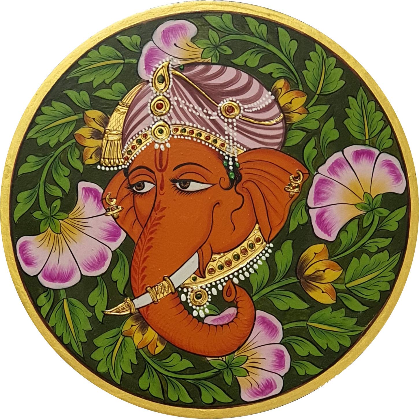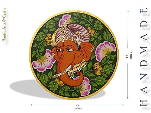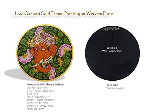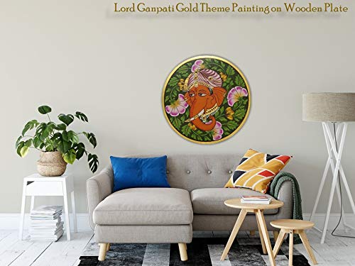 PICHWAI- PAINTED TEMPLE HANGING - Lord Ganpati Gold Theme Wall Plate - Hand Painted on Wood (10 inches). Overview a beautiful painting involves the action or skill of using paint in the right manner; hence the end product will be a picture that can speak a thousand words they say. Arts have been in trend for quite some time now. It can give different viewer different meanings style and design the wood matte abstract painting with frame is quite abstract and mysteriously beautiful. The painting has a nice frame to it. You can gift this to a family or a friend. The painting has various forms of certain figures on it as seen in the image. You can add a good set of lights to the place where the painting is and the decor will give a different feel and look to the place.
