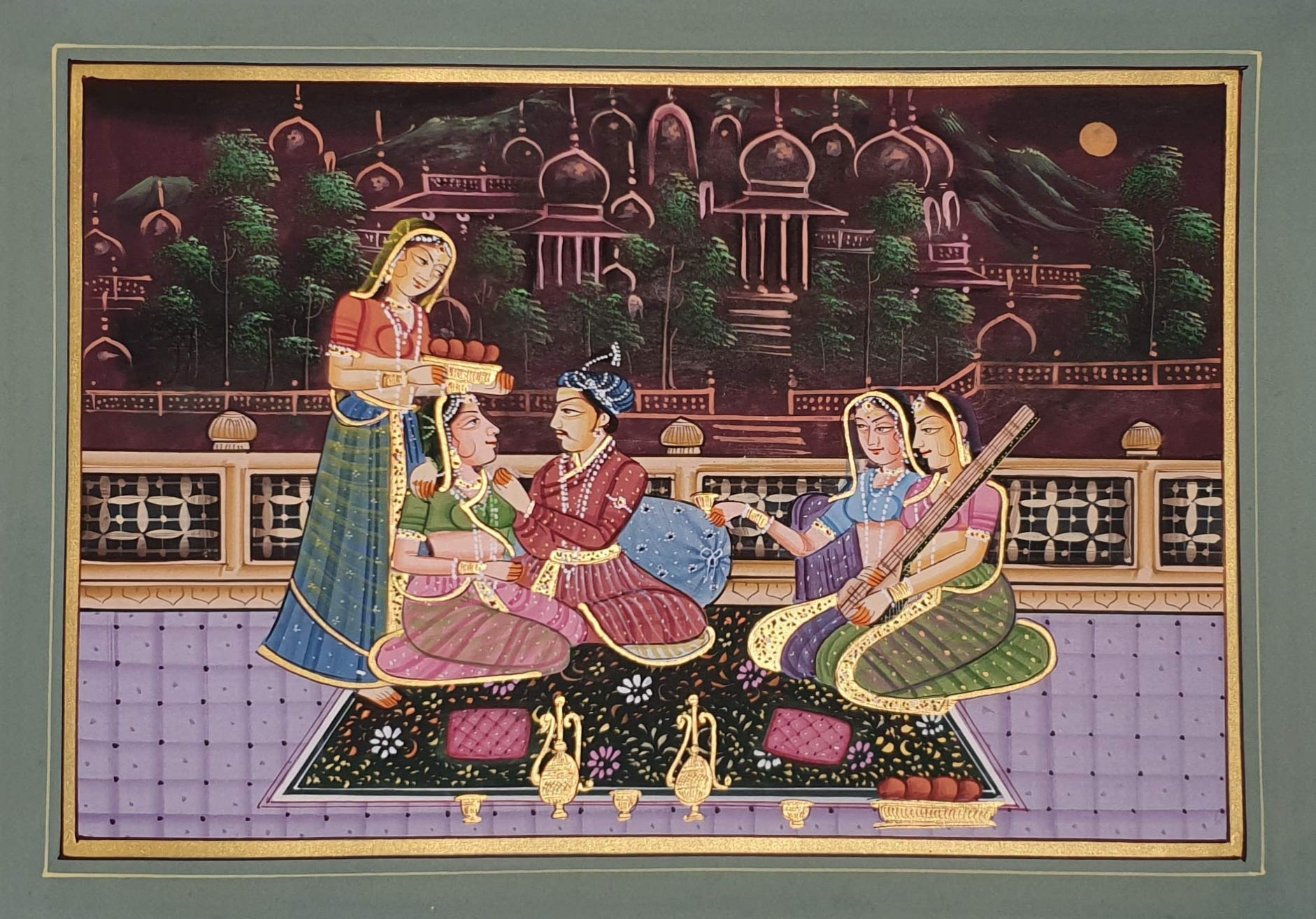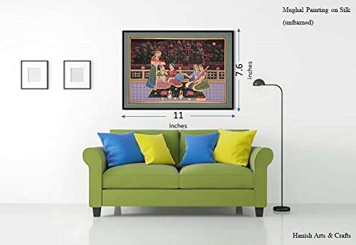 PICHWAI- PAINTED TEMPLE HANGING - Mughal Silk Painting M005 (Handmade Painting - Unframed). Overview a beautiful painting involves the action or skill of using paint in the right manner; hence the end product will be a picture that can speak a thousand words they say. Arts have been in trend for quite some time now. Mughal painting is a style of South Asian miniature painting that developed in the courts of the Mughal Emperors between the 16th and 19th centuries. It emerged from the Persian miniature painting tradition with additional Hindu Buddhist and Jain influences. You can gift this to a family or a friend. The painting has various forms of certain figures on it as seen in the image. You can add a good set of lights to the place where the painting is and the decor will give a different feel and look to the place. Quality and durability the painting has a matte finish.
