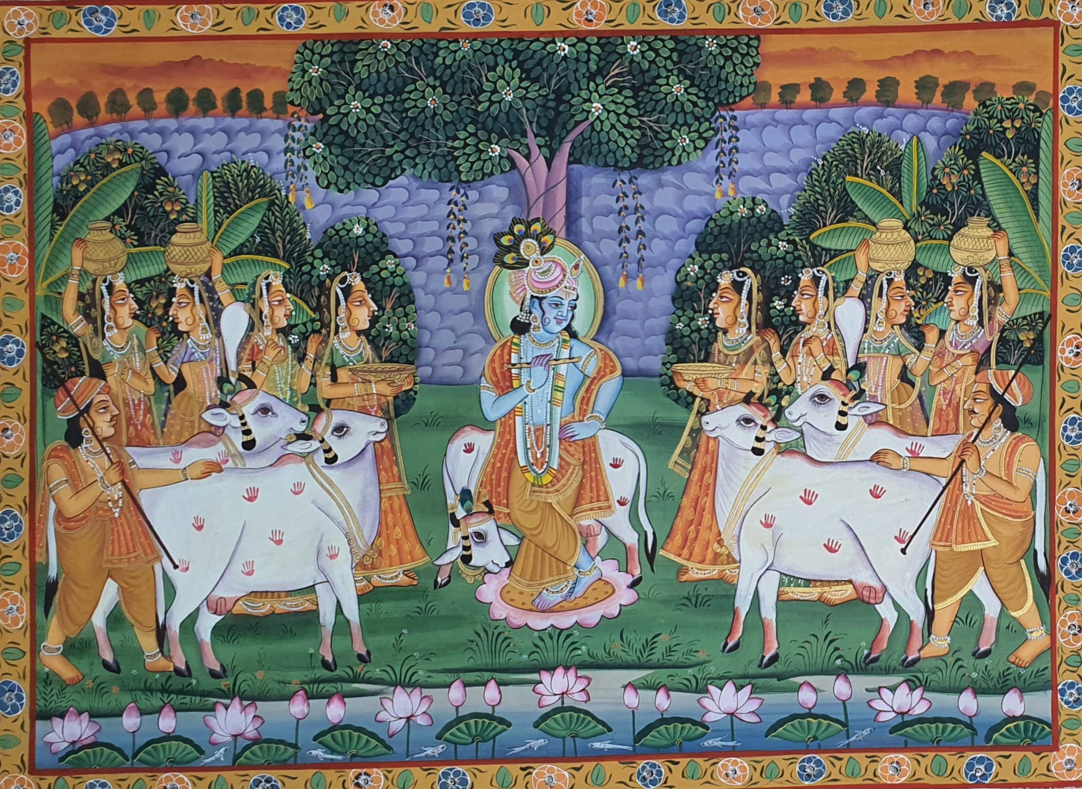 PICHWAI- PAINTED TEMPLE HANGING - Krishna Pichwai (Handmade Painting 33x45 inches) PC3. A beautiful painting involves the action or skill of using paint in the right manner; hence the end product will be a picture that can speak a thousand words they say. Arts have been in trend for quite some time now. Pichwai (pichvai) is a style of painting that originated over 400 years ago in the town of Nathdwara near Udaipur in Rajasthan India. Intricate and visually stunning pichwai paintings made on cloth depict tales from Lord Krishna's life. Pichwai (pichvai) is a style of painting that originated over 400 years ago in the town of Nathdwara near Udaipur in Rajasthan India. ... Lord Krishna is often depicted as Shrinathji in Pichwais which is the deity manifest as a seven-year-old child. You can gift this to a family or a friend. The painting has various forms of certain figures on it as seen in the image. You can add a good set of lights to the place where the painting is and the decor will give a different feel and look to the place. Quality and durability the painting has a matte finish.