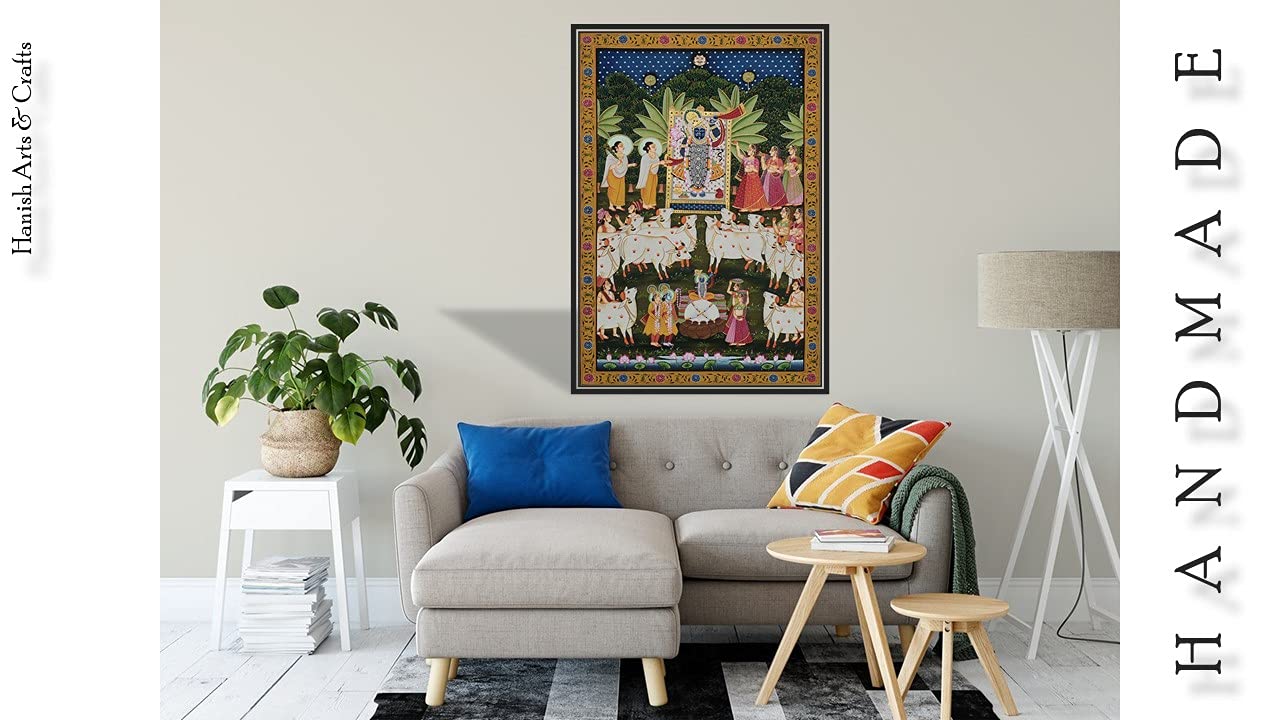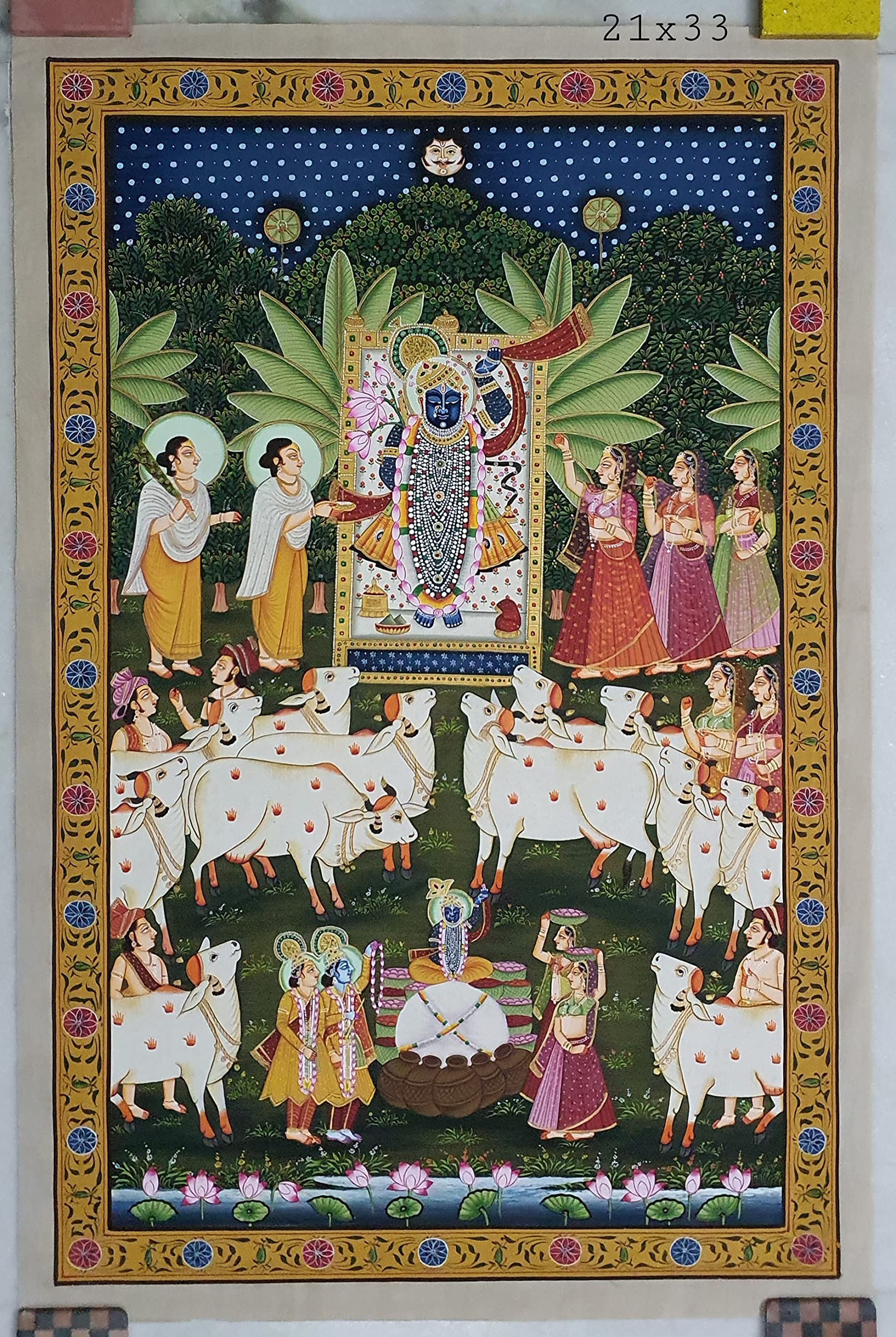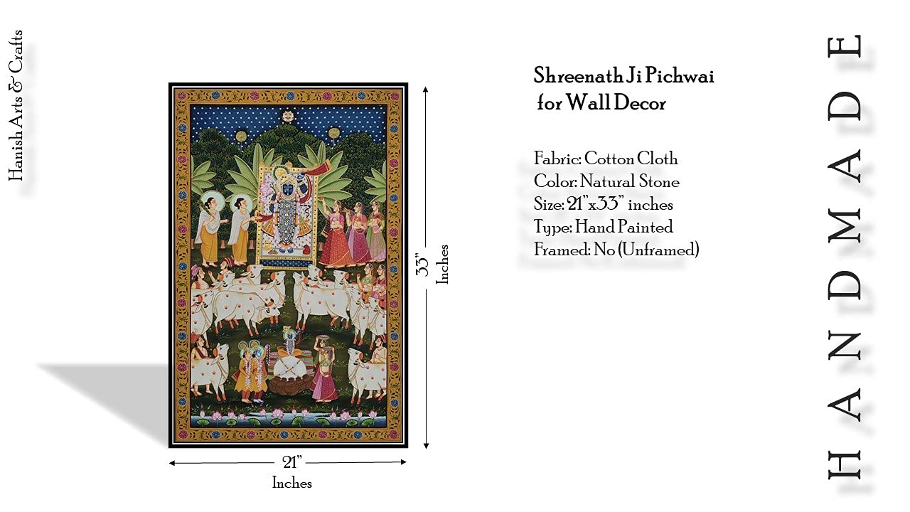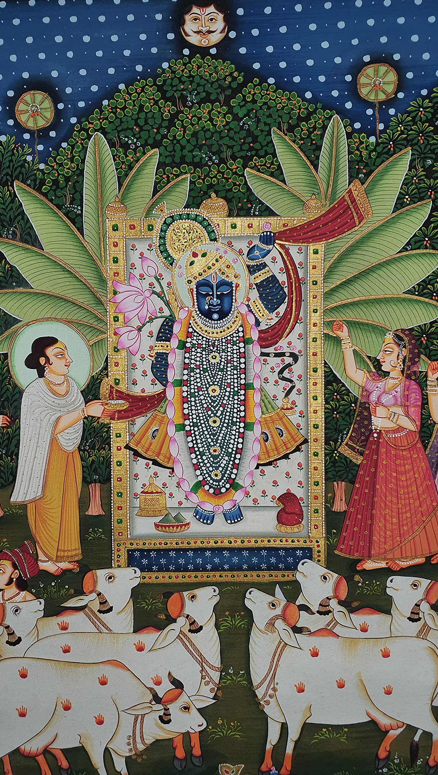 PICHWAI- PAINTED TEMPLE HANGING - Shreenath Ji Pichwai Painting - Hand Painted on Cloth (21x33 inches). overview a beautiful painting involves the action or skill of using paint in the right manner; hence the end product will be a picture that can speak a thousand words they say. Arts have been in trend for quite some time now. It can give different viewer different meanings style and design the saf wood matte abstract painting with frame is quite abstract and mysteriously beautiful. The painting has a nice frame to it. You can gift this to a family or a friend. The painting has various forms of certain figures on it as seen in the image. You can add a good set of lights to the place where the painting is and the decor will give a different feel and look to the place. Quality and durability the painting has a matte finish.