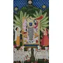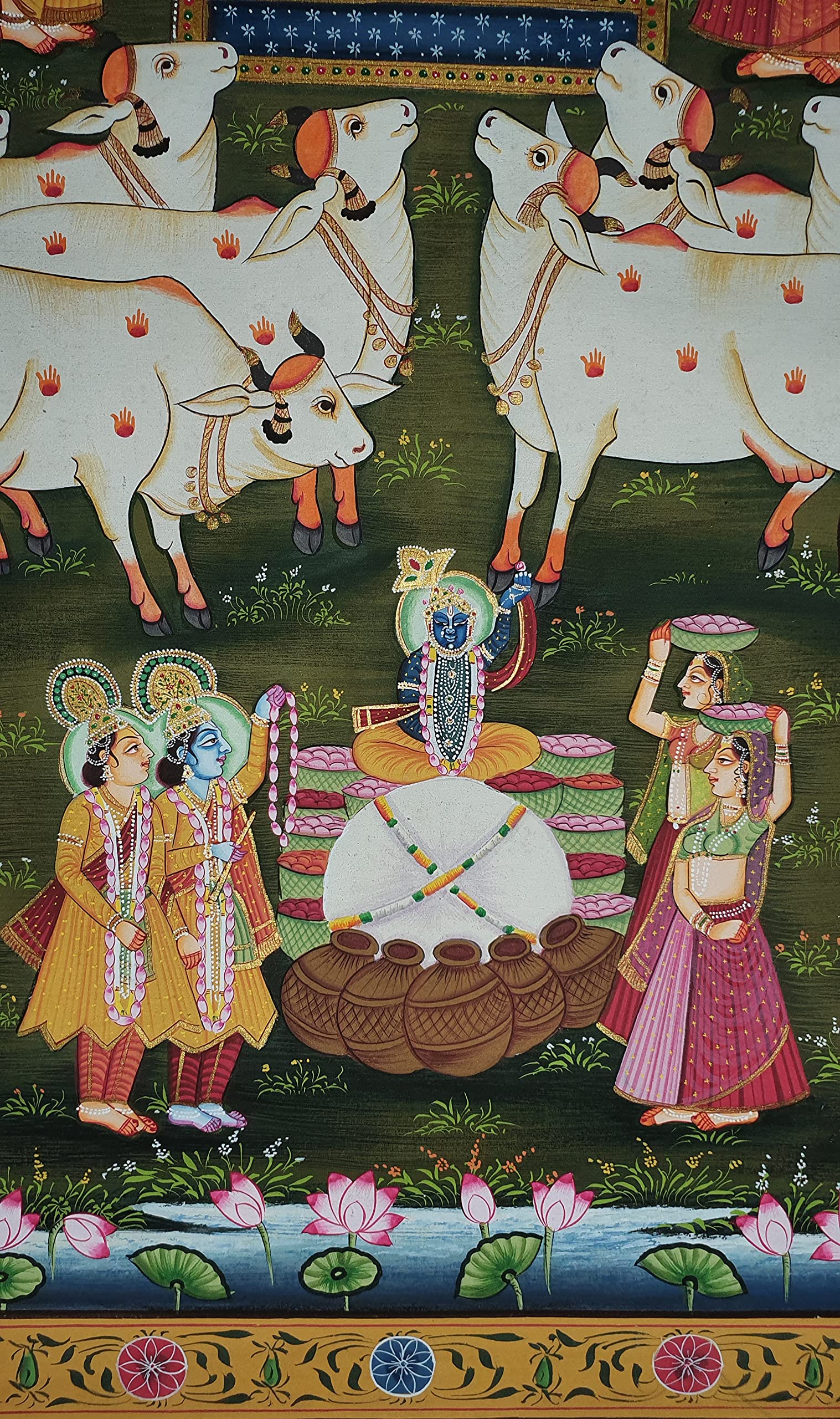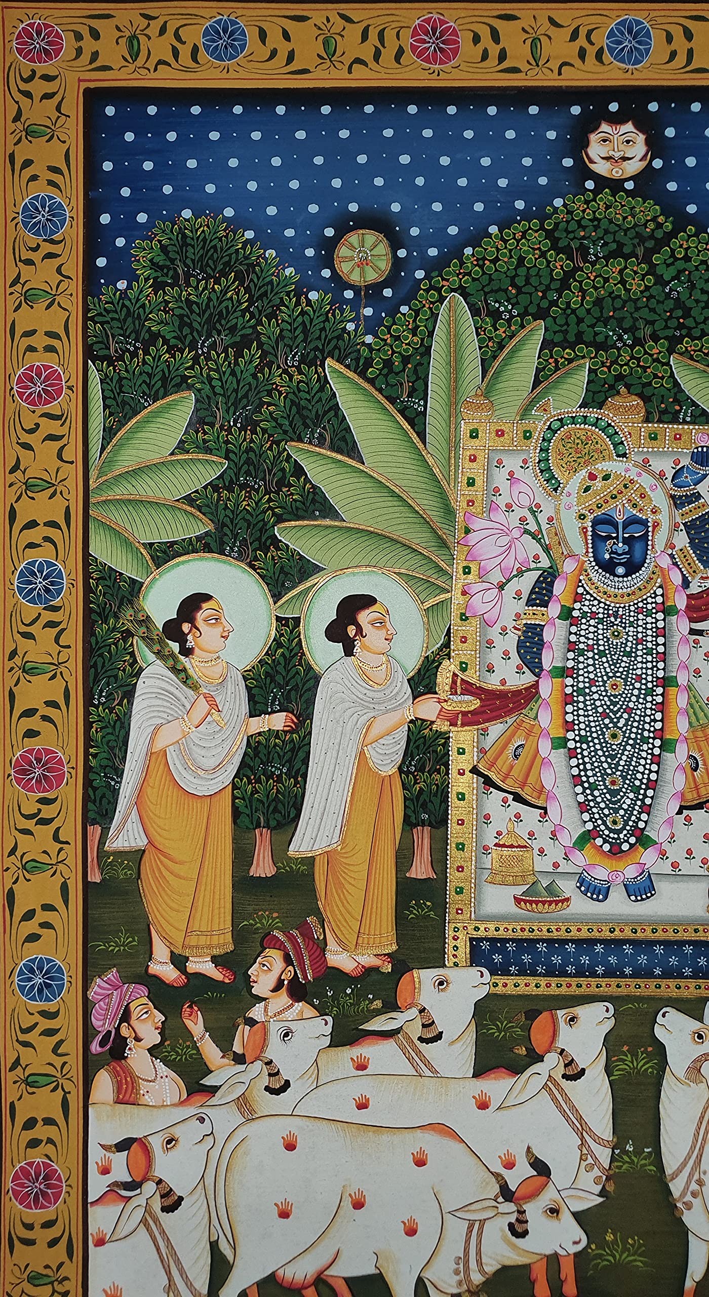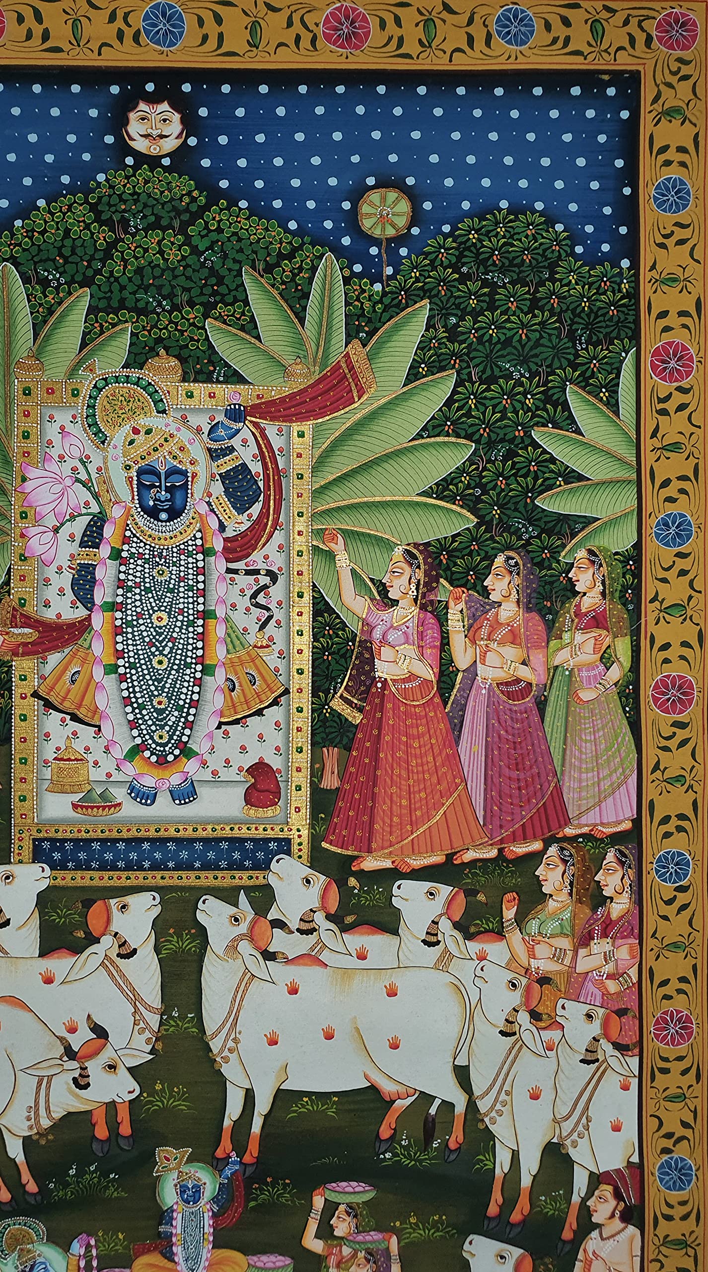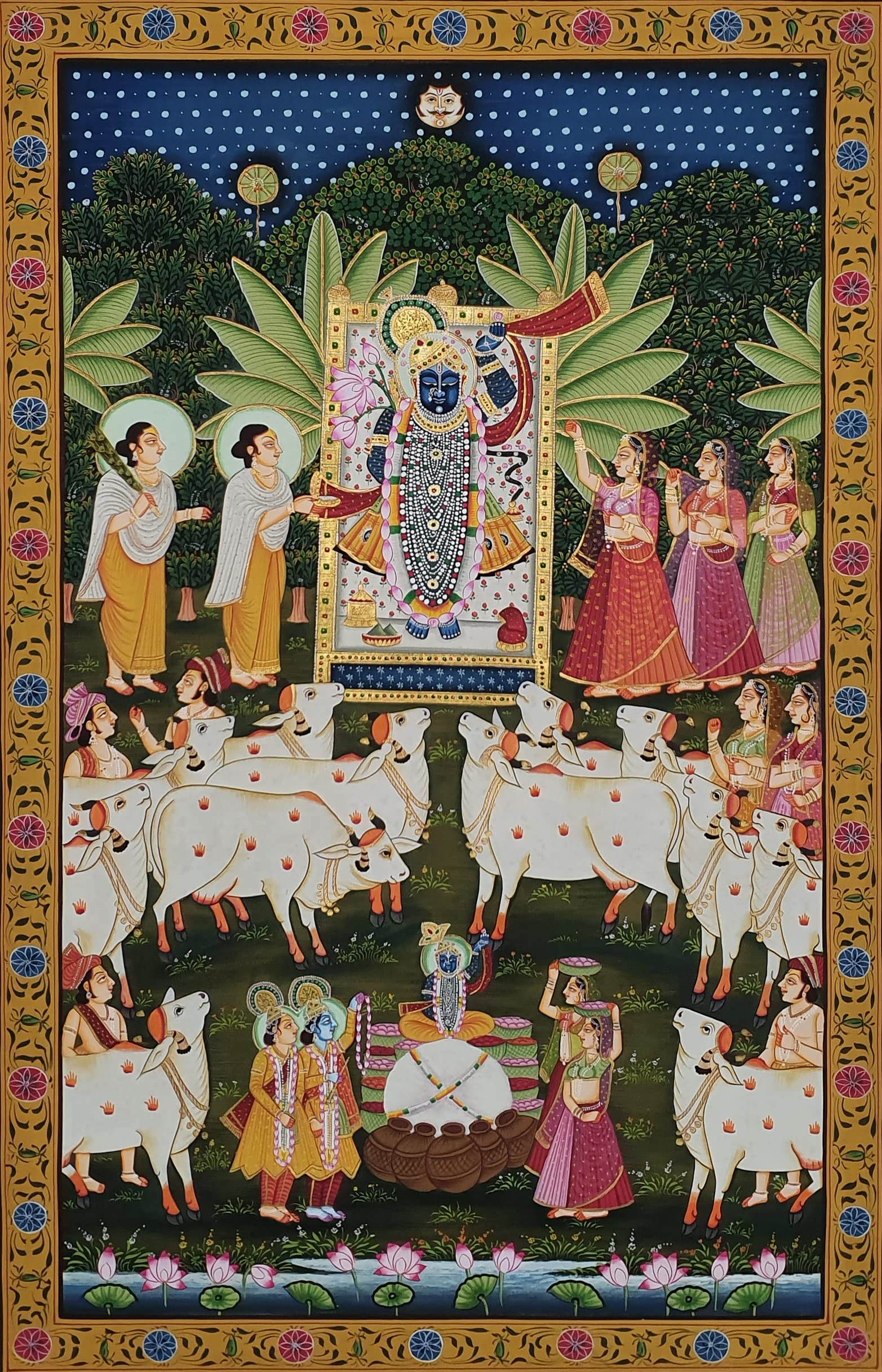 PICHWAI- PAINTED TEMPLE HANGING - Shreenath Ji Pichwai Painting - Hand Painted on Cloth (21x33 inches). overview a beautiful painting involves the action or skill of using paint in the right manner; hence the end product will be a picture that can speak a thousand words they say. Arts have been in trend for quite some time now. It can give different viewer different meanings style and design the saf wood matte abstract painting with frame is quite abstract and mysteriously beautiful. The painting has a nice frame to it. You can gift this to a family or a friend. The painting has various forms of certain figures on it as seen in the image. You can add a good set of lights to the place where the painting is and the decor will give a different feel and look to the place. Quality and durability the painting has a matte finish.