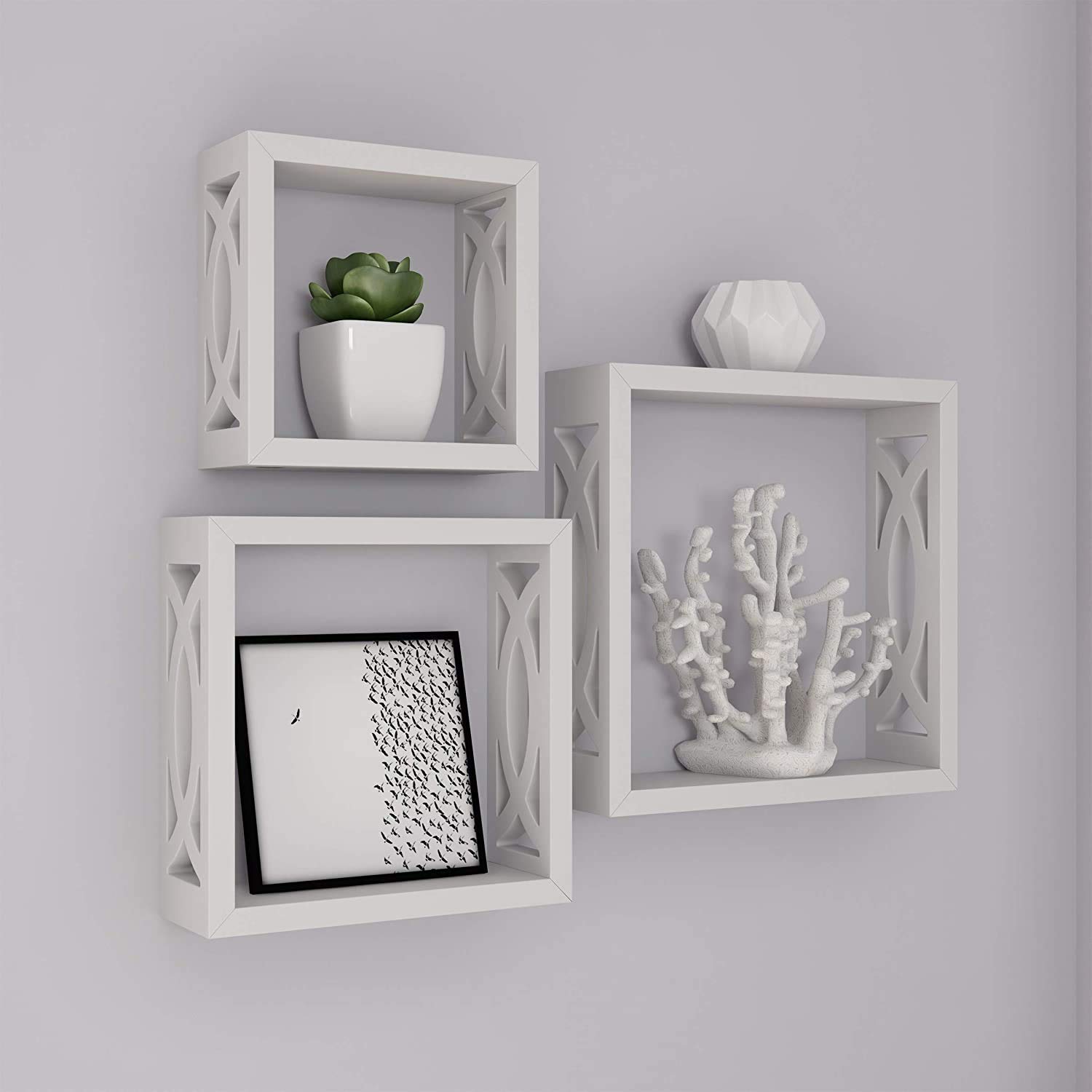 SAHARANPUR HANDICRAFTS decorative nesting wall shelves makes space utilization easy and frame your treasured memories. Creative design and space saving solution for small areas. Hidden perforations secure to nails or screws. Made of high quality wood. With its contemporary lacquered finish they are the ideal accent for any living space. No assembly required.