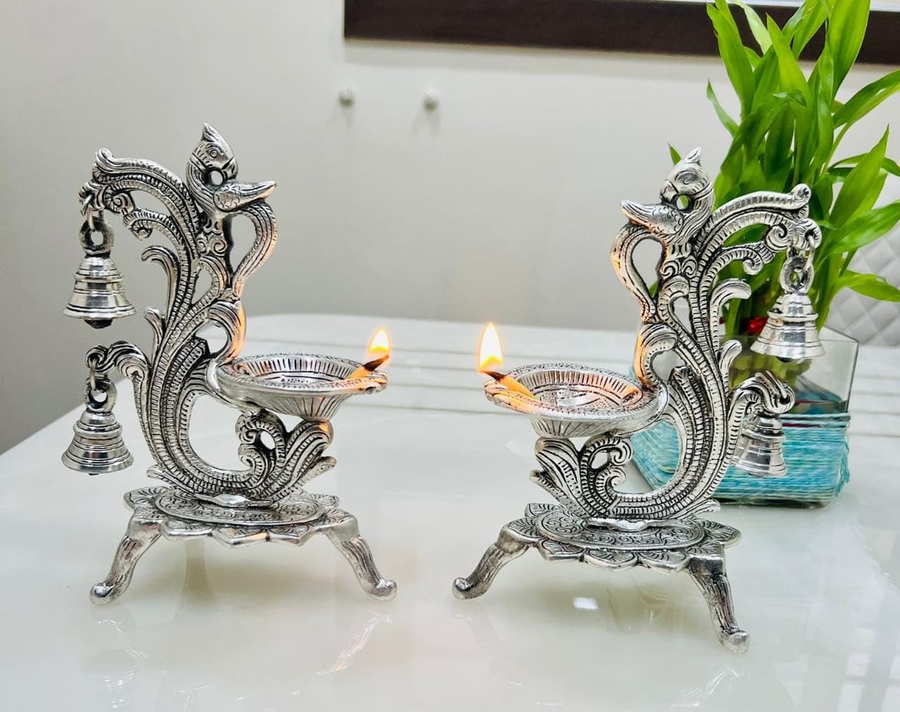 The peacock metal Diya is are designed to complement your home interiors. Based on a stylized peacock design the metal has been treated to form a gold colored base but with a semi precious stone work. Full metallic peacock diya with semi precious stone work. Used as diya in your temple as well is a beautiful decor piece...for your entrance or small nishes of your home.100% Guaranteed will not get black in any weather no matter how you use it German Silver Brass Plated Peacock Samai Diya Diwali Gifts Metal Diya Handmade Indian Pooja Oil Lamp Silver Diya Lamp Akandh 5 Wick Diya Home Decor It is made from German Alloy Metal (Composition of Copper Zinc Nickel); which is finished with silver plating and "oxidized work" on its surface which gives it a "antique look". It has hand made work with beautifully hand crafting on German Alloy Metal. It is made by Metal carving work Rural India artisans who made it an accurate durable and washable product. Light up your home with this beautiful Ganesha Diya. Crafted from a quality German Silver Ganesha Figurine oil lamps add charm to the beauty. People light up these wick lamps for performing aarti of Gods they worship. These are also used as Diwali lights. Made in brass this is a solid piece of collectible figurine sculpture that you would be happy to keep at your home. Gift your loved ones this attractive Diya for special occasions. The premium bell has beautiful sound and is an essential for temple at home. This product is crafted from brass that is considered to be a sacred metal and traditionally used in prayer accessories. The sweet sound of this bell will fill the atmosphere with divine sound during any pooja / ceremony. German Silver Ganesha Samai Diya Diwali Gifts Metal Diya Handmade Indian Pooja Oil Lamp Silver Diya Lamp Akandh Diya Home Decor