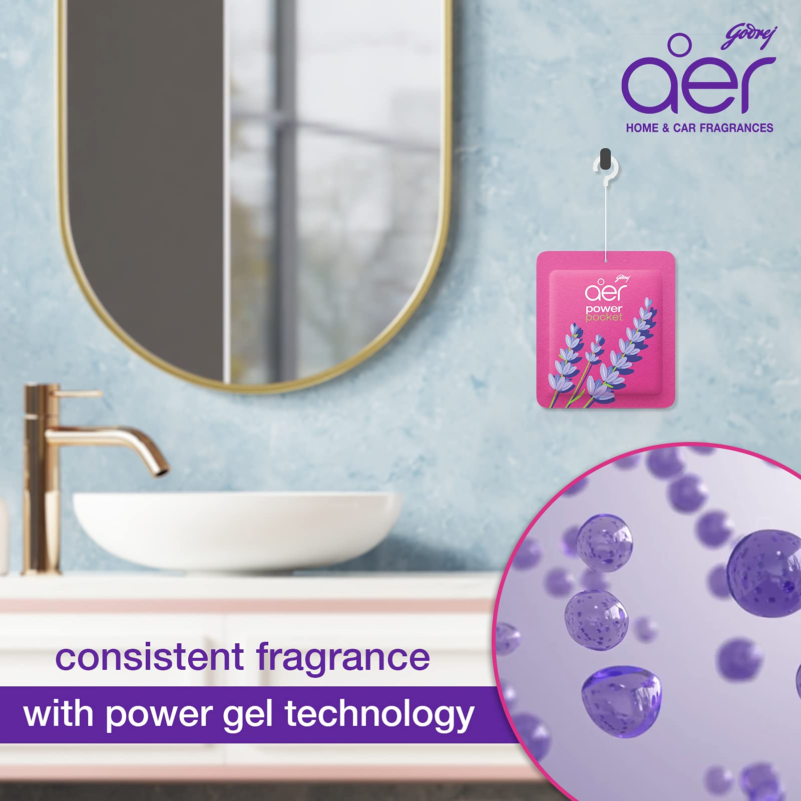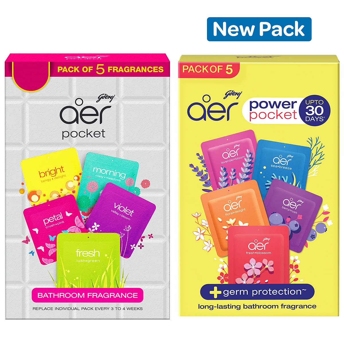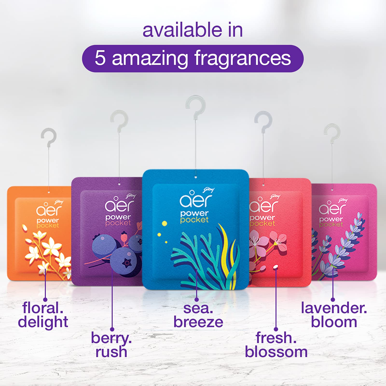 Godrej aer Power Pocket is an assorted Pack of 5 with unique bathroom air fresheners. It contains one unit each of our variants - Lavender Bloom Sea Breeze Fresh Bom Floral Delight and Berry Rush. You can now try them all and choose the one that delights you the most. Godrej aer Power Pocket Say hello to Godrej aer Power Pocket a range of bathroom air freshener available in 5 delightful fragrances. Its unique power gel technology keeps your bathroom fragrant for 3-4 weeks and ensures that its fragrance reaches every corner of your bathroom. It o odour keeg your bathroom fragrant at all times. A must have stock item in your pantry & toilet Godrej aer Power Pocket is so easy to use that you simply have to unwrap the packet and hang it with the hook provided. That's it you are done. Godrej aer Power Pocket works 24x7 without any effort so you can walk-in to a refreshing fragrance every-time you step into your bathroom.