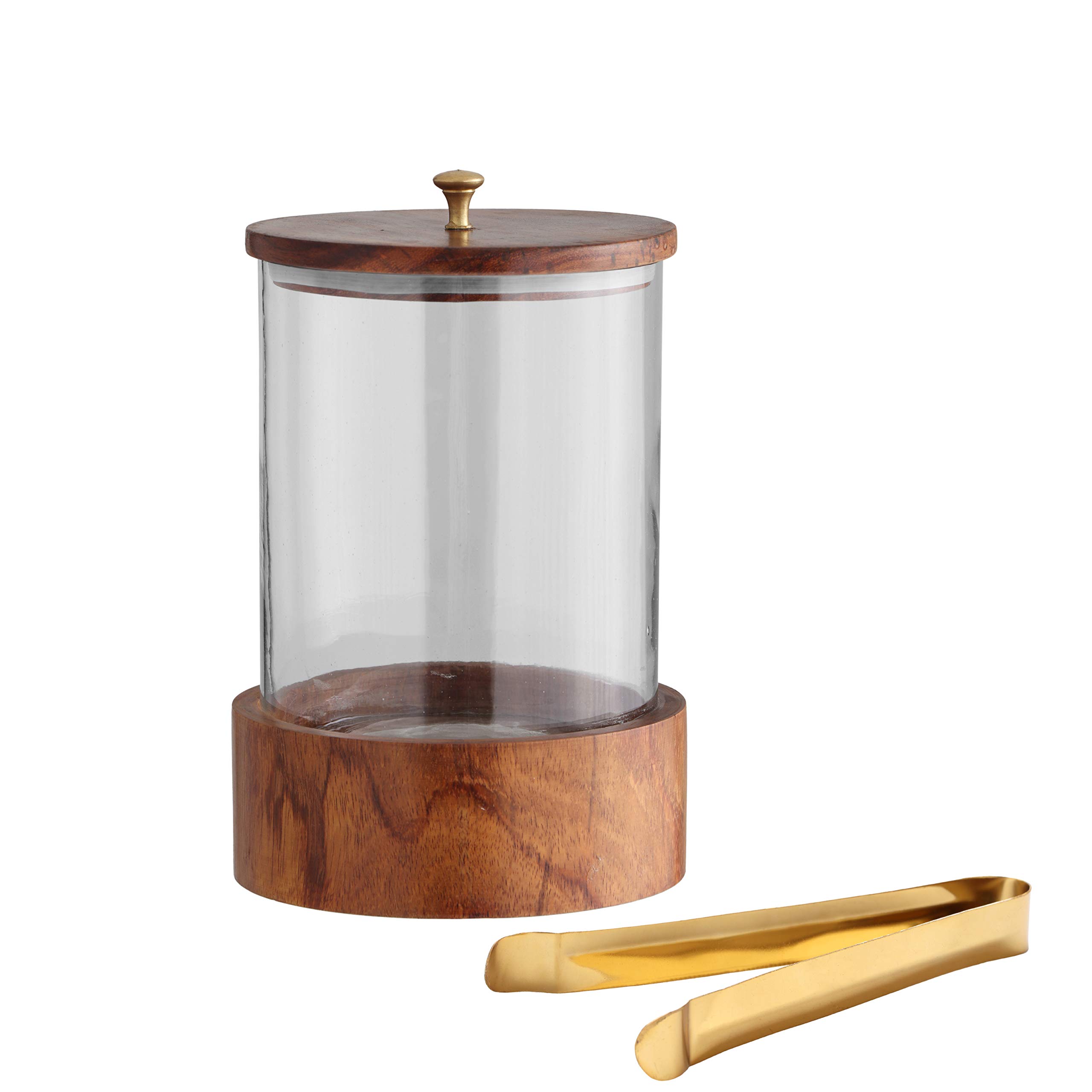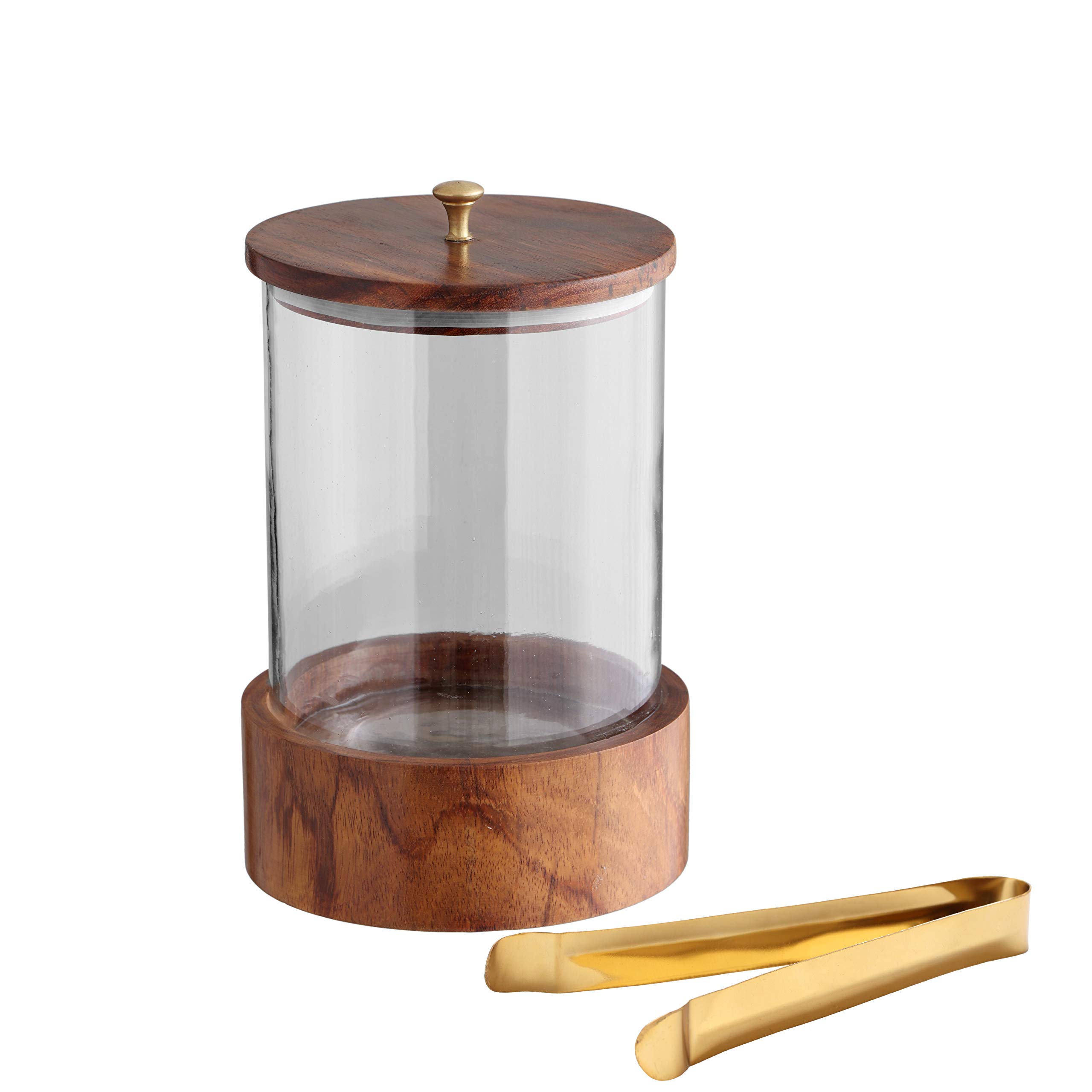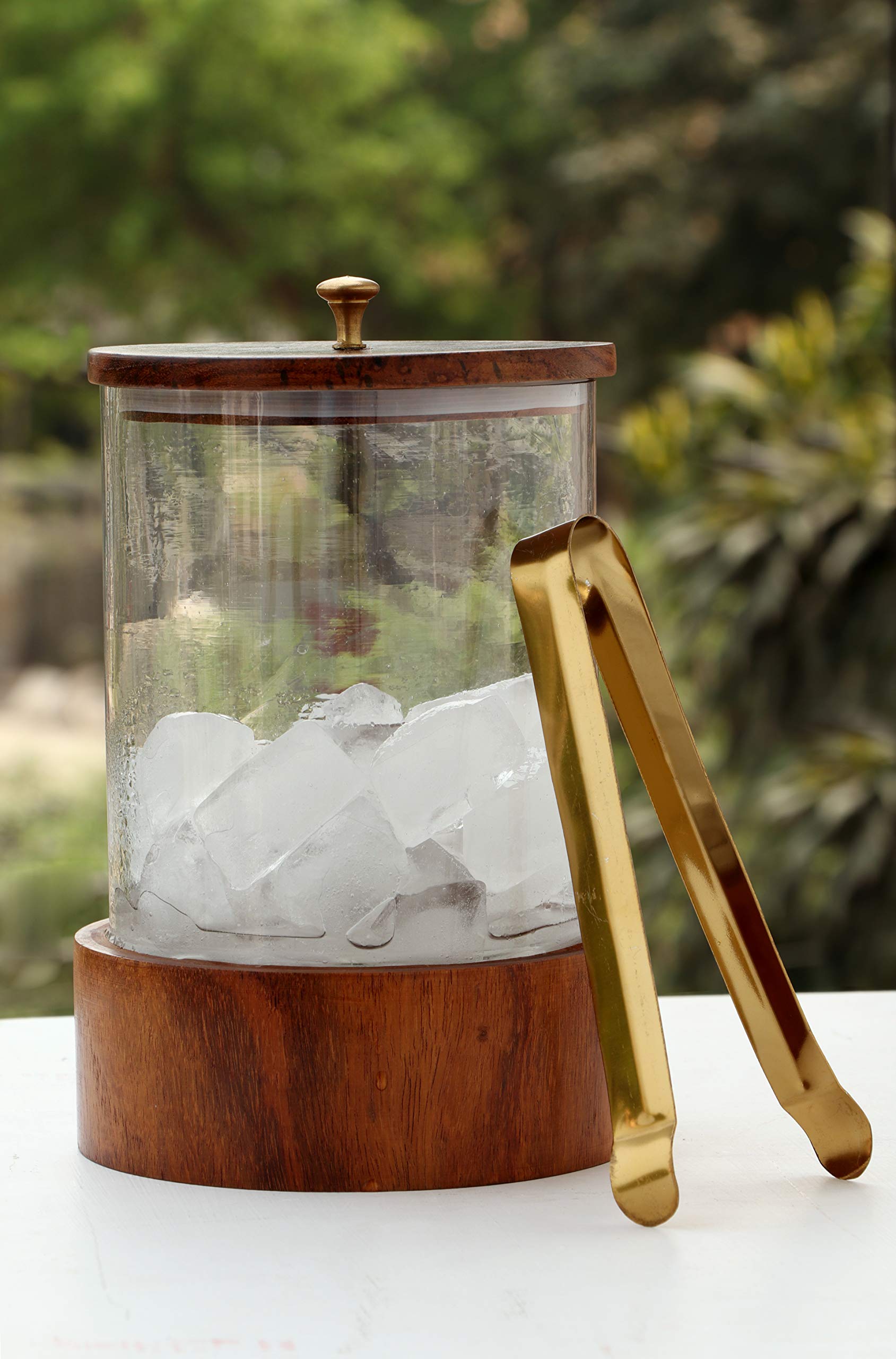 This hand made Wood and glass ice bucket will add a style to your bar ware this ice bucket has a modern design on it that create a distinctive visual appeal. It's a perfect accessory to a well-stocked bar. It is also available in large size. Made from Sheesham Wood making them highly attractive and unique. it comes with a stainless steel golden tong and an airtight lid.