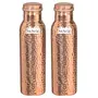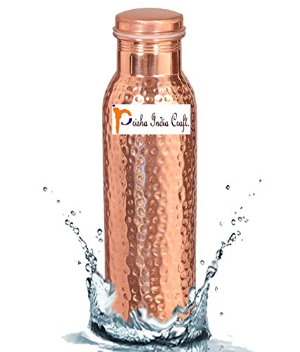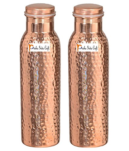 Features: prisha india craft pure copper bottle hammered design set of 2 color: copper material: copper botle weight: aprox 300 gram height: 8.00" inch width/diameter: 3.00" inch length: 8.00 inch capacity: 900 ml