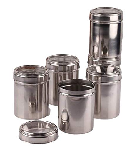 Set of 6 See through canister diameter size 10 each; 6 piece set of canisters / kitchen storage made up of stainless steel, is very high quality, extremely durable and rust free. Having mirror at the top helps to see through the items easily without opening the same. 1000 ml each