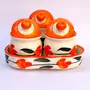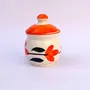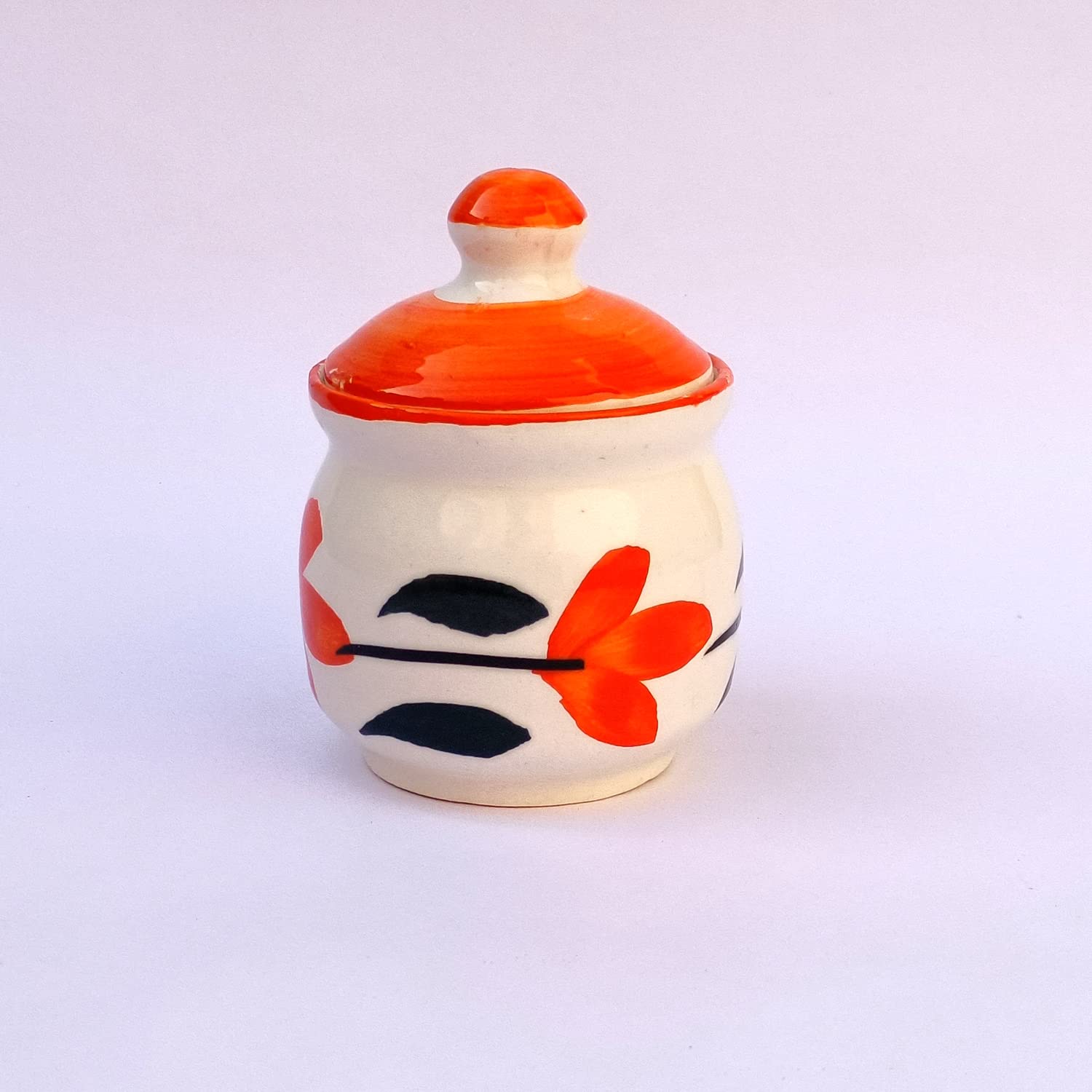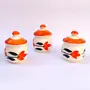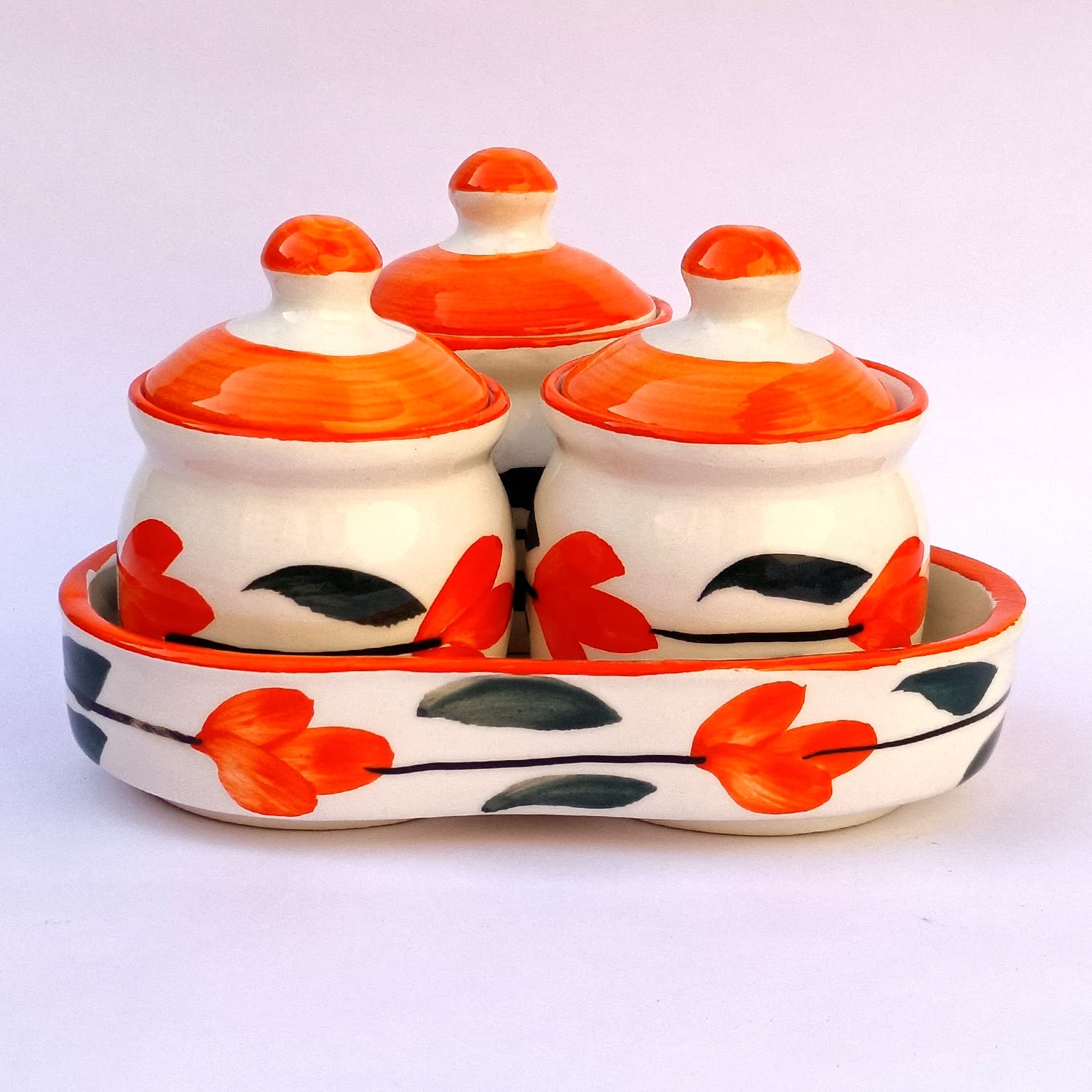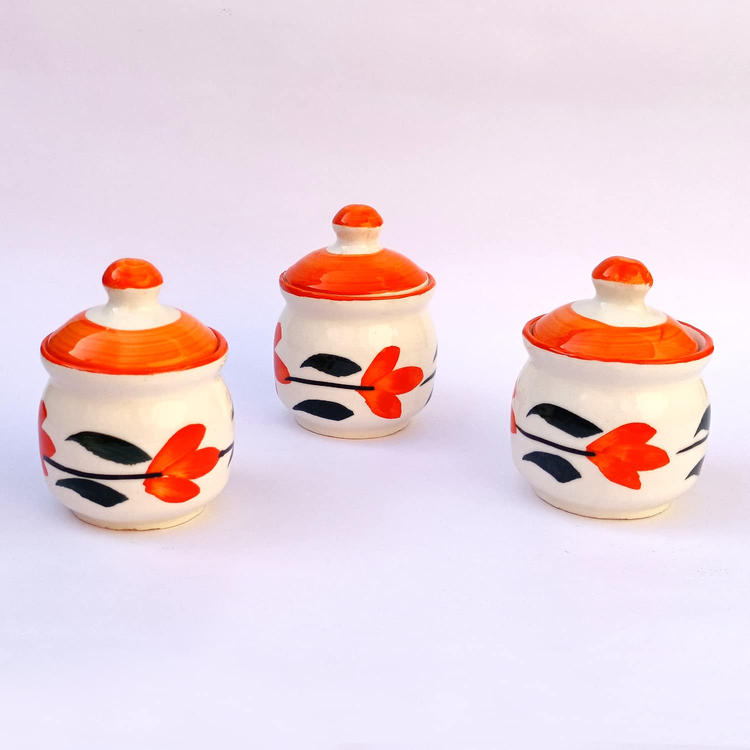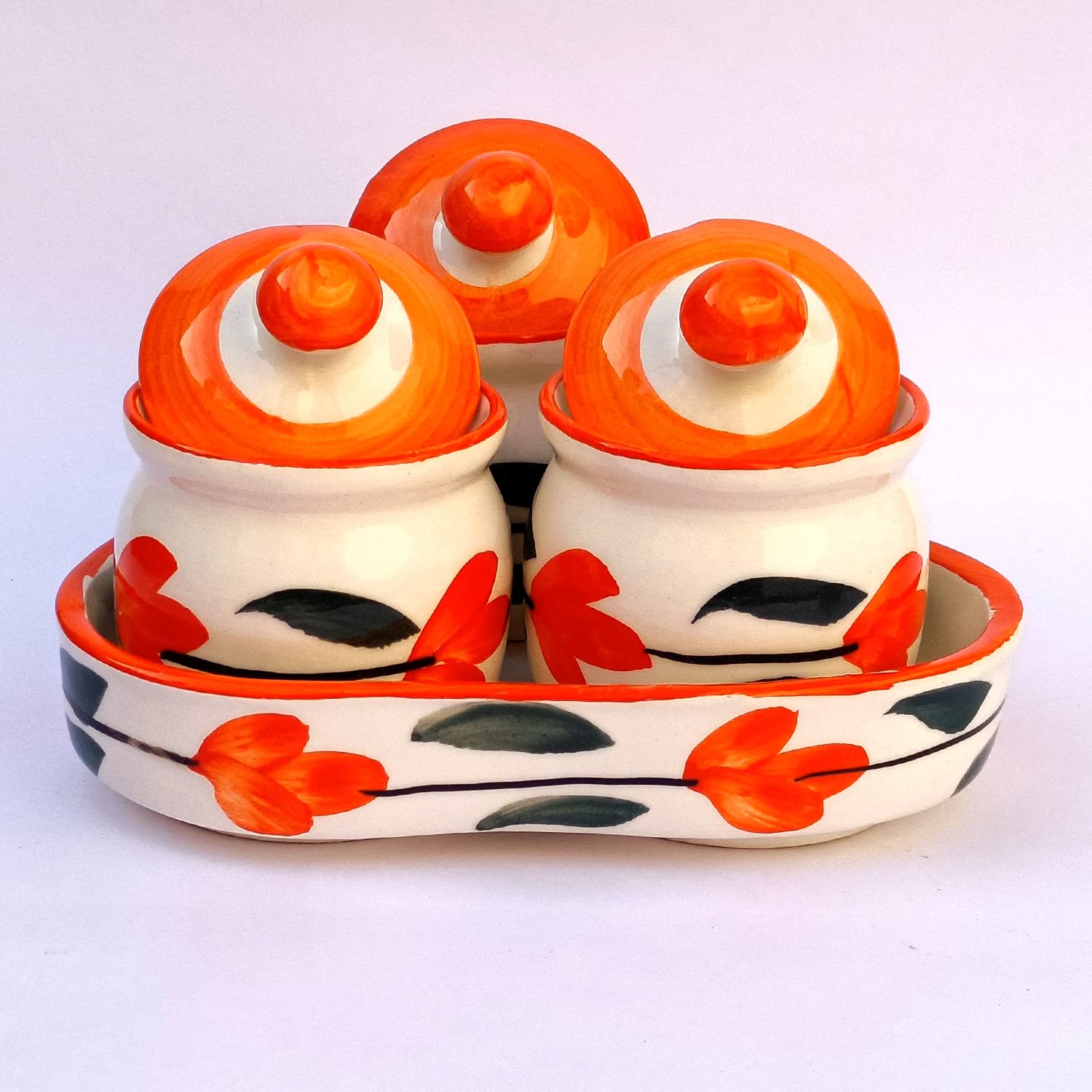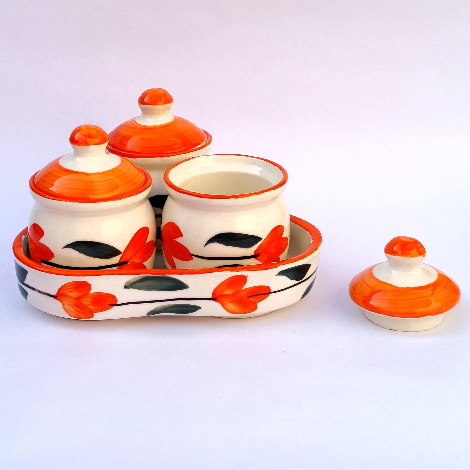 KHURJA POTTERY Pickle Jar Storage Masala Container Aachar Chutney Serving Canister Condiment Set with Tray for Dining Table (Set of 3 Orange Flower) Microwave and Dishwasher Safe