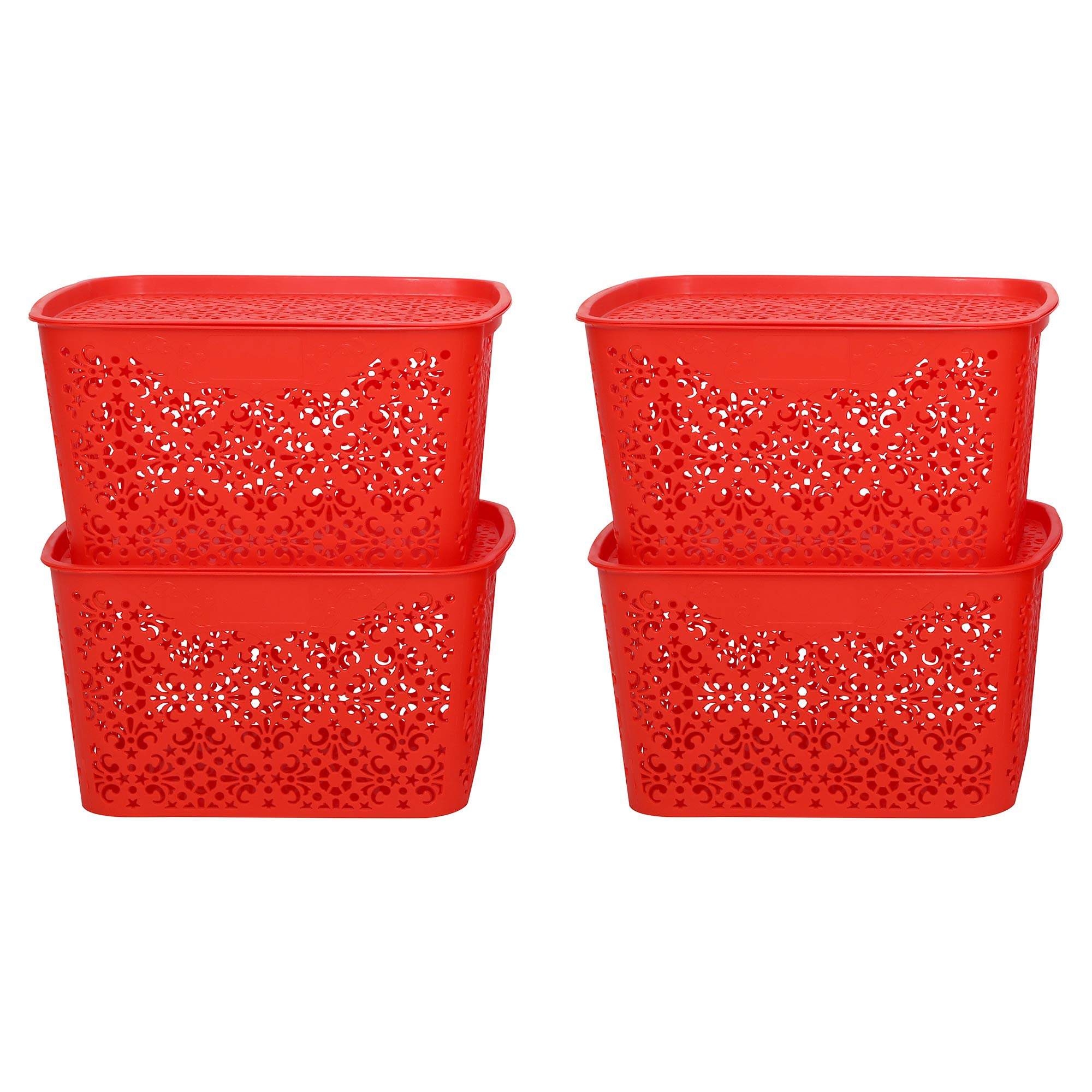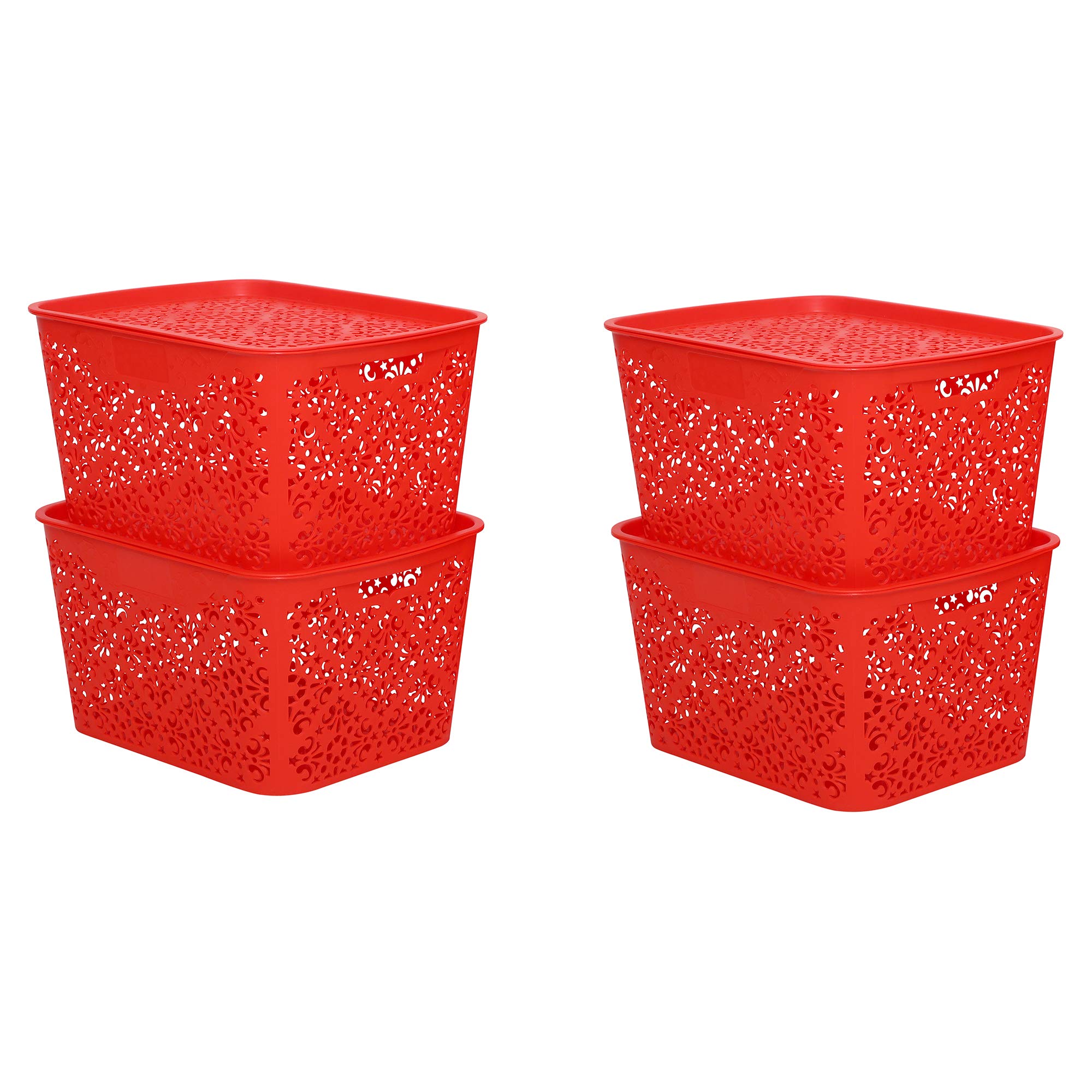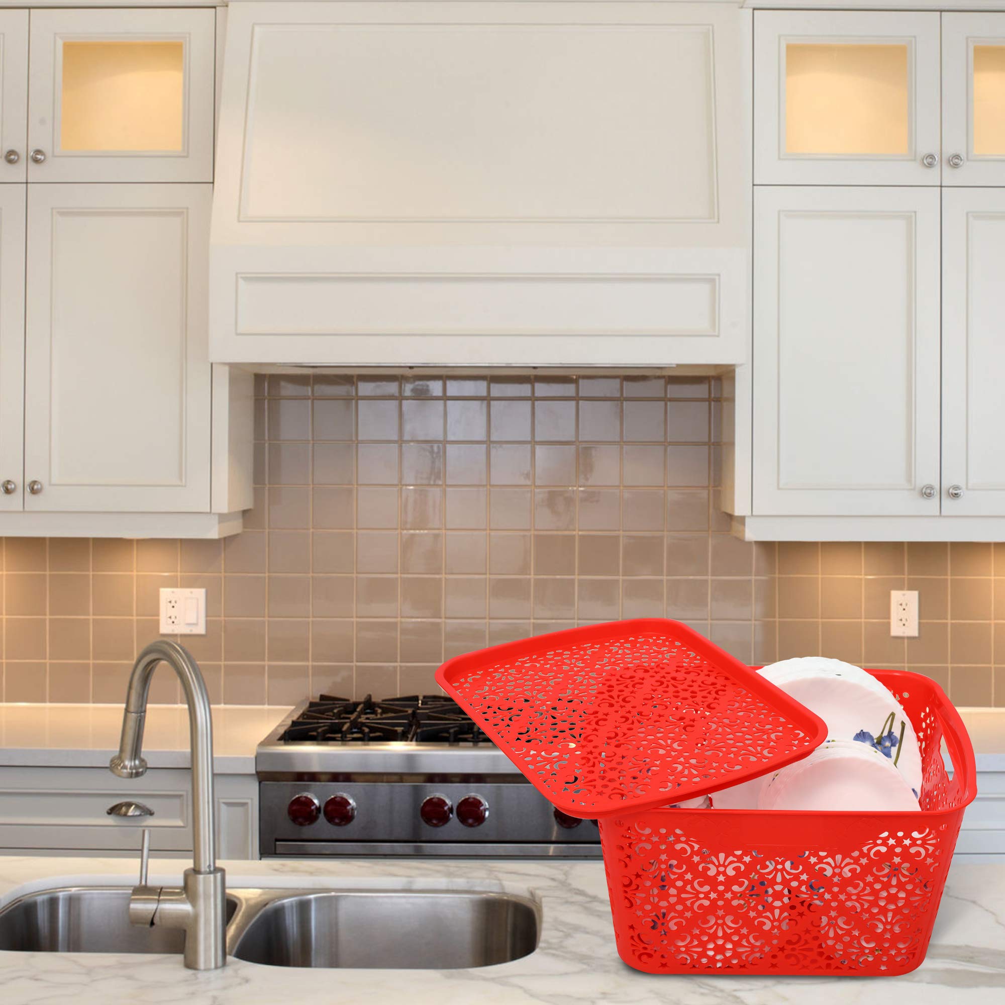 HomeKitchenContainersJars & ContainersCutting EDGE Unbreakable Plastic Turkish Baskets Large with Lid for Storage Baskets For Fruit Vegetable Bathroom Stationary Home Basket with Handle - Red, Set of 4