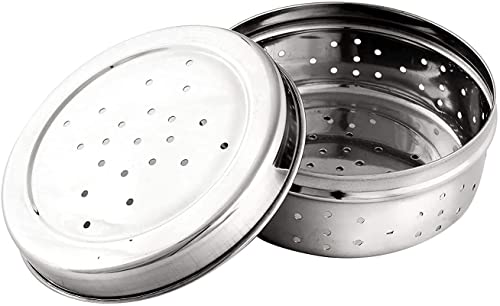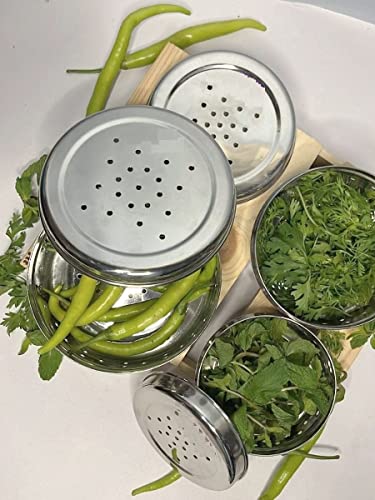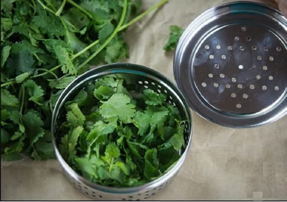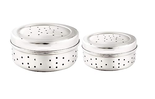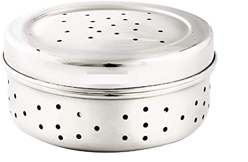 This container is widely used for storing & preserving coriander curry leaves chilly & other leafy vegetables fresh Perfect sized holes allow sufficient air passage & keeps vegetables nourished for a long time The dabba is polished & made from the highest quality of stainless steel. It is dishwasher safe A necessary item for every kitchen Product Dimension-12.5x12.5x5.5 cm 14x14x6.5 cm Set of 2 Kothmir Dabba