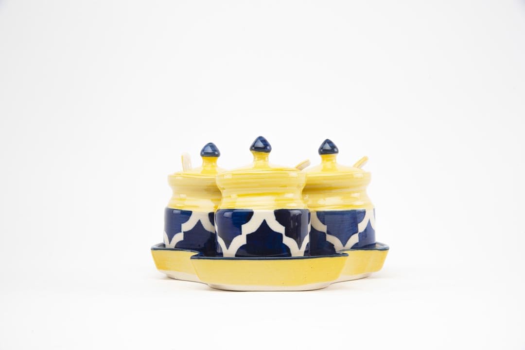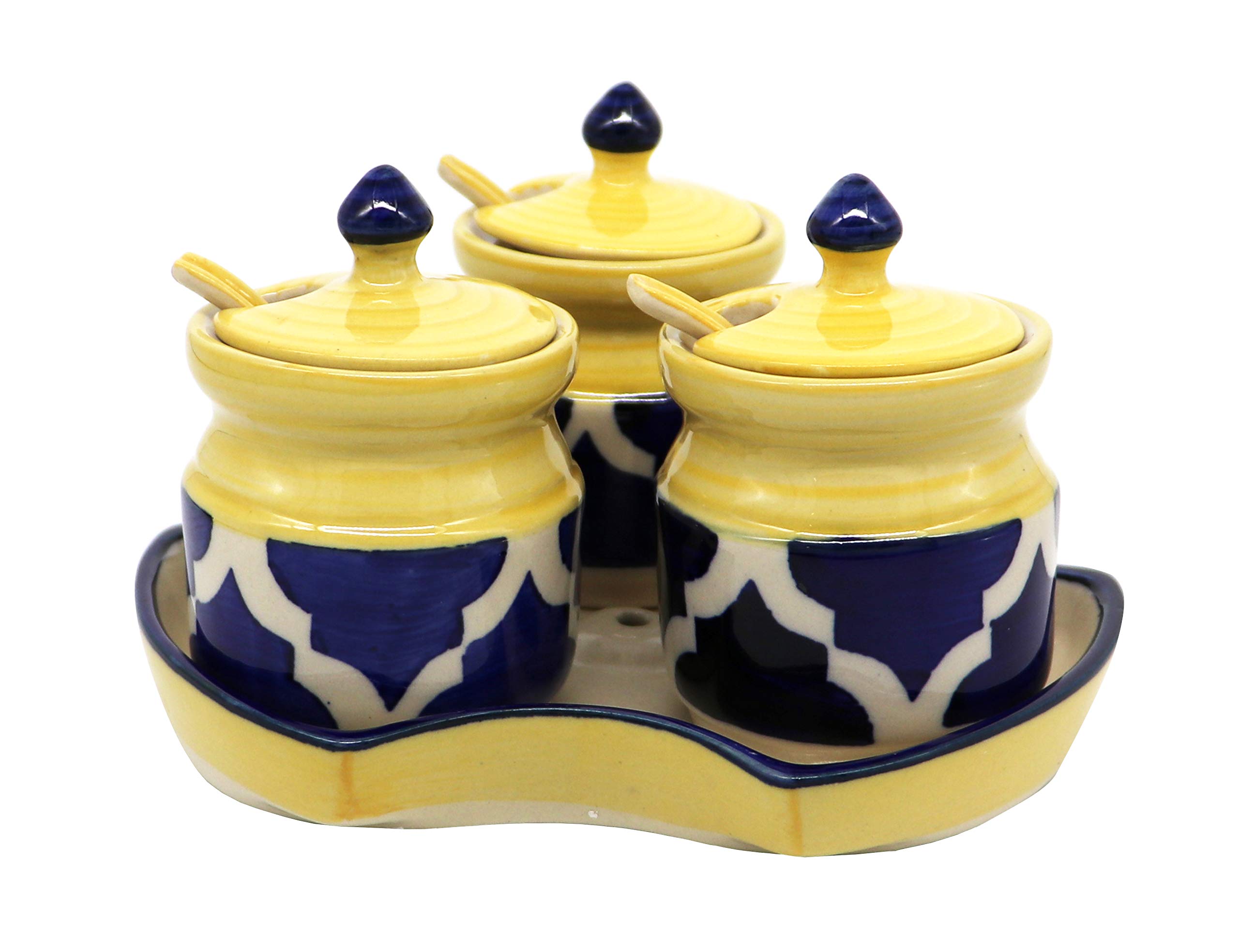 HomeKitchenServeware setsSpoonsKHURJA POTTERY Blue & Yellow Ceramic Hand Painted Table Top Jars Set (3 Jars with 3 lids 1 tray with 3 spoons) for Kitchen/Dinning Table/Chatni/Spices/Storage 140 ml each