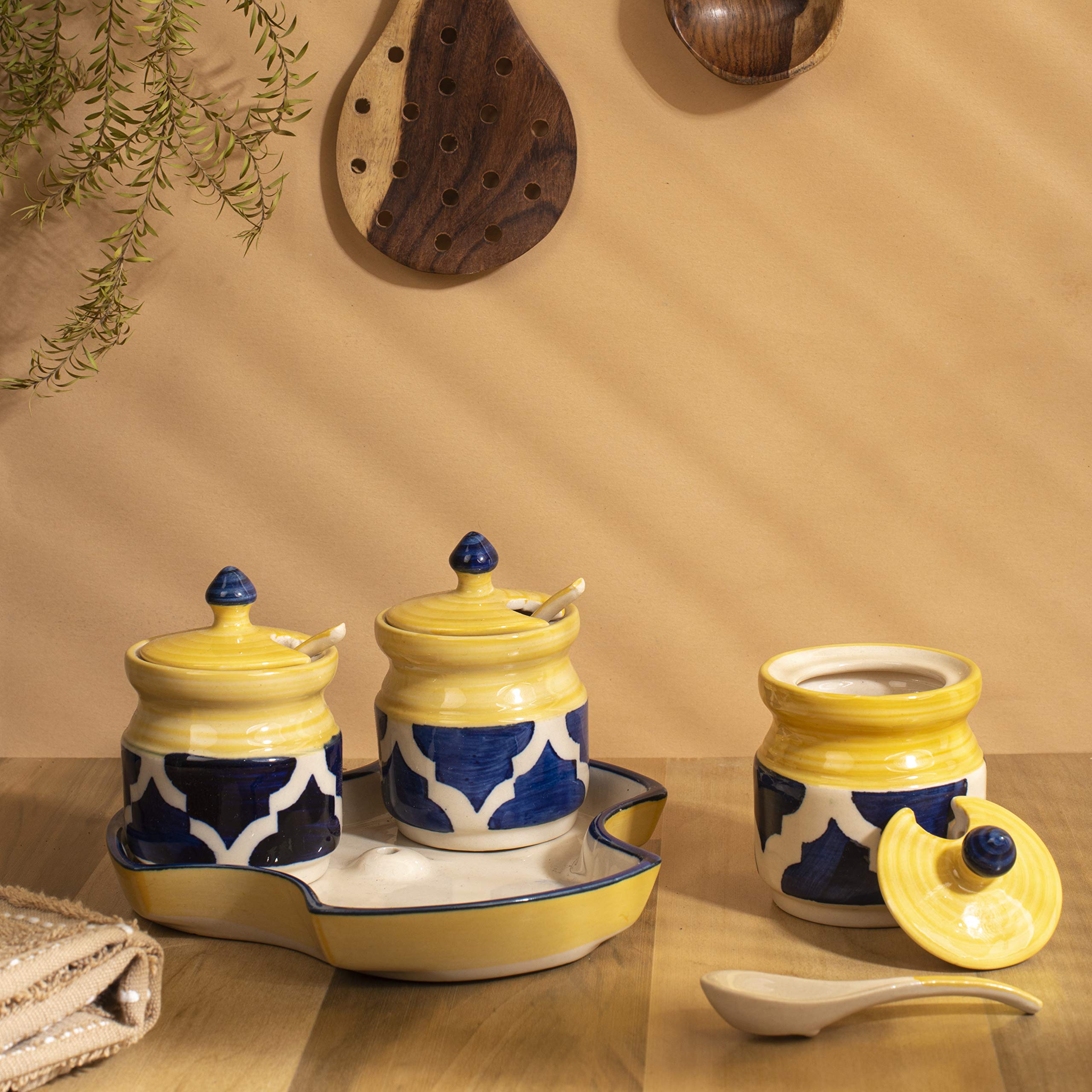 KHURJA POTTERY Blue & Yellow Ceramic Hand Painted Table Top Jars Set (3 Jars with 3 lids 1 tray with 3 spoons) for Kitchen/Dinning Table/Chatni/Spices/Storage 140 ml each