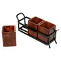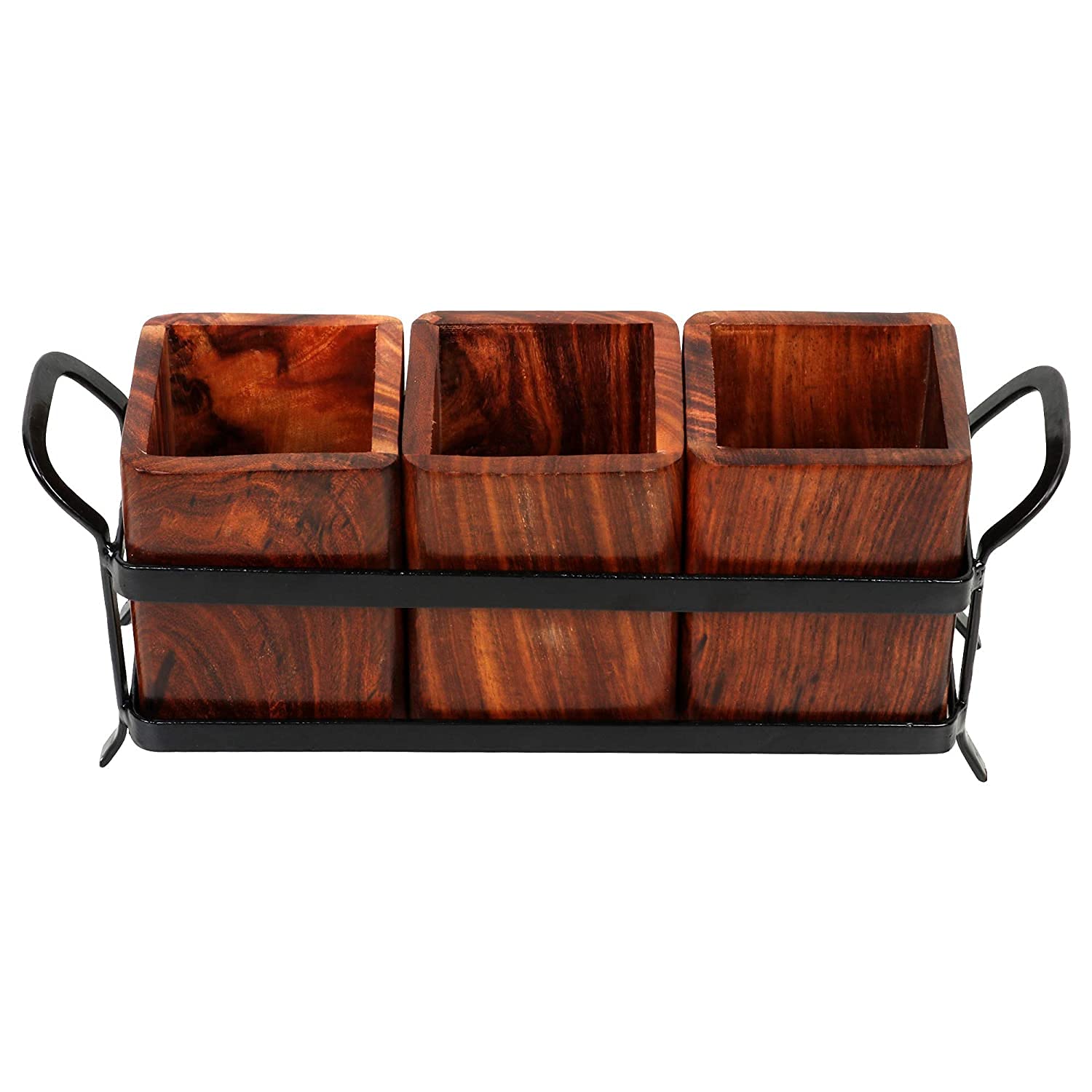 HomeKitchenContainersJars & ContainersSAHARANPUR HANDICRAFTS Wooden Kitchen & Dining Holder for Dining Table with 3 Wooden Jar & Sheesham Wood One Wrought Iron Stand (Black and Brown)