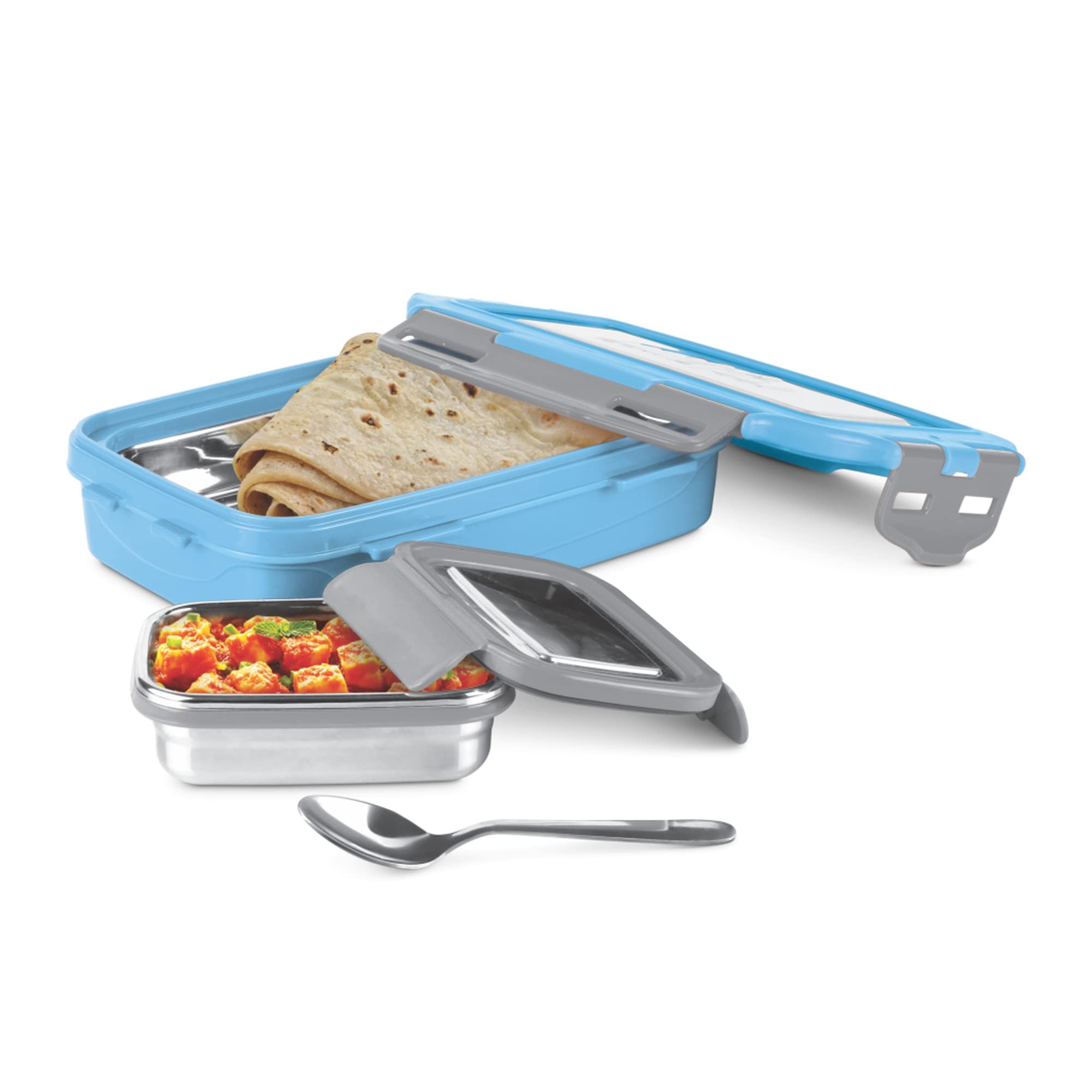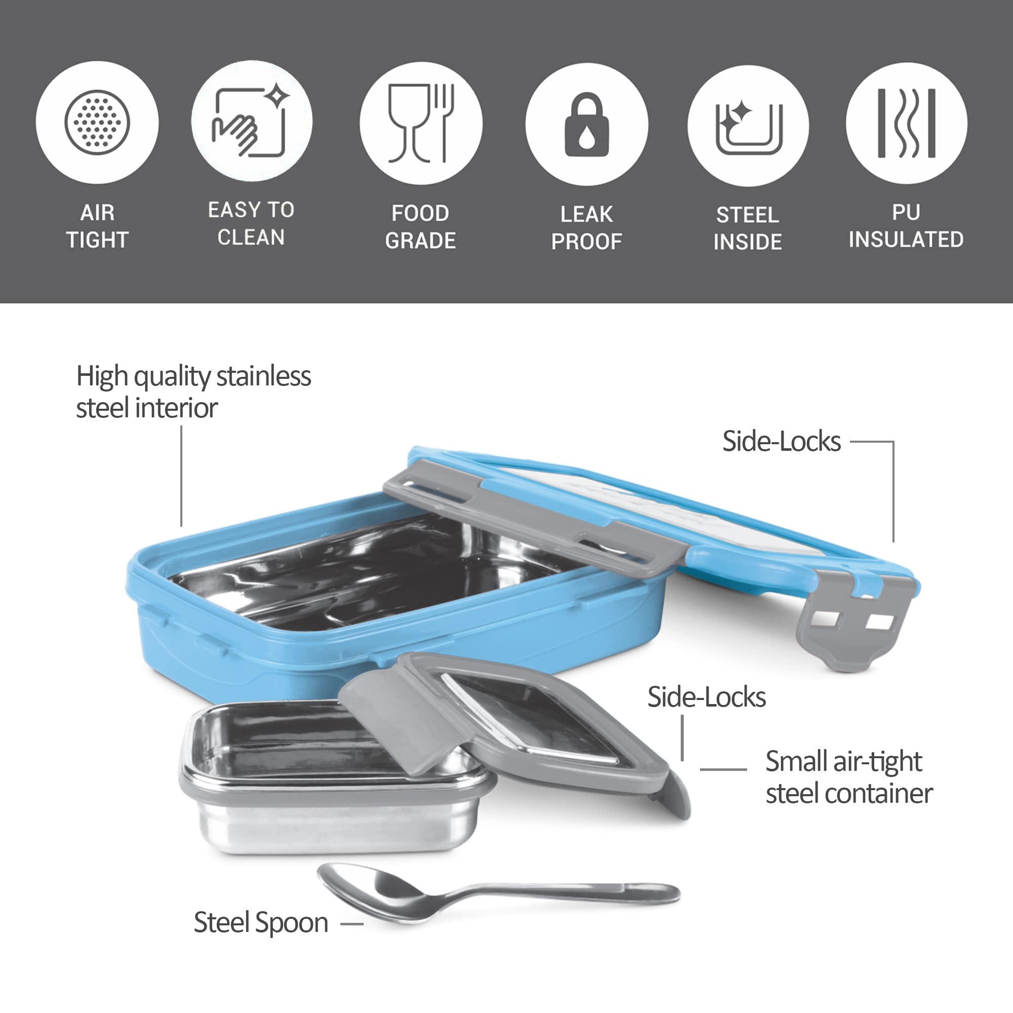 The all new Steely Super Deluxe is a perfectly sized lunchbox for every use at office. It is an insulated tiffin with top steel lid and side locks that comes with a high-quality stainless steel interior a small leakproof steel container inside for gravy and curry and a steel spoon. It keeps your food hot for hours. The sleek design of the tiffin makes it easy to fit in the bag without occupying more space. Perfect to carry at school office while travelling camping picnics. This Product Is Under 1 Year Warranty From The Date Of Retail Purchase Against Any Manufacturing Defects In Material And Workmanship. The Warranty Does Not Cover Damages Resulting From Accidents Mishandling Or Tampering With The Mechanism. Warranty Valid Against Producing Original Bill Endorsed By Seller.