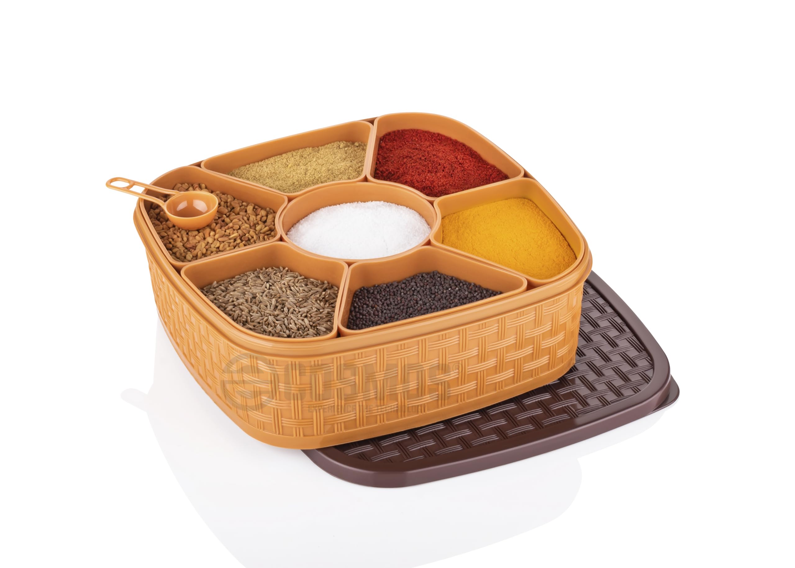 HomeKitchenContainersSpice BoxesE-COSMOS Plastic Square 7 Sections Multipurpose Masala Rangoli Dabba Box Set Spice Box Set - Brown (Masala Box - 7 in 1)