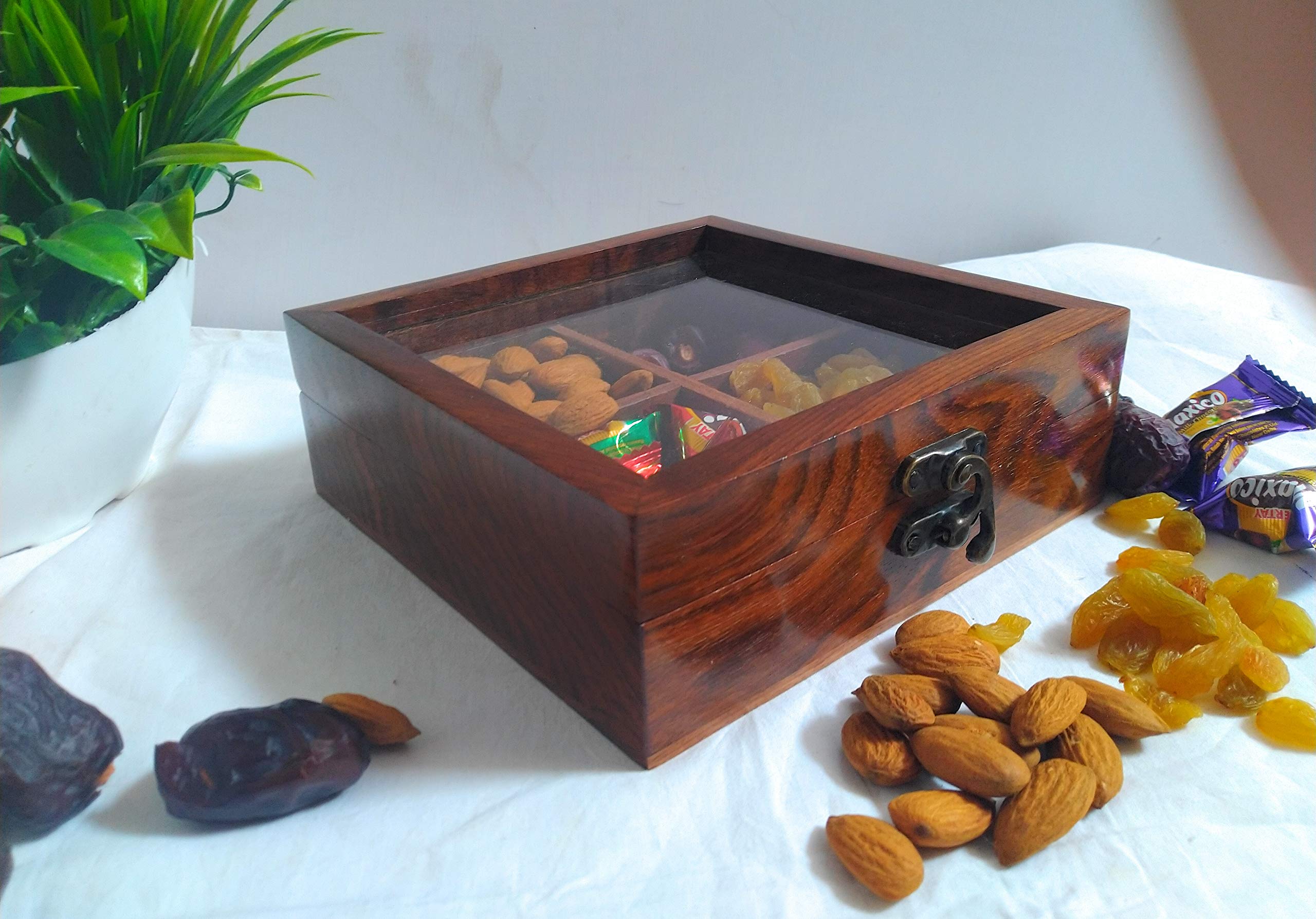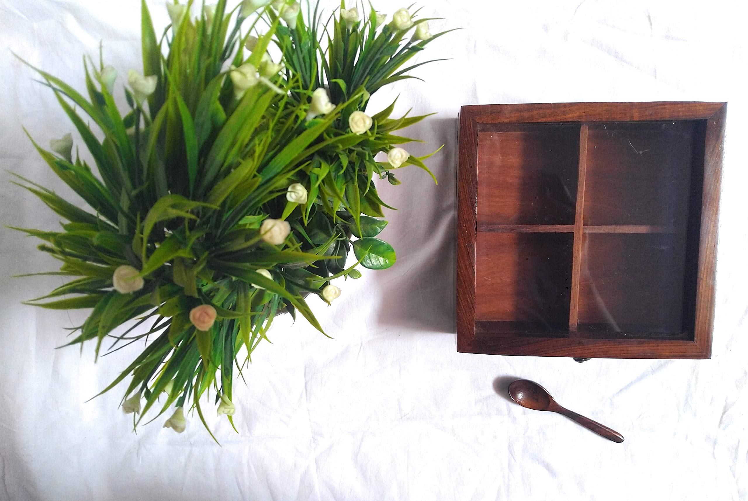 Wooden dryfruit box for keeping dryfruits. This box can be used for gifting purpose or as a masala box. Lid is not glass its imported high quality malaysian fibre so no issue of broken. Totally made by hand by expert local artisians free wooden spoon.