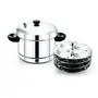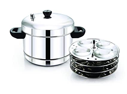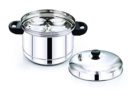 Dynore brings to you the newest offering from our cookware range.This IDLI cooker is made with food grade stainless steel. This makes the cooker extremely safe for use as it prevents leaching of the inner surface into your food. Stainless Steel body gives extra durability and strength to this cooker.This Idli cooker has especially designed whistle to release extra steam from the body.This light weight belly shape tope set is designed with flat bottom base that helps distribute heat evenly and quickly throughout the vessel and keeps the food in it warm for a longer duration.Bakelit cool to touch handles make it easy to use. Compaq size makes it easy to store in kitchen cupboards. When not in used smaller container can be stacked inside bigger container saving lot of storage space.This idli maker comes with 4 plates, each having 4 cavities - you can cook 16 idlis at a time.