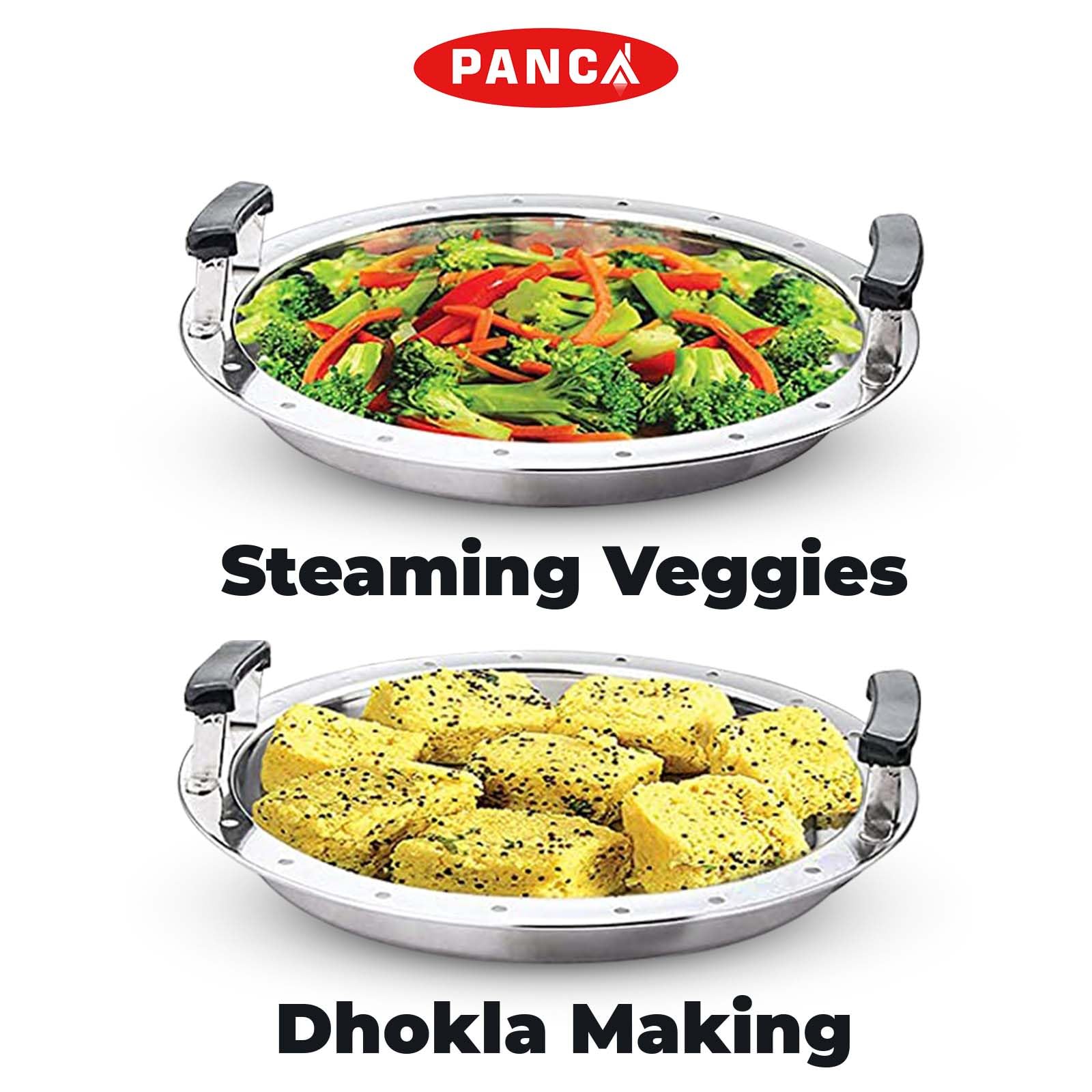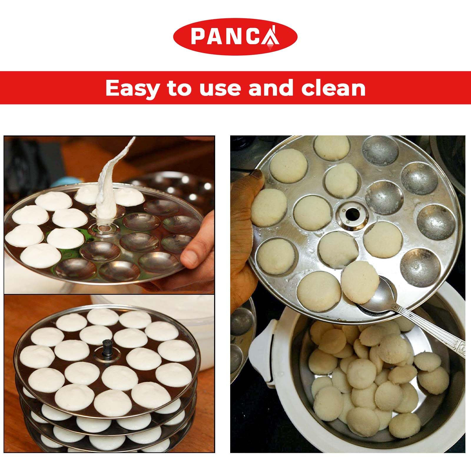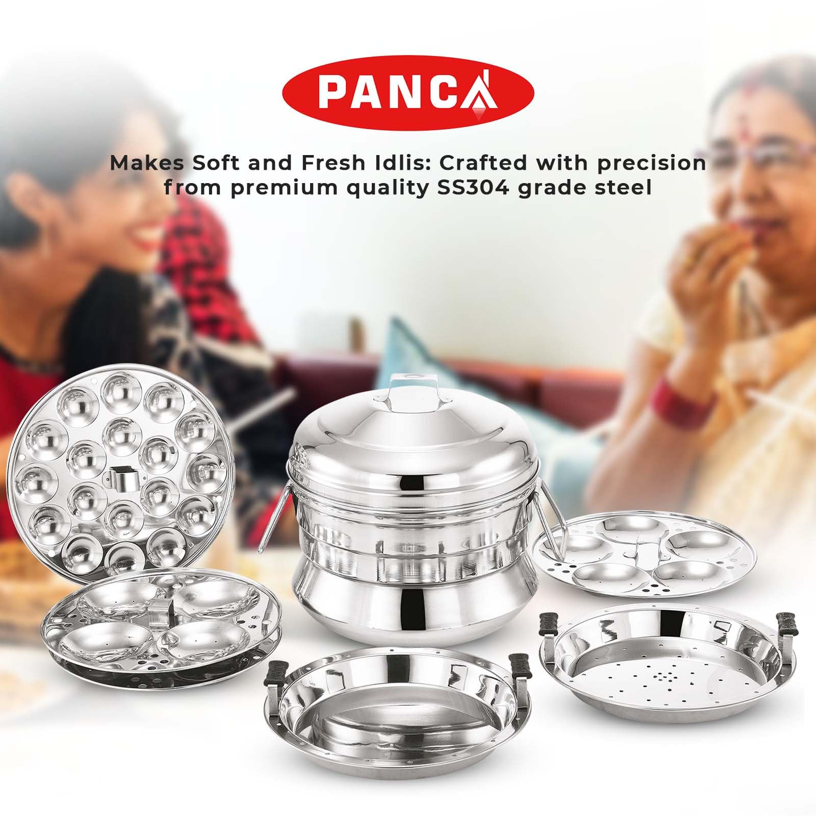 PANCA Idli Maker 6 Plates, 3 Idli Plates, 1 Mini Idli Plate, 1 Dhokla Plate, 1 Steamer Plate, Stainless Steel Idli Panai - Multipurpose (13 Idli, 18 Mini Idli), 15 Liters