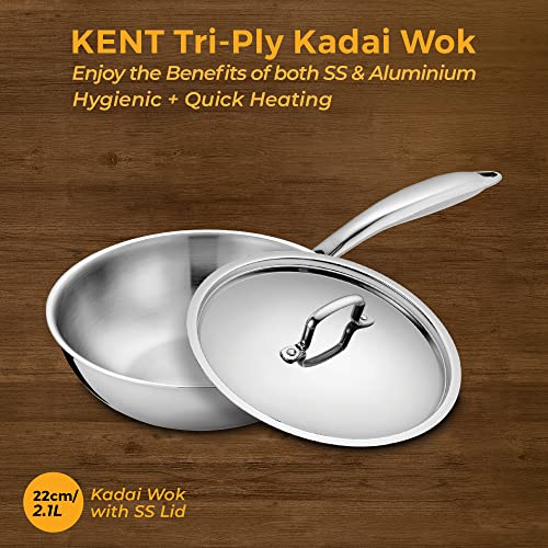 KENT Triply Kadai Wok 22 cm with Glass Lid 2.1 L | Cool-Touch Diecast Handle | Induction Friendly | Dishwasher Safe