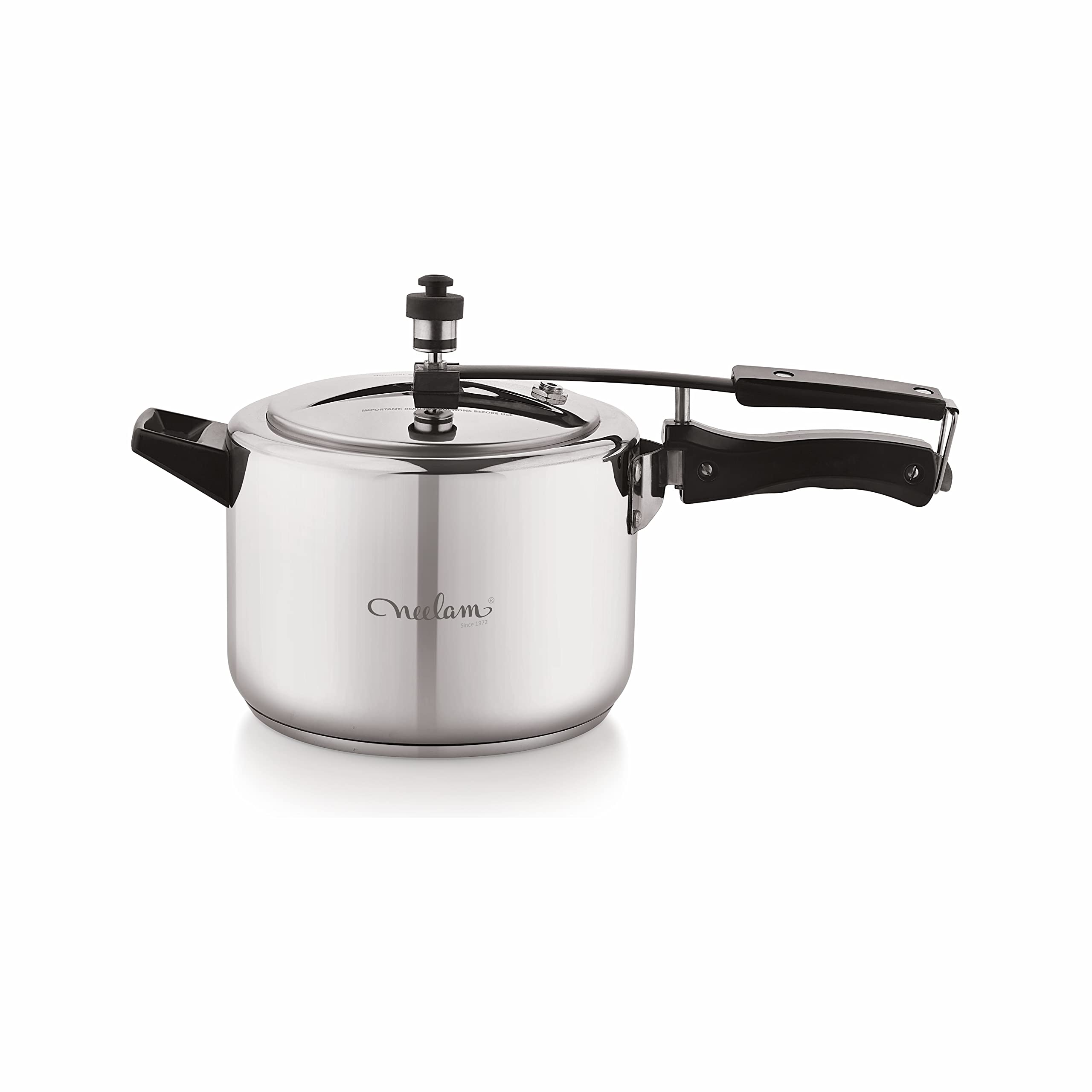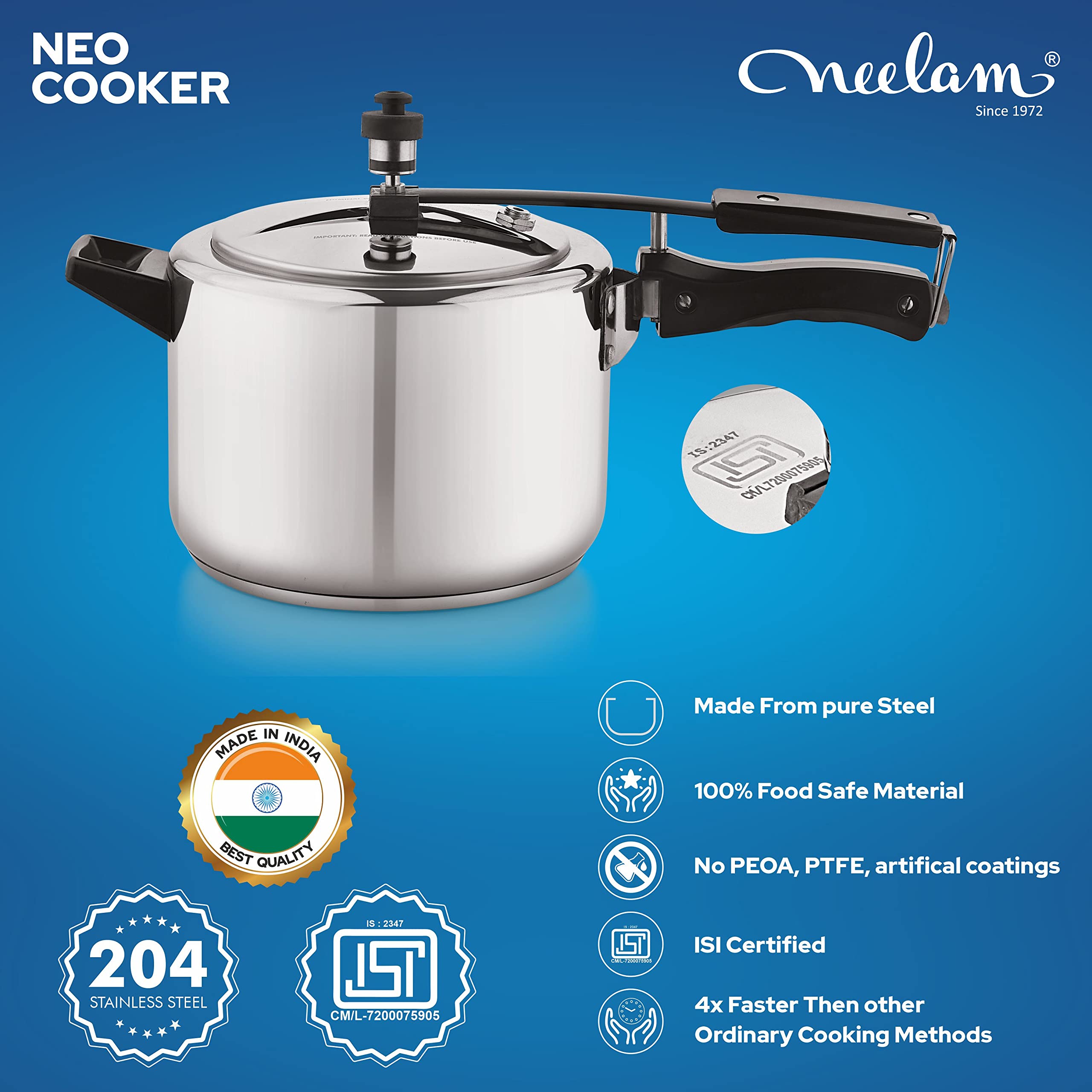 Neelam Stainless Steel Pressure Cooker body and lid are made of food-grade superior stainless steel for maximum hygiene and durability. On the outside bottom of the pressure cooker sandwiched between two sheets of stainless steel. it can be used on induction cooktops. In addition it is recommended for use on gas electric ceramic and halogen cooktops as well. Stay cool Bakelite handles are designed for convenience and are comfortable to hold while cooking. Our entire pressure cooker range is developed and Made in India so you can be assured that there is absolutely no compromise on quality.