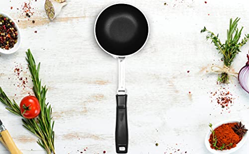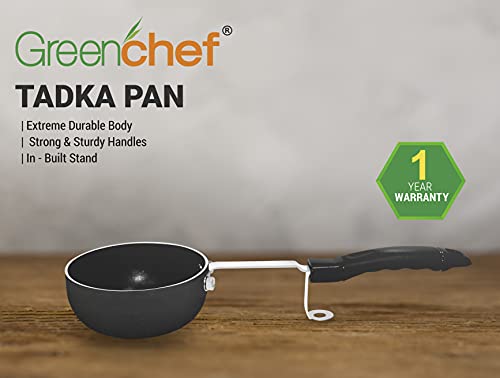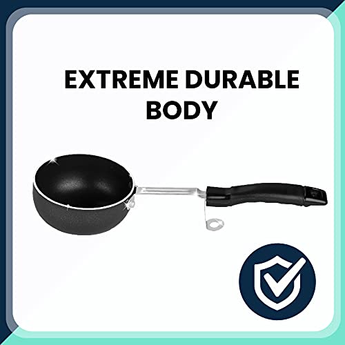 Unique and durable product. Fast and handy way to give tadka to your food. 3Mm thick aluminium body; with durable stainless steel rod handle.Due to its bending in between handle remains cool and bending provides stand to tadka pan hard anodized material for heat distribution even and faster cooking resistant to corrosion and abrasion. Metal spoon friendly. Capacity 175ml 10cm dia.