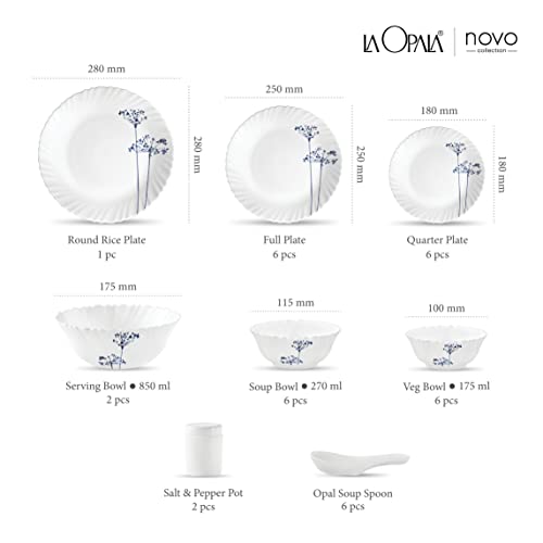 6N Full Plate (250 mm) 6N Quarter Plate (180 mm) 6N Vegetable Bowl (175 ml) 6N Soup Bowl (270 ml) 6N Spoon 2N Serving Bowl (850 ml) 1N Round Rice Plate (280 mm) & 2N Salt and Pepper Pot