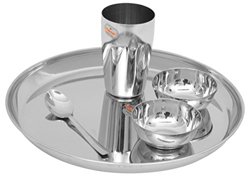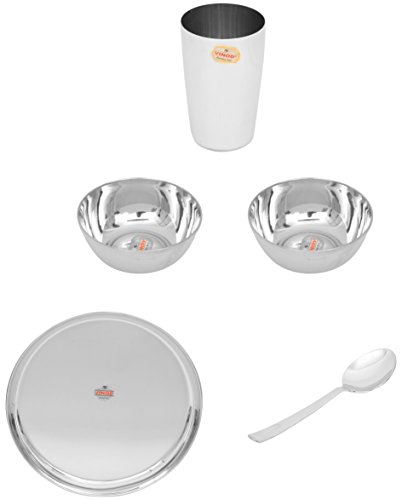 Vinod presents this silver color dinner set. It is made of stainless steel. This package contains 1 plate 2 bowls 1 glass and 1 spoon. It has seller warranty up to 10 years and the replacement warranty is available against manufacturing defects only.