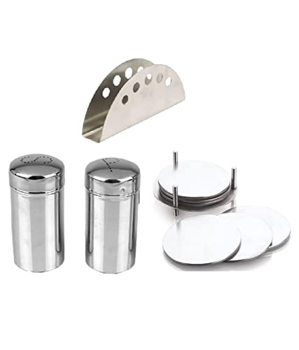 Stainless Steel napkin holder high quality and excusive designing holds the paper napkins perfectly.6 pcscoasters. Can be used greatly to protect the surface of the table from dripping from beverages.Elegant looking salt and pepper shakers. Easy to use and serve. Made of stainless steel.