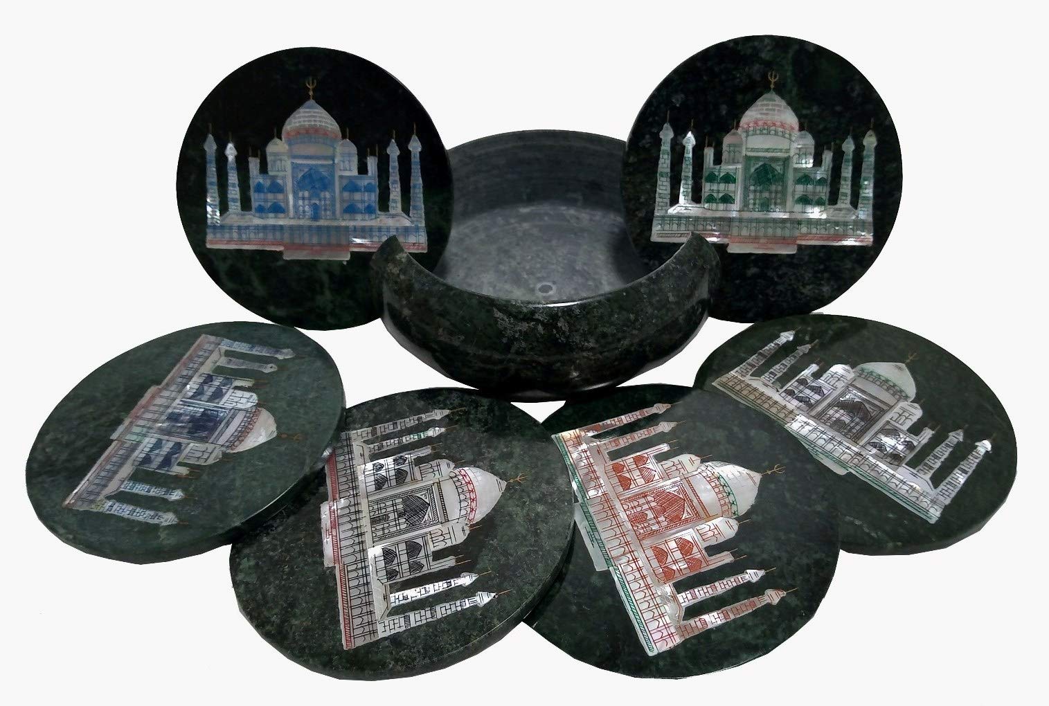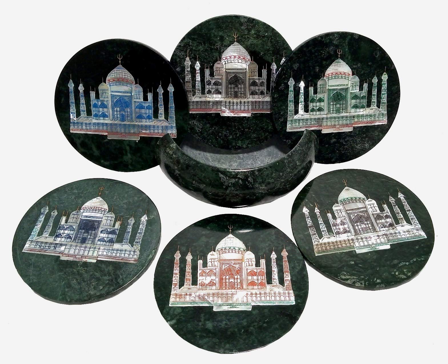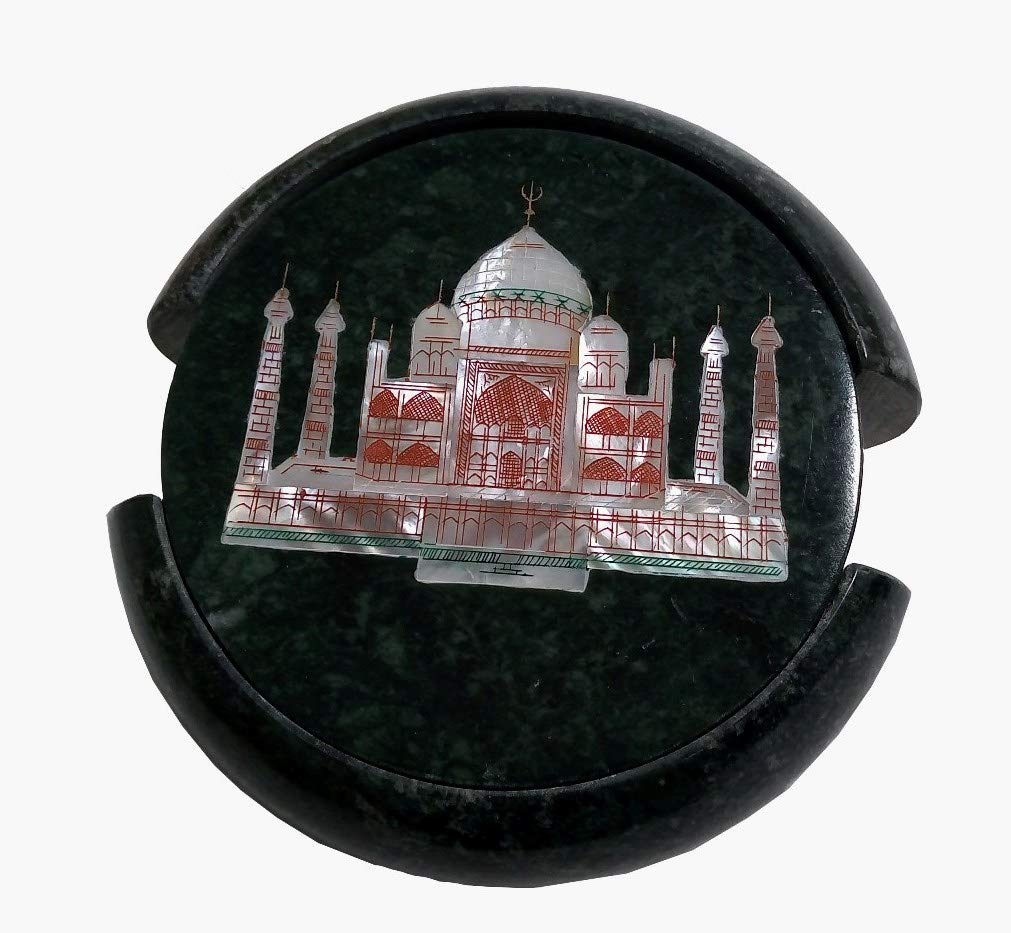 MARBLE INLAY ART AGRA - PACCHIKARI Handcrafted Forest Green Marble Coaster Set is Both Side Polish if you are using on wood/ glass table then no Scratched Perfect for Office and Home. Design: Taj Mahal. We will send you a paper with description and Meaning of the stone . We are himself manufacture of this product so we do custom design also. The Coaster can be used for decoration in Home and Office & also can be nice for gifts. To maintain this art piece simply clean it with soap water and dry cotton cloth.