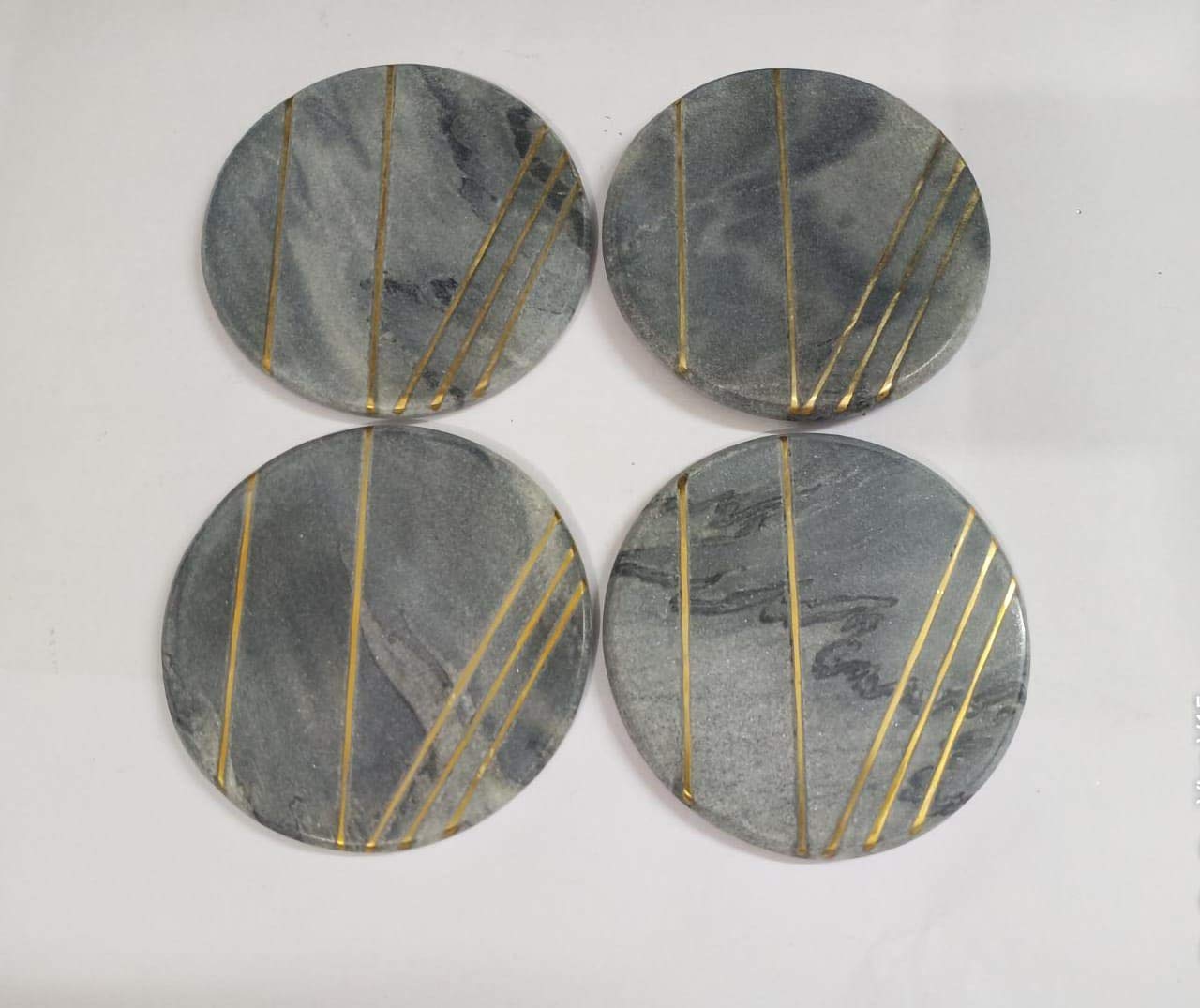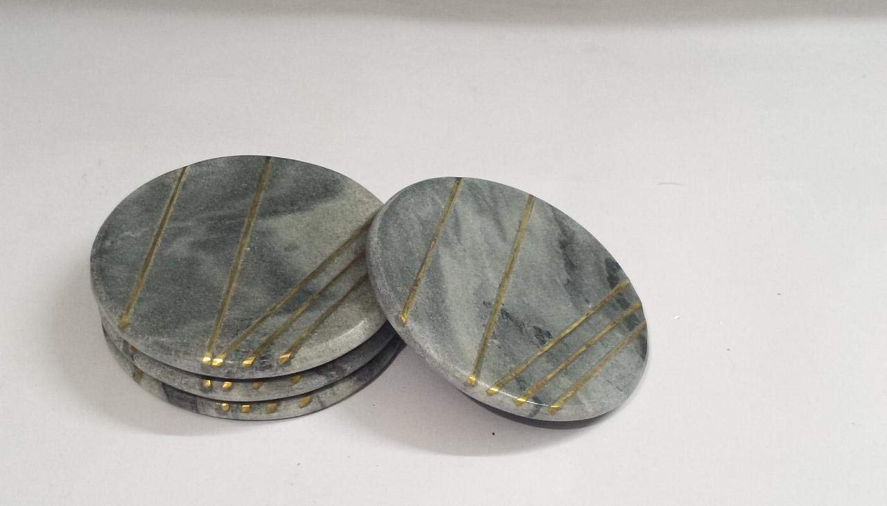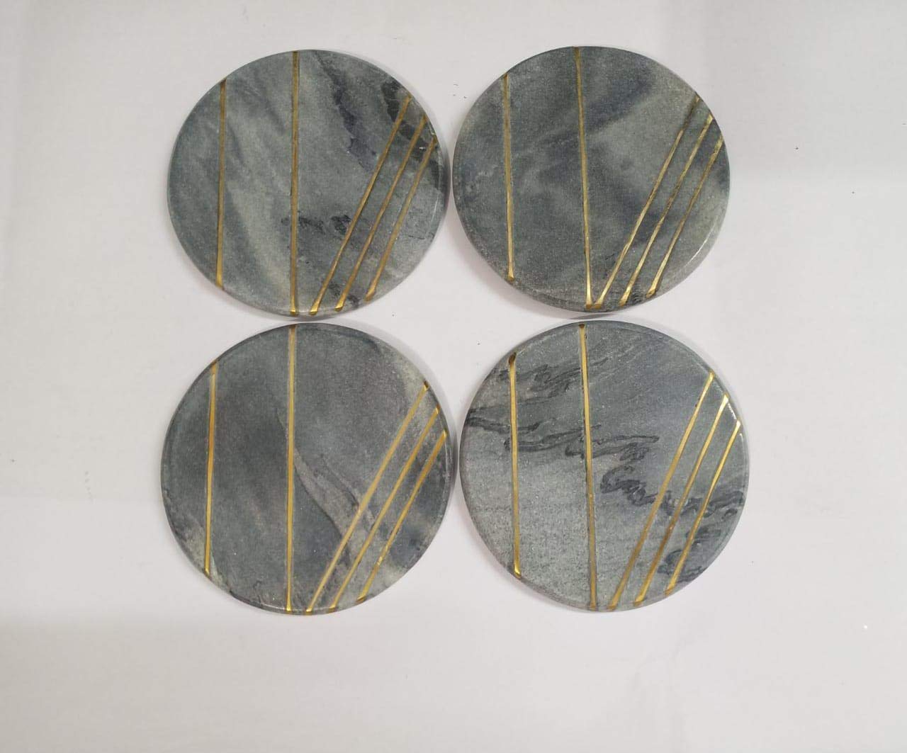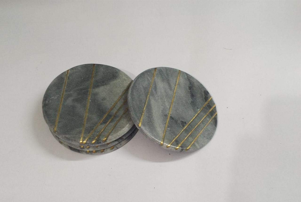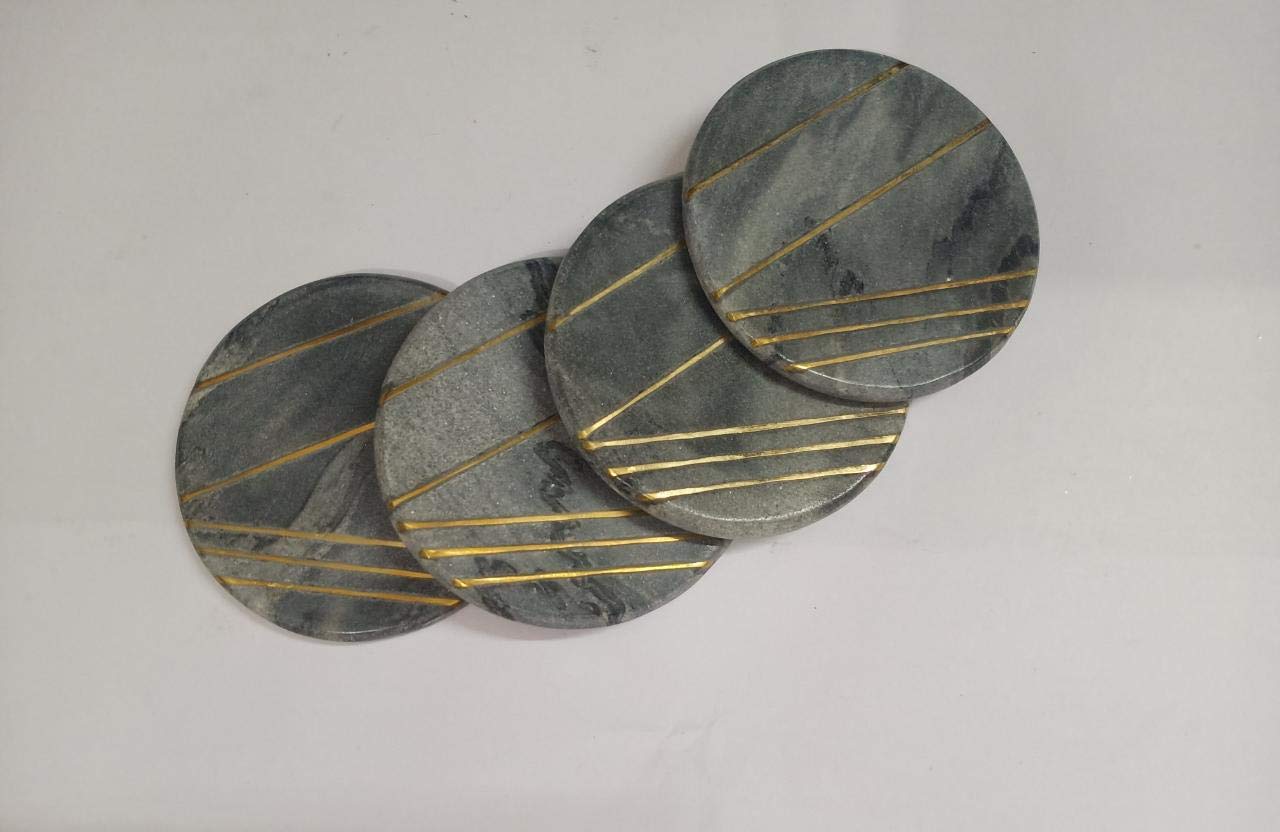 Premium Quality Marble with brass inlay s/4 pcs Coasters have been handcrafted by skilled workers. Every piece is hand inspected one by one to make sure it is in perfect shape. No need to store them away leave them for display to be admired. The natural patterns of the marble coasters gives an elegant look for your home dcor. Every piece of our stone coaster is unique in its look and pattern. They are handmade and they are padded from the bottom to protect your bar and furniture from scratches. Our coasters are thick and sturdy to last you a long time. They are easy to clean as well just wipe them with a damp cloth and leave them to dry. Being thick also means they don't easily slide around so glasses and mugs stand firmly on the coaster. 4x4 inch 10-12 mm thickness.