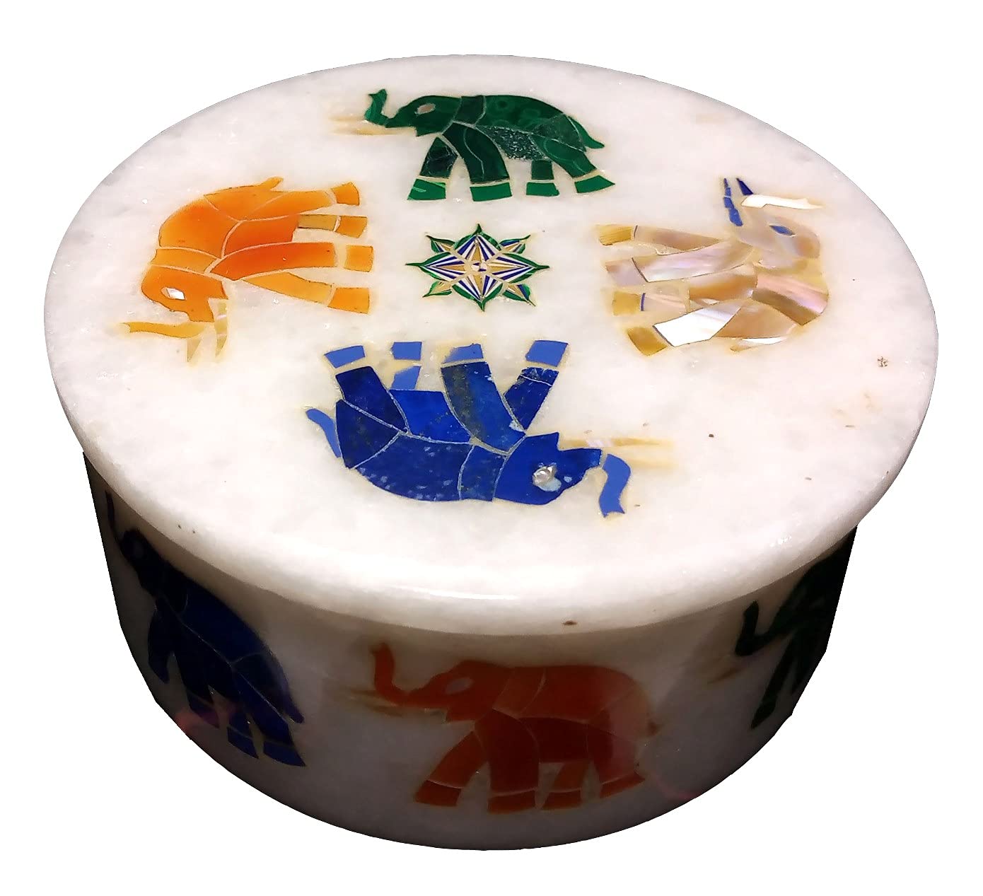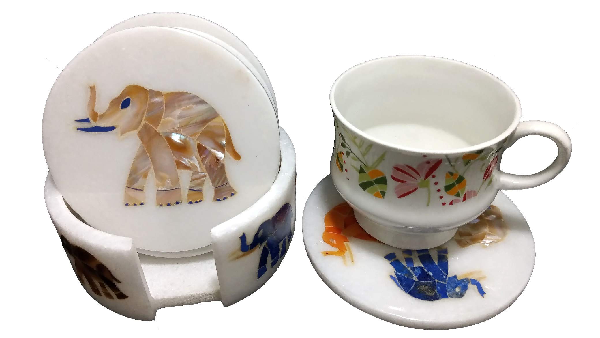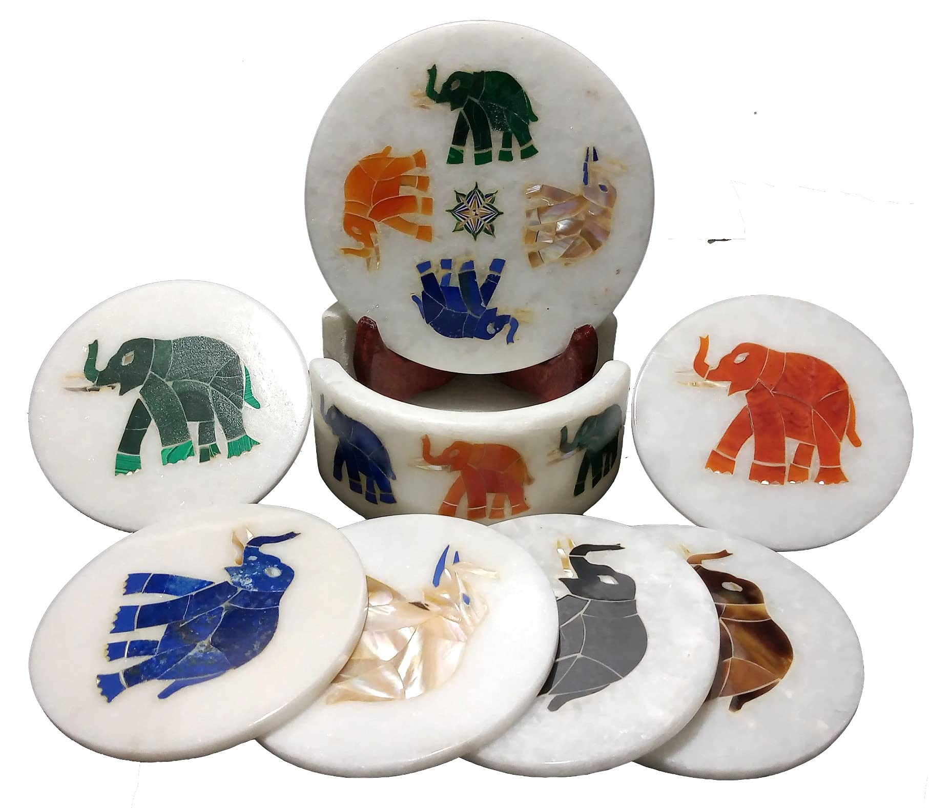 MARBLE INLAY ART AGRA - PACCHIKARI Exclusive Designer Coaster Set With Extra Top To be Used As a Mug Holder. It is made in Agra India & fully handmade by using different color of semi precious gems stone not a color and its 100% inlay so will remain as it is forever. We will send you a paper with description and Meaning of the stone. It is an art piece which will be a beauty & the conversation piece at home. Package Contains - 6 pieces Coaster tile + Container+ Top of Coaster+ Wooden Stand( total - 9 Item ) To maintain this art piece simply clean it with soap water and dry cotton cloth. Stone Inlaid In the Box Are Given Below : Lapis- Lazuli - Blue. Malachite - Green. Carnelian - Orange. Mother of Pearl - White. BLack Pearl - Brown. Black Onyx - Black. We are himself manufacture of this product so we do custom design and bulk order Too According to your Shape color and Size.