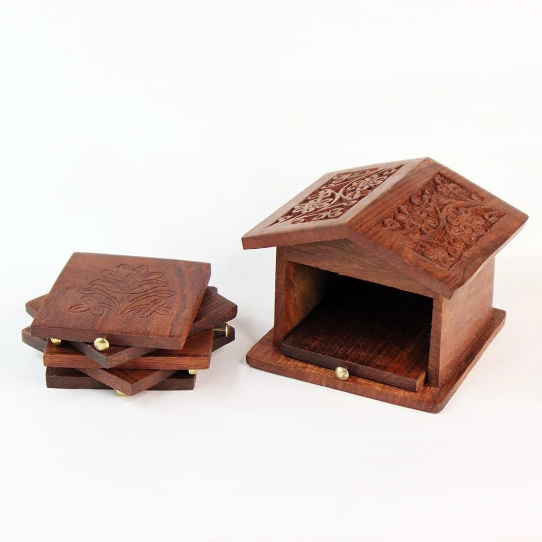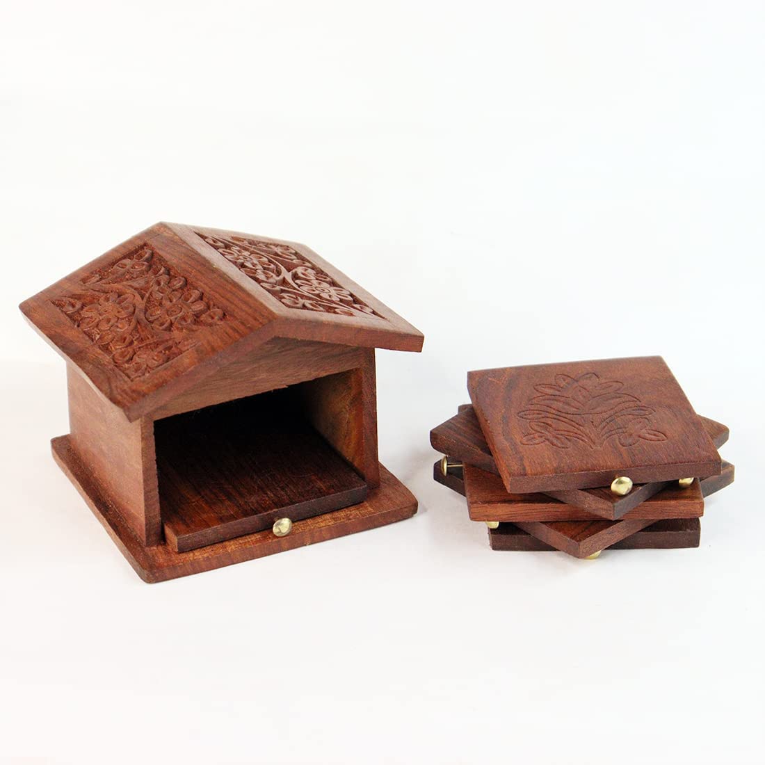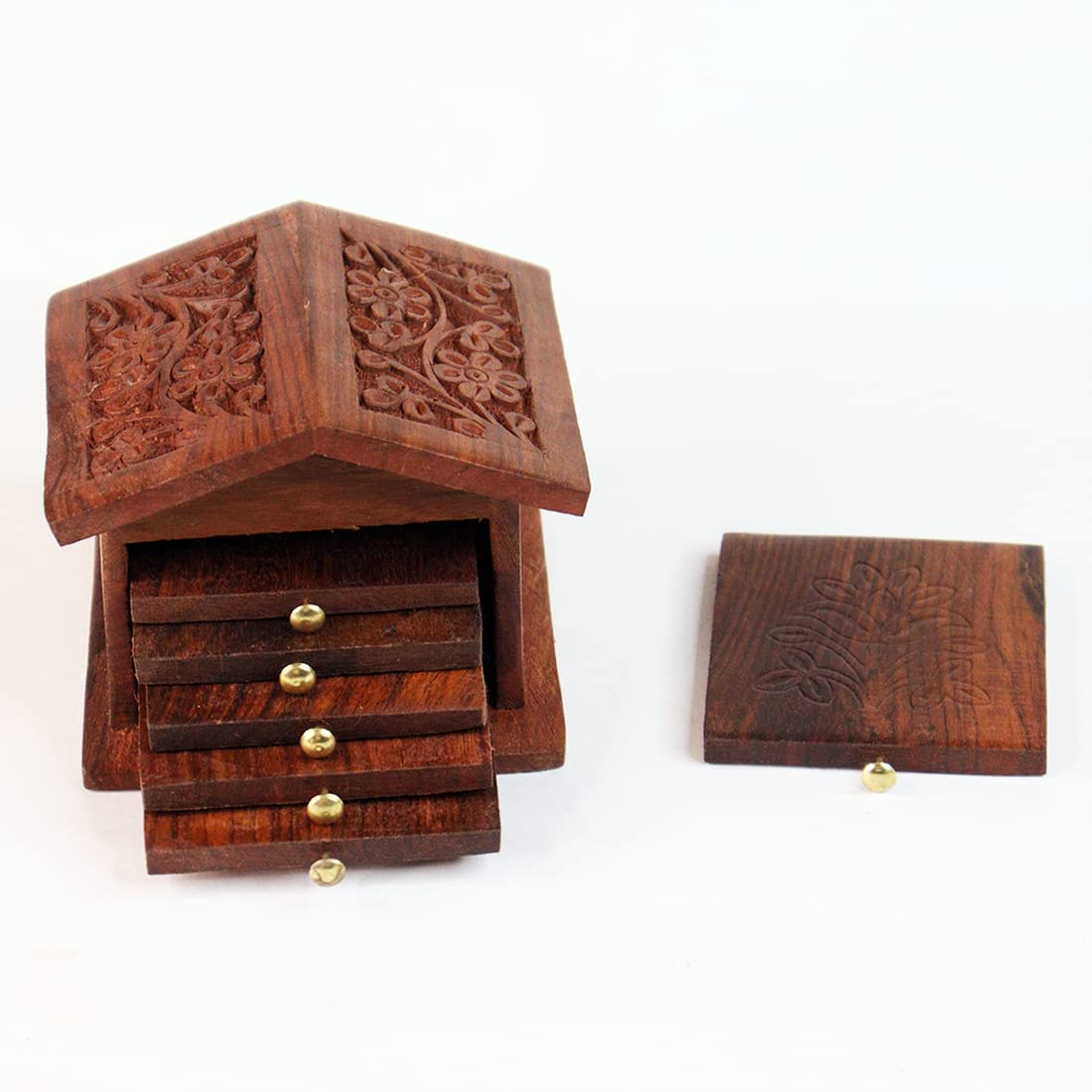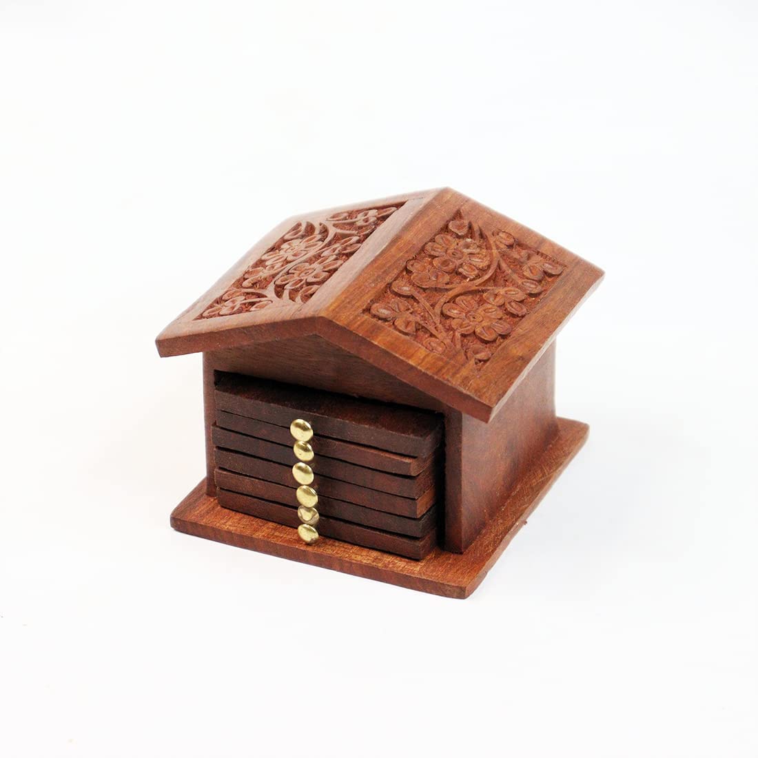 SAHARANPUR HANDICRAFTS brings you Make your table look stylishroyal and antique with this beautiful tea coaster in hut shaped container It consists of 6 pieces coaster with 1 container Handmade by skilled artisans from saharanpur - india's largest hub for wooden handicrafts Will add an antique charm to your dinning setup or office table tops as well as can be used as a showpiece Can be a wonderful gift for house-warming party weddings or for homemakers or for those who love to get ethnic stuff. Our Mini Pallet Coasters Are A Great Addition To Any Home And Are Widely Used For Home Decoration And Offices. Their Design Is A Simple And Light Weight Solution To Protecting Table Tops From Cup Rings. Each Piece Is Unique In Its Own Way. Its An Elegant Pick For Home Decor Piece Is Made By Skilled Artisans With Their Various Unique Techniques. Attractive Shape And Elegant Design Make It An Essential Part Of Your Home Decor. This Beautiful Item Can Be Placed In The Drawing Room Living Room Dining Table Or In Bedroom Or In Your Office. Artistically Adorned By Fine Work on The Entire Surface On This Beautiful Item. It Can Also Serve As A Great Gifting Option For Your Loved Ones Family And Friends. Decorating Our Homes Has Always Been The Most Favorite Way To Utilize Time. This Product Has Been Designed By Expert Artisans With Great Quality Of Material. This Beautifully Handmade Item Adds A Beautiful Look to Your Home.
