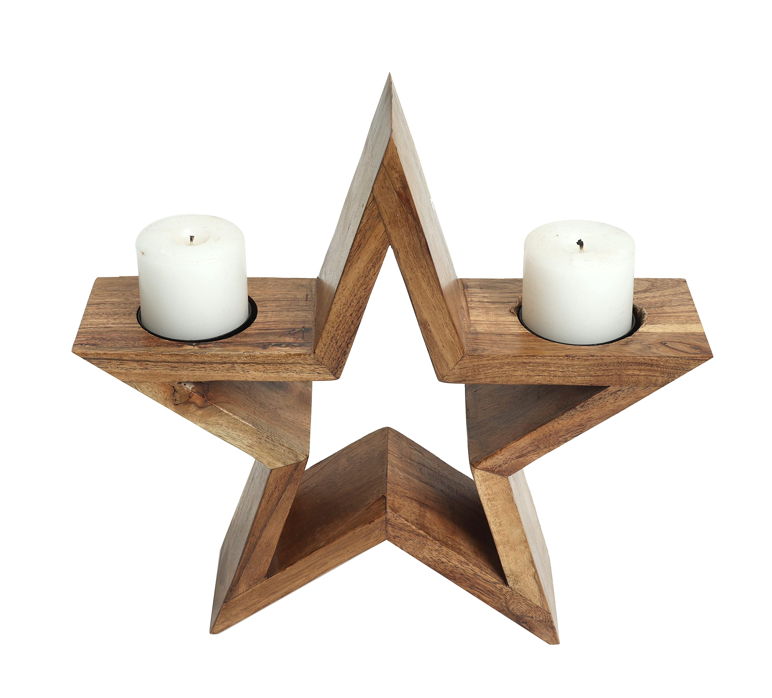Equal parts classic and modern these Star shape candle holders set the scene for a sophisticated table top no matter the occasion. The Star candle holder set is your new go to piece for adding that perfect rustic touch. Whether it's on the office bookshelf or at the center of the dining table the wood holders spark a sophisticated warmth you typically only find in a cozy mountain lodge. Sturdy and sure to last this set is the perfect pair to your favorite candles.