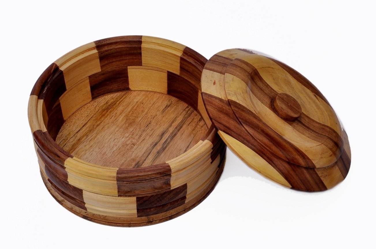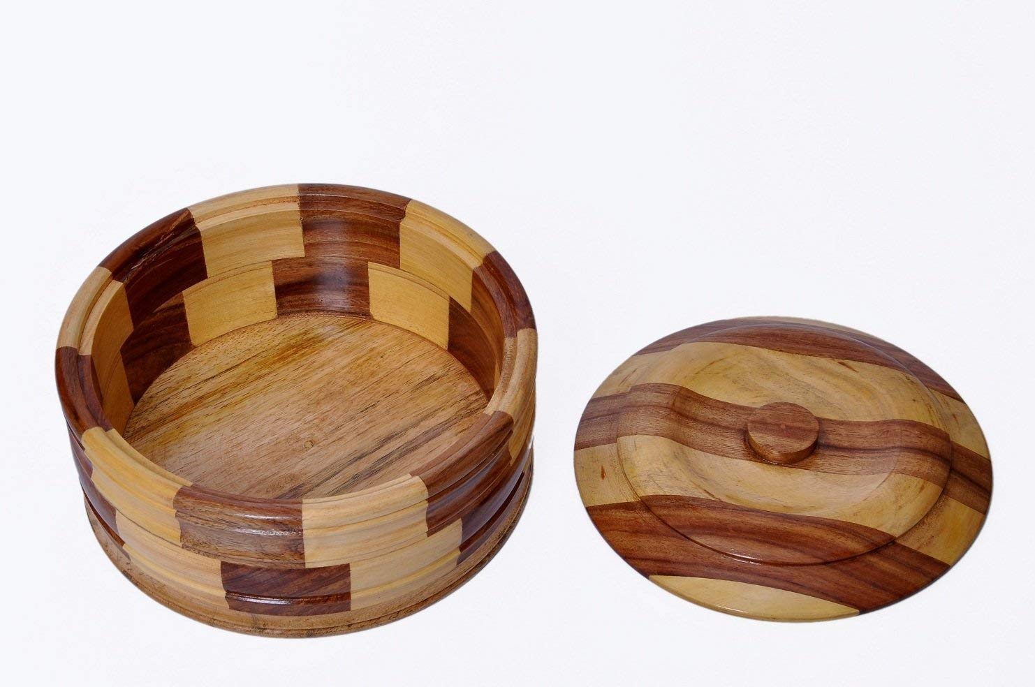 Material: Sheesham wood Color: Twin brown Finish: Teak Dimensions (cm): Diameter - 22 Height - 11 Weight: 900 g Package content: 1 Casserole Design: Running bond Style: Contemporary