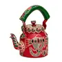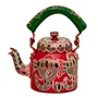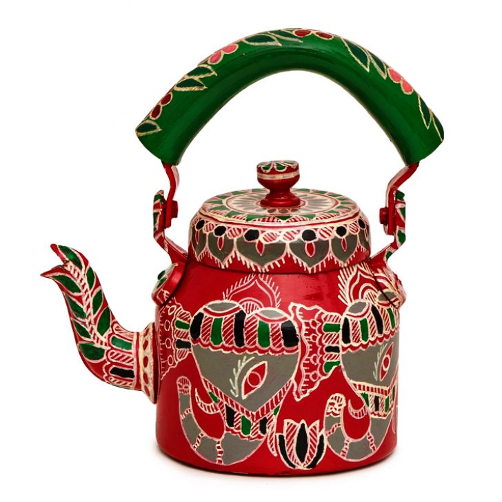 Ready to bring some history into your kitchen? This hand painted tea kettle, decorated with ancient stories, serves you some delightful ancient tea! Every tea stall in India has a tea kettle, but different then these kettles. These colourful tea kettles, made by Kaushalem are inspired by mythologies from Bihar. The kettles are painted in Madhubani style, a tribal art of Bihar. Each kettle describes a different story from a certain mythology.Every beautiful tea kettle is made with a brush and the colours were filled once the drawing was done.