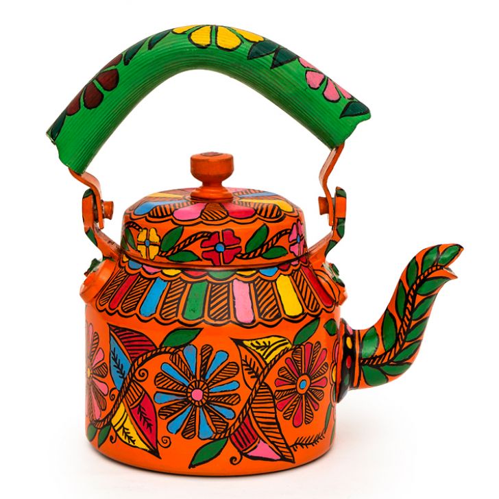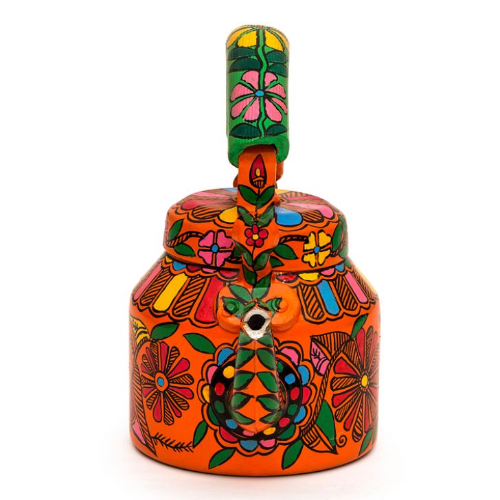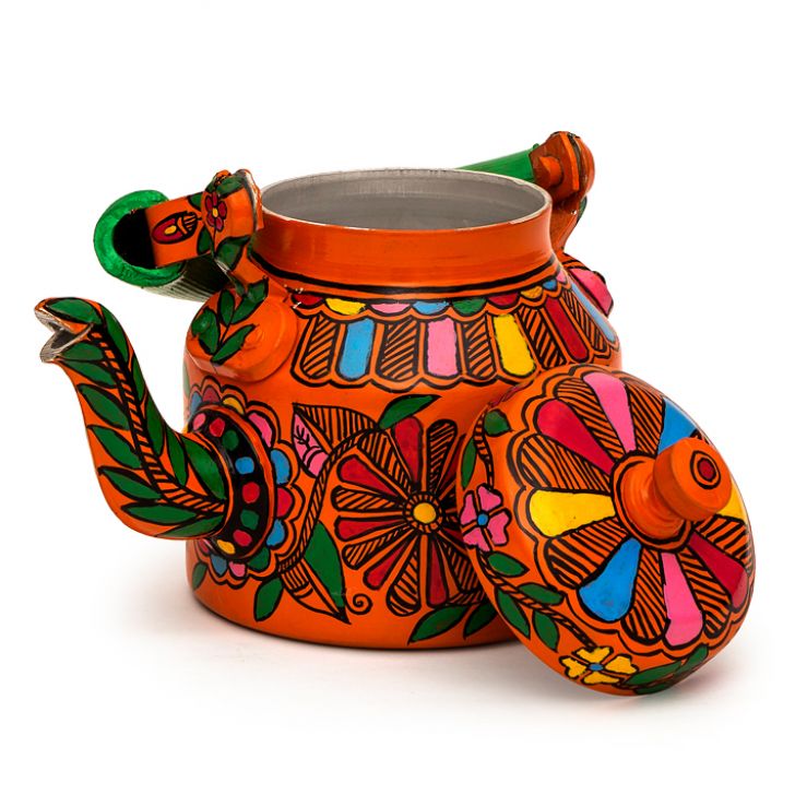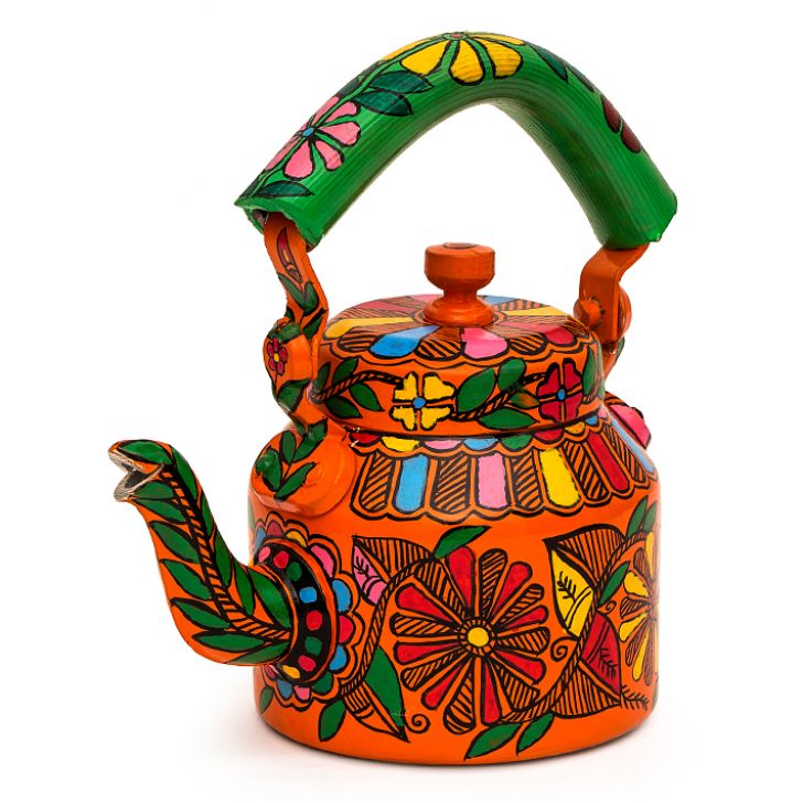 Ready to bring some history into your kitchen? This hand painted tea kettle, decorated with ancient stories, serves you some delightful ancient tea! Every tea stall in India has a tea kettle, but different then these kettles. These colourful tea kettles, made by Kaushalem are inspired by mythologies from Bihar. The kettles are painted in Madhubani style, a tribal art of Bihar. Each kettle describes a different story from a certain mythology.Every beautiful tea kettle is made with a brush and the colours were filled once the drawing was done.