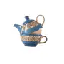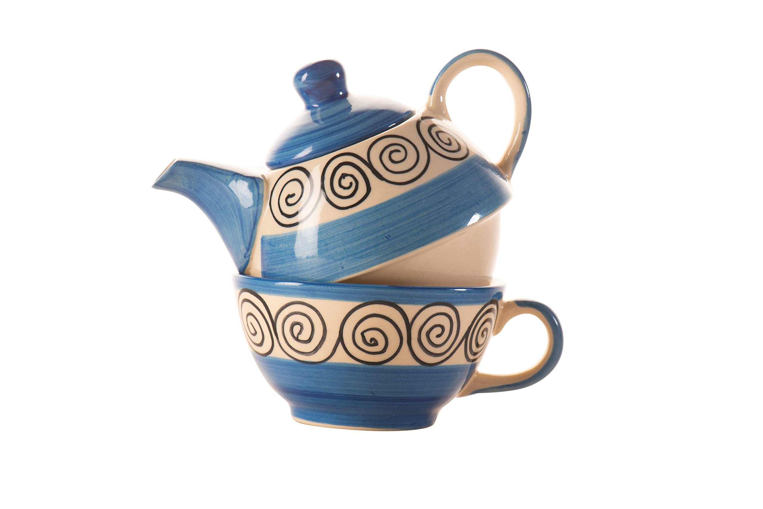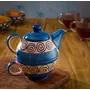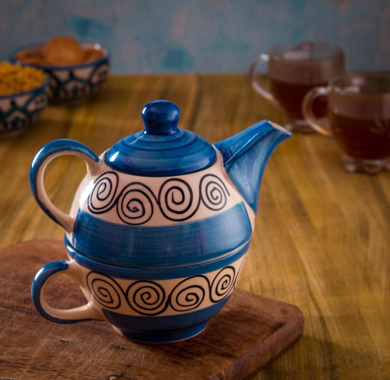 KHURJA POTTERY Microwave Safe Hand Painted Ceramic Single Tea Pot Kettle Set 400 ml Blue Spiral Printed