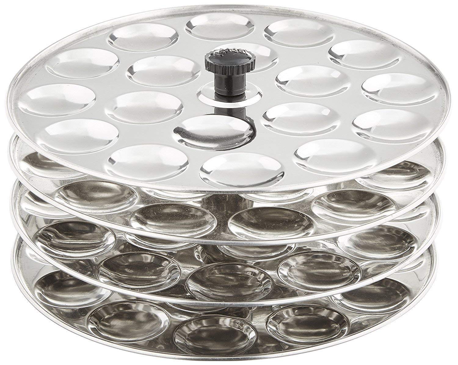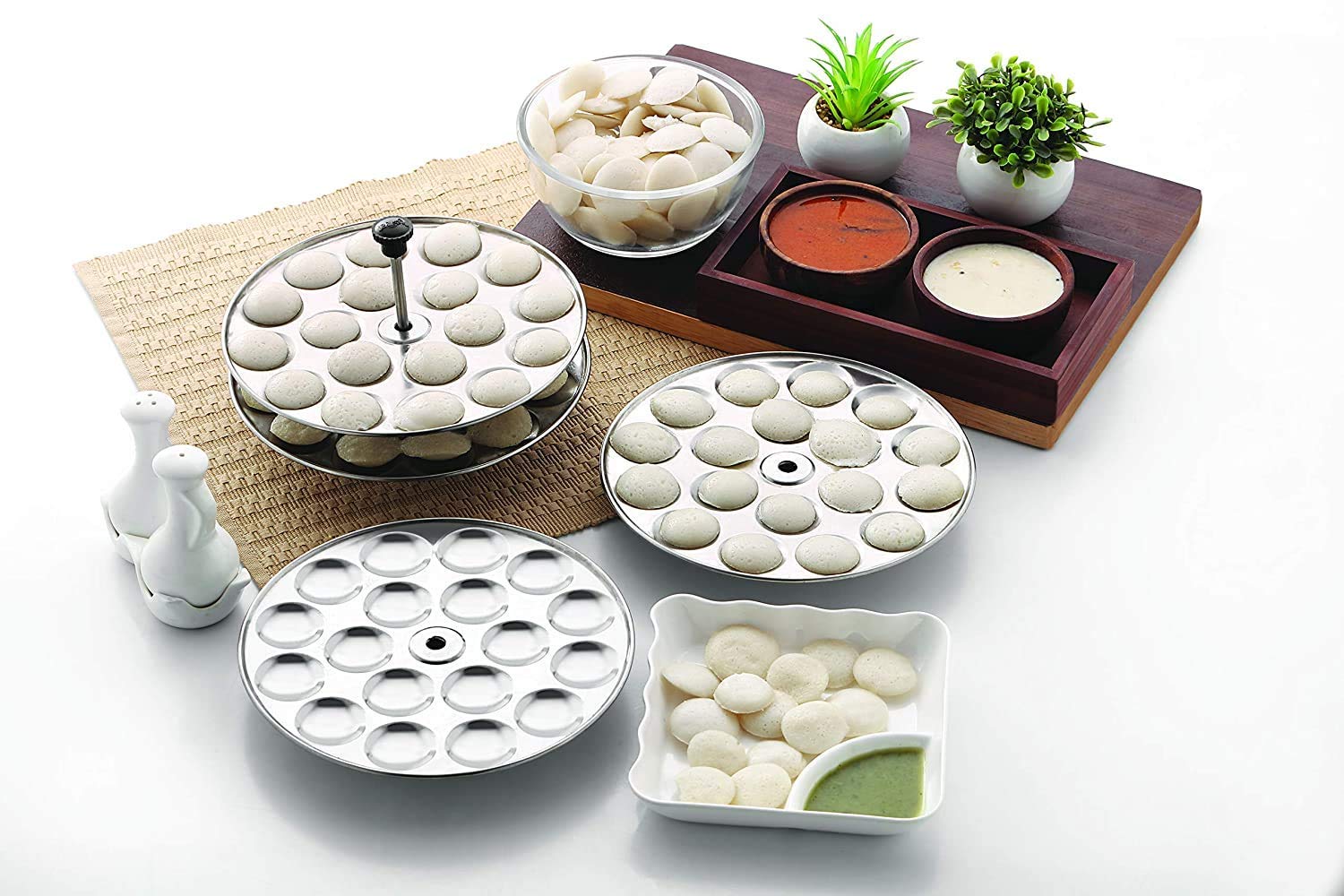 Dynore Stainless Steel Mini Idli stand stand with 4 Plates can make 72 Idlis. Entire set is easy to clean and wash, they have very exotic silver shining. Highly durable and made of fine food grade stainless steel. This set is made from high quality stainless steel making it exclusive and durable. This set has been beautifully designed to add grace to your dining experience. This set is strong in construction and will not bend or have dents during normal use. You can try different varieties of idlis like, Chocolate idli, vegetable idli, Raw Idli, Poha Idli, Oats Idli and many more with your imagination.