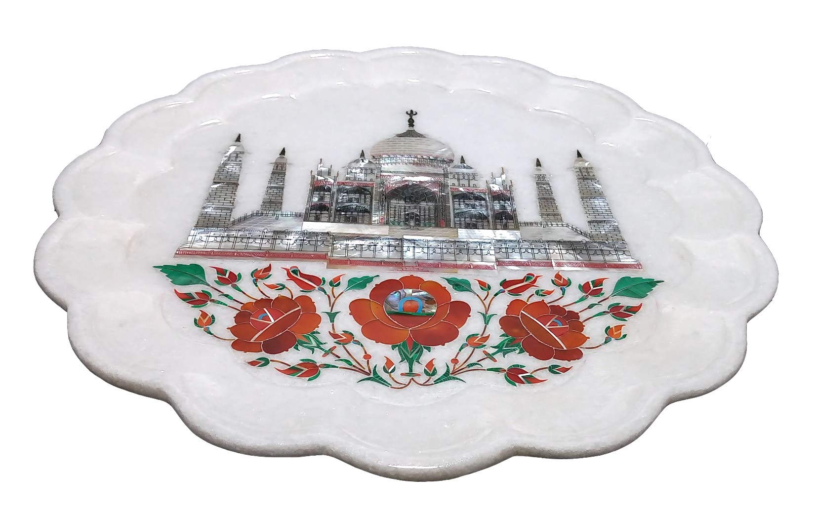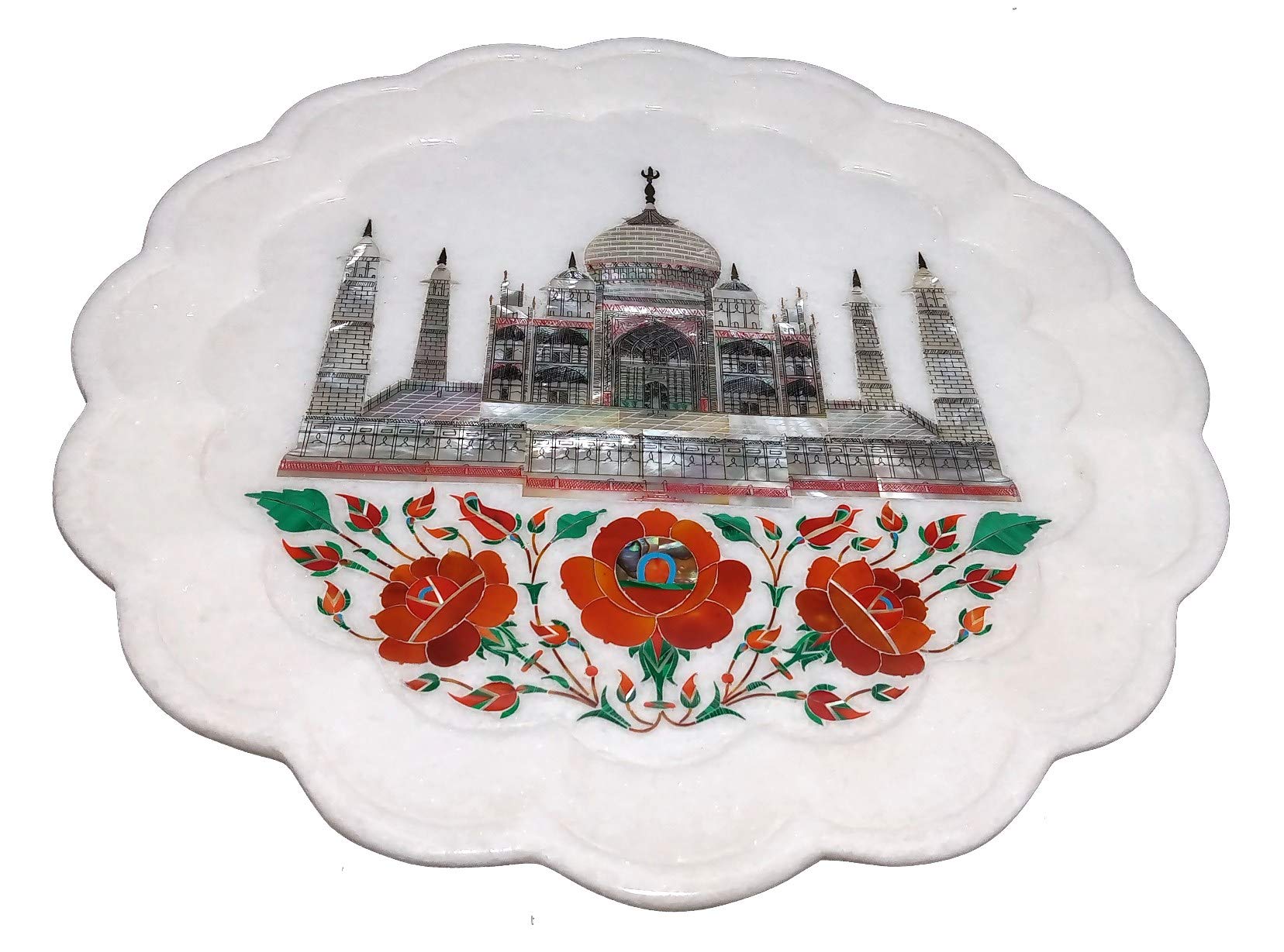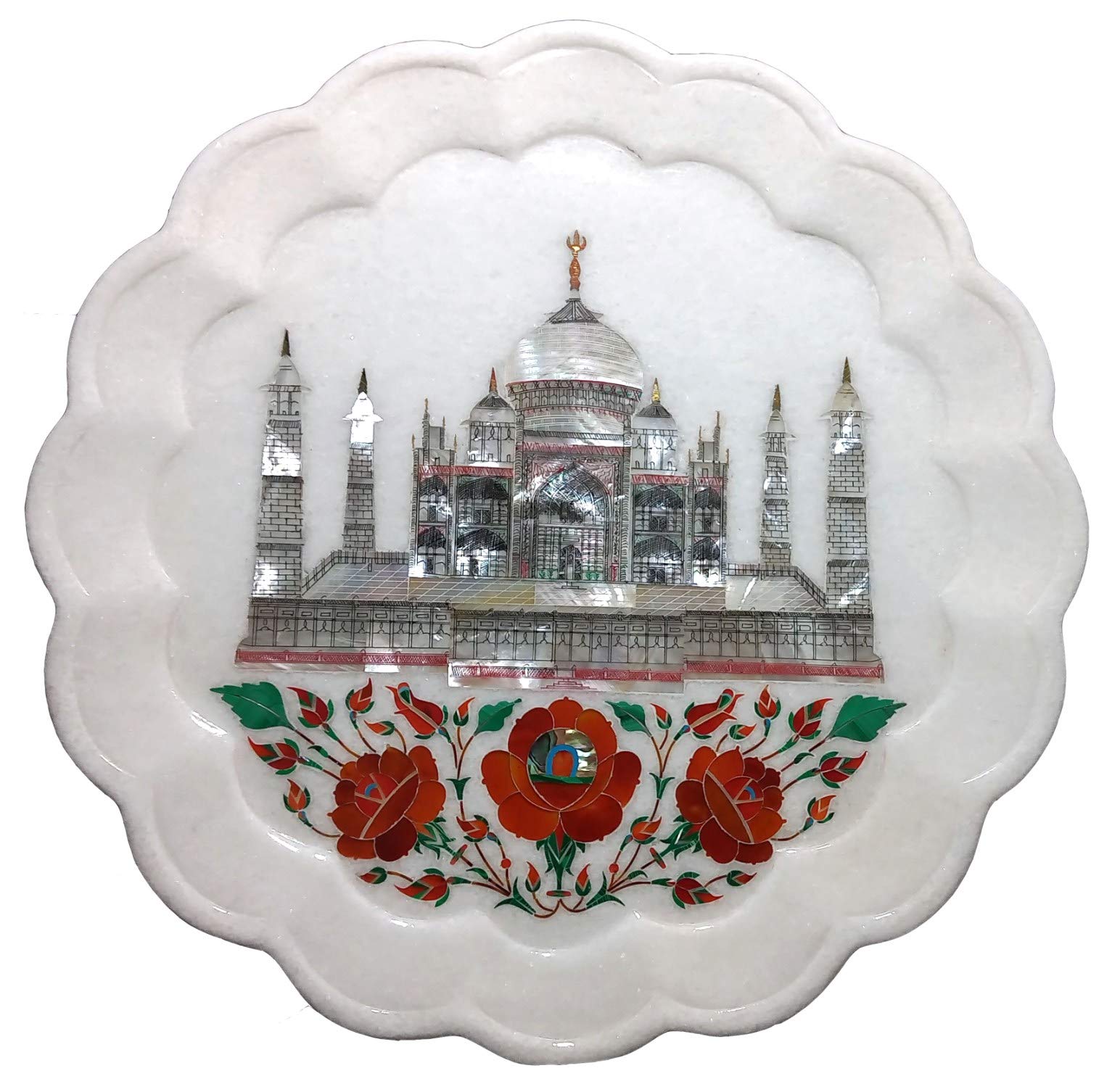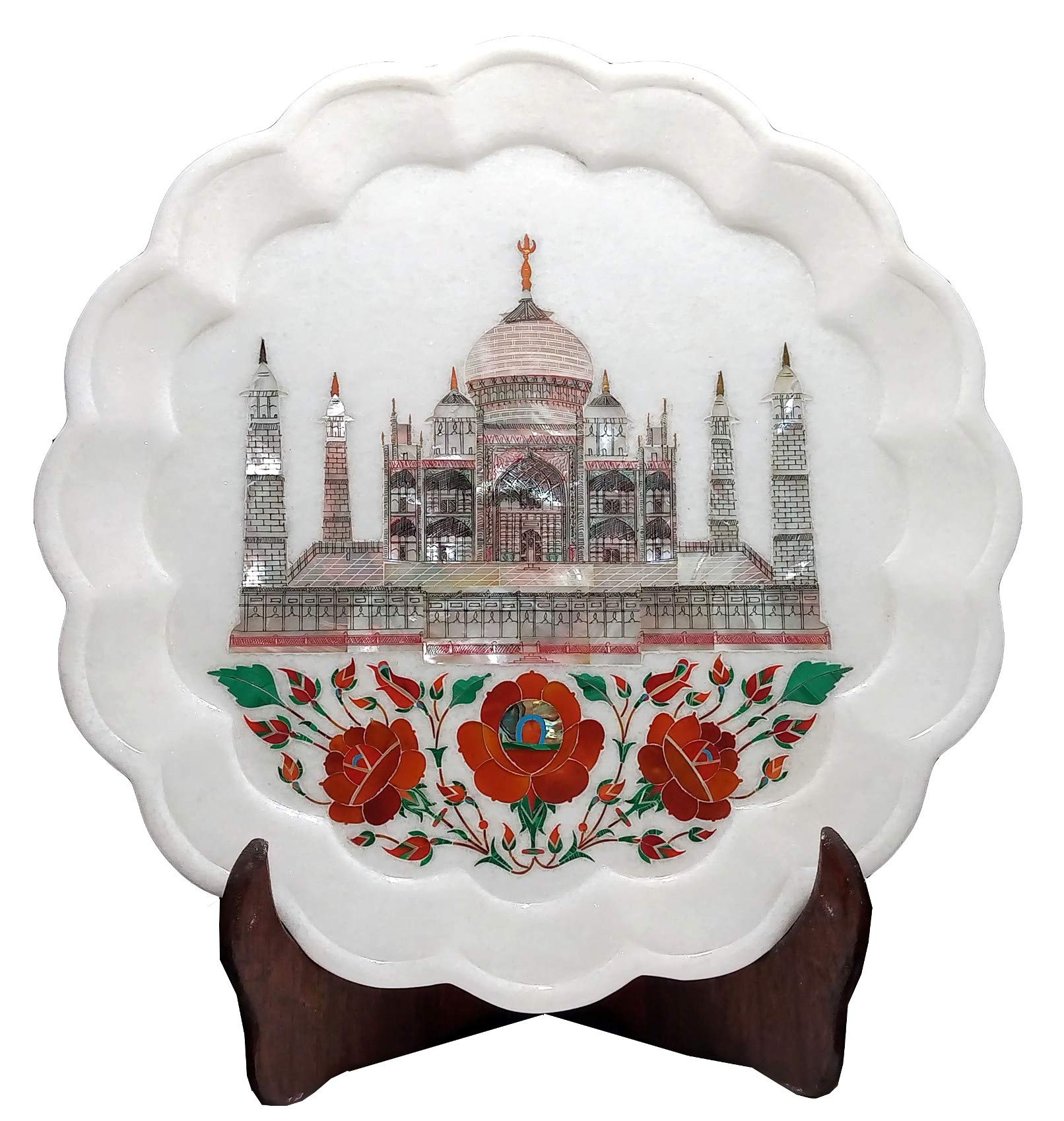 MARBLE INLAY ART AGRA - PACCHIKARI Handcrafted White Marble Taj Mahal Plate with classy colors and elegant designs every inch of this plate is layered with richness Design: Taj Mahal With Floral. We will send you Complimentary wooden stand also to display . We are himself manufacture of this product so we do custom design and bulk order also. The Marble Inlay Plate is made in Agra India & fully handmade and great example of make in India. To maintain this art piece simply clean it with cotton cloth and apply white wax for shine. It is an art piece which will be a beauty & the conversation piece at home.