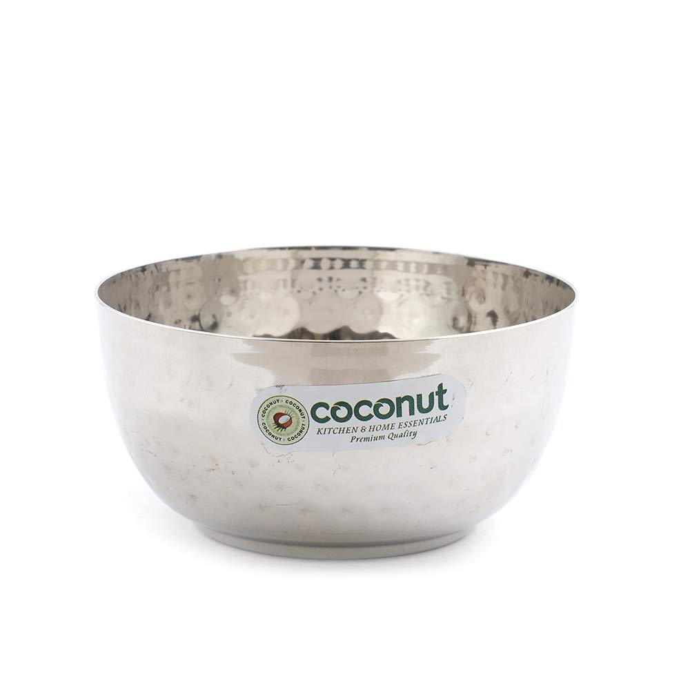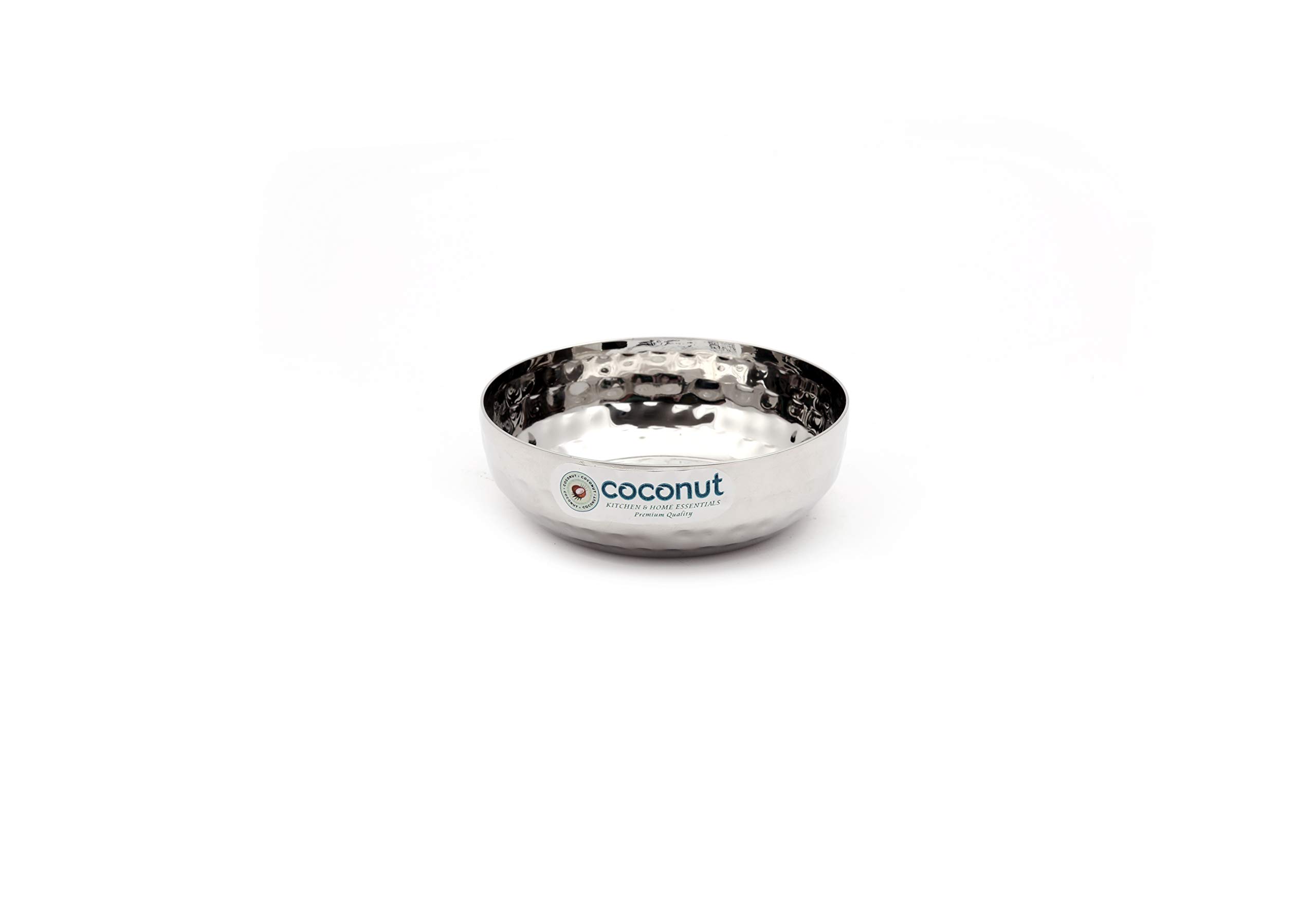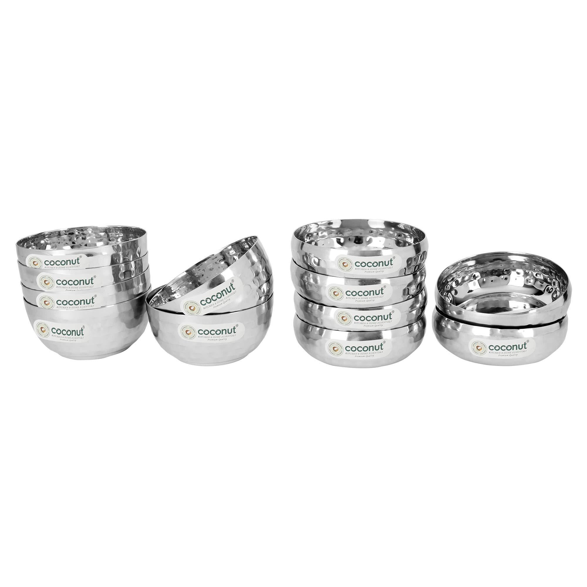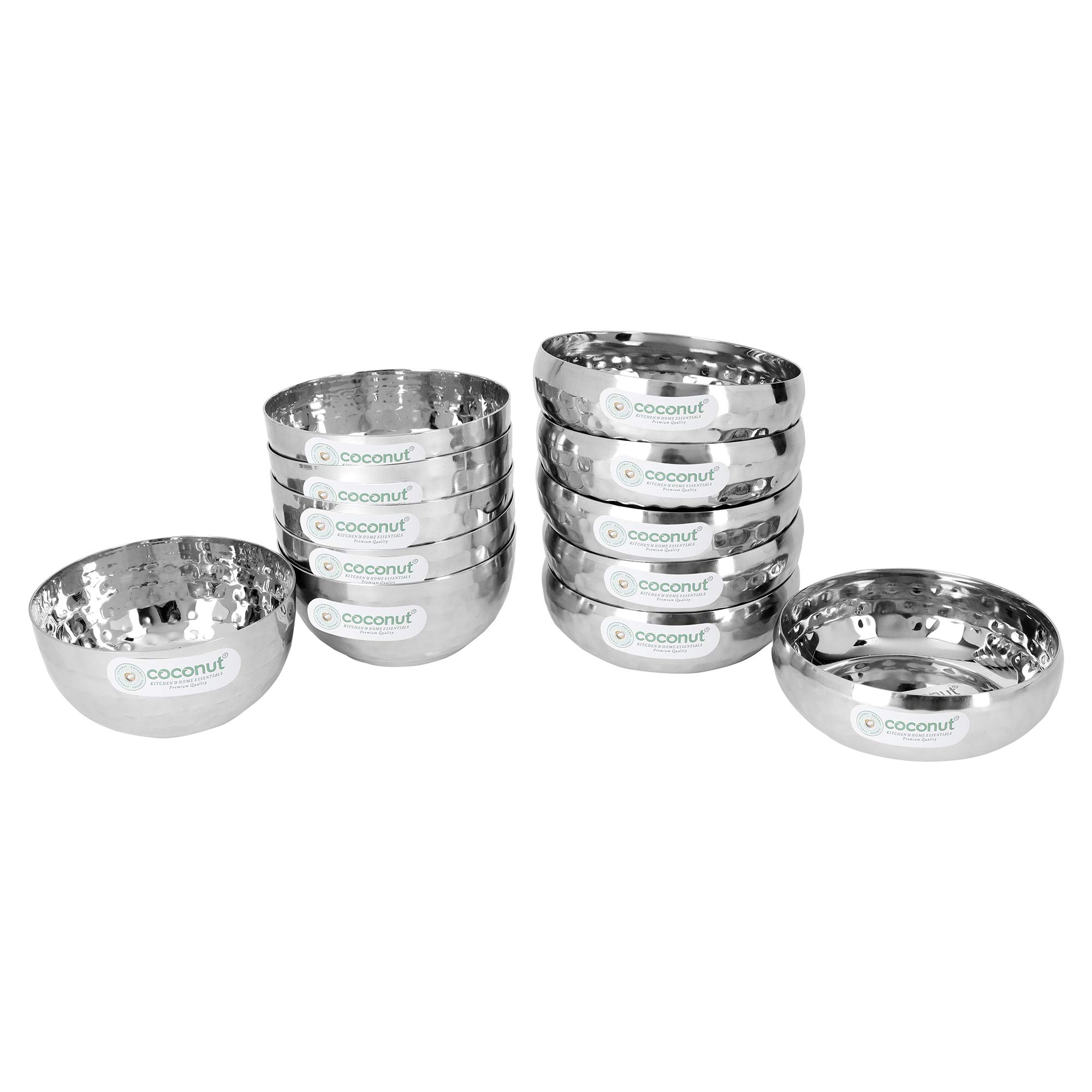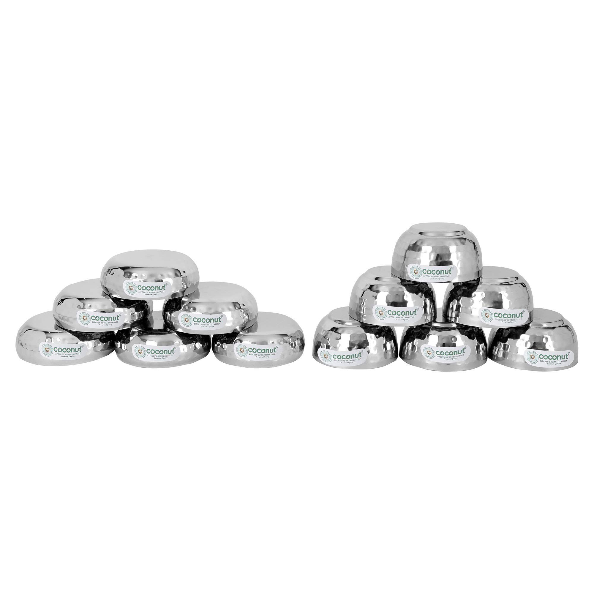 Coconut is range of innovative and products for home and kitchen. This is a combo collections of bowls and halwa plate . This C10 Hammered apple bowl is made from Premium 100% Stainless Steel Material. It comes with an elegant Mirror Finish which looks stylished for your kitchenware collections. The H3 Hammerred Halwa Plate which is ideally used to serve Rice Dals Curry Sides Snacks etc. Food Grade & Dishwasher Safe Strong and Sturdy.Can Be Served With Vegetables Curd Salad Desert Dal & Etc.;Product content Coconut Stainless Steel Combo Pack of C10 Hammered Bowl Set of 6 & H3 Hammered Halwa Plate Set of 6 . Dimension : Height - 5 cm Diameter - 10 cm