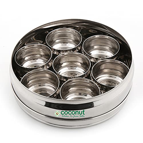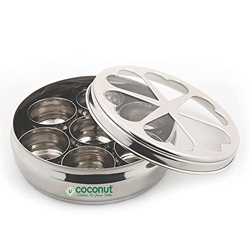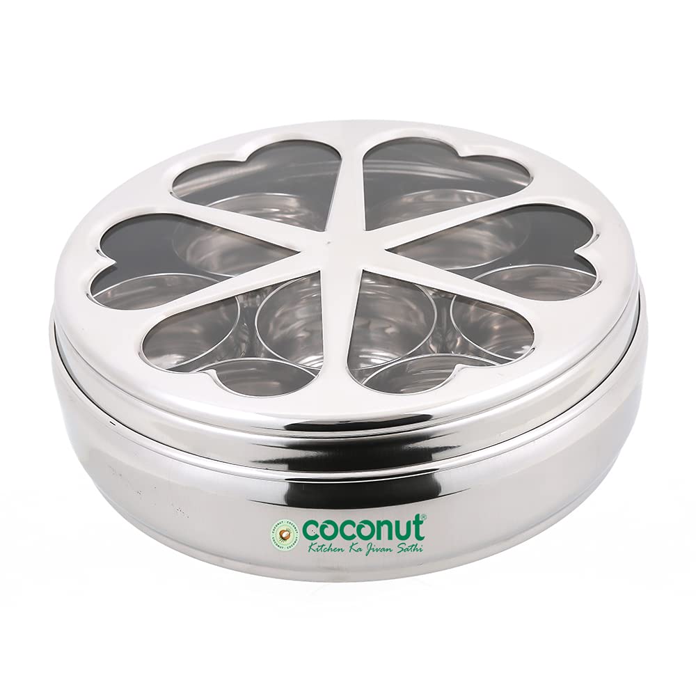 Coconut is a range of innovative and Products for Home and Kitchen. This is made from Stainless Steel material and its an essential product for all kitchen utilies. This Masala box comes with Carving Design with Mirror Glossy Finish for elegant look. This Masala box has seven bowl cups which can be stored spice items like Fenugreek Cloves Black cumin Indian BayCardomom Termeric Dals Channa Peanuts etcs. The product is food grade and Dishwasher Safe. Product Content - Coconut Floral Spice Container With Belly Small with 7 Bowls - 1 Unit. Product Dimension - Width -19 Cm and Height - 6.5Cm.