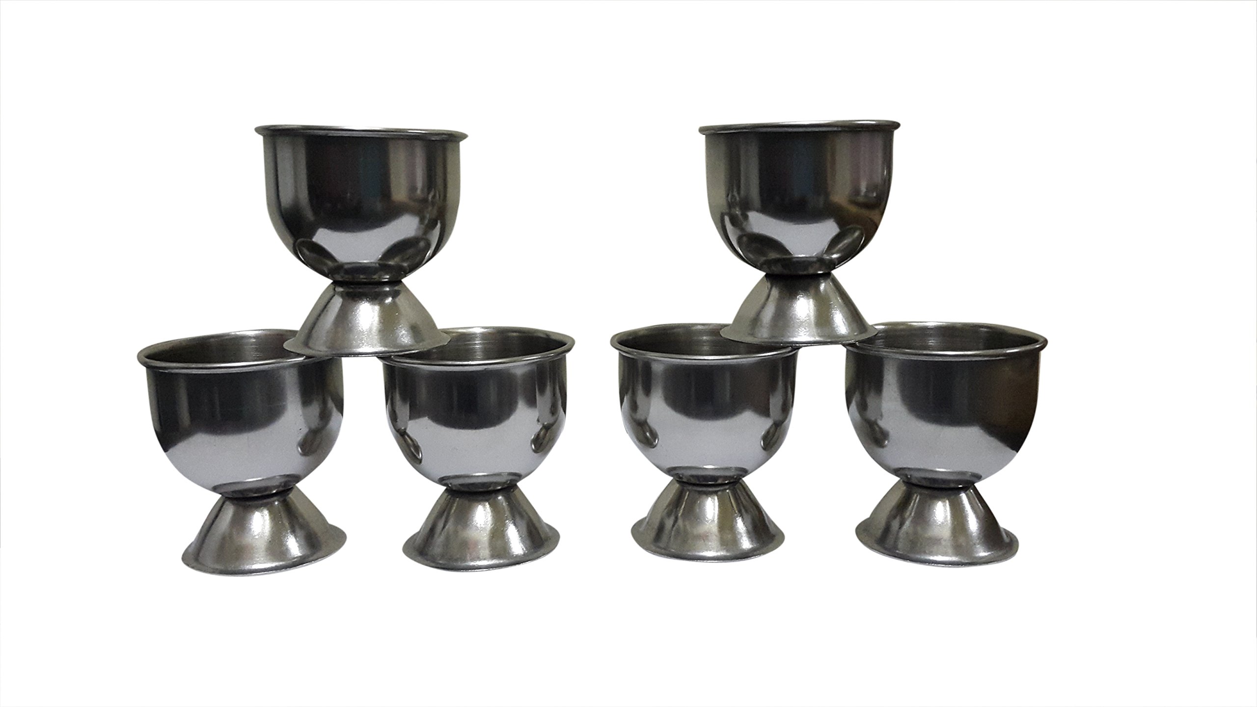 Set of 6 Egg Cups Large; Set of stainless steel egg cups is an innovative, efficient and timeless kitchenware product. It neatly holds and displays shelled and unshelled eggs.
