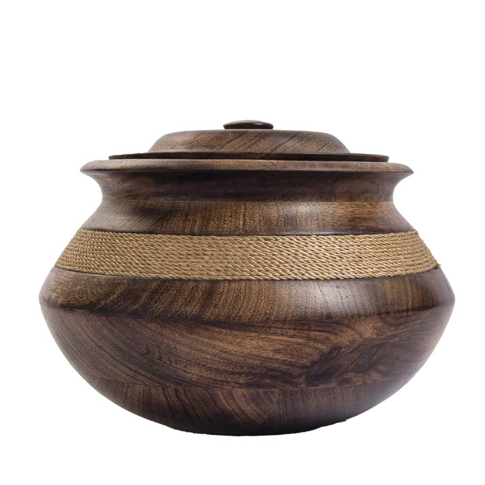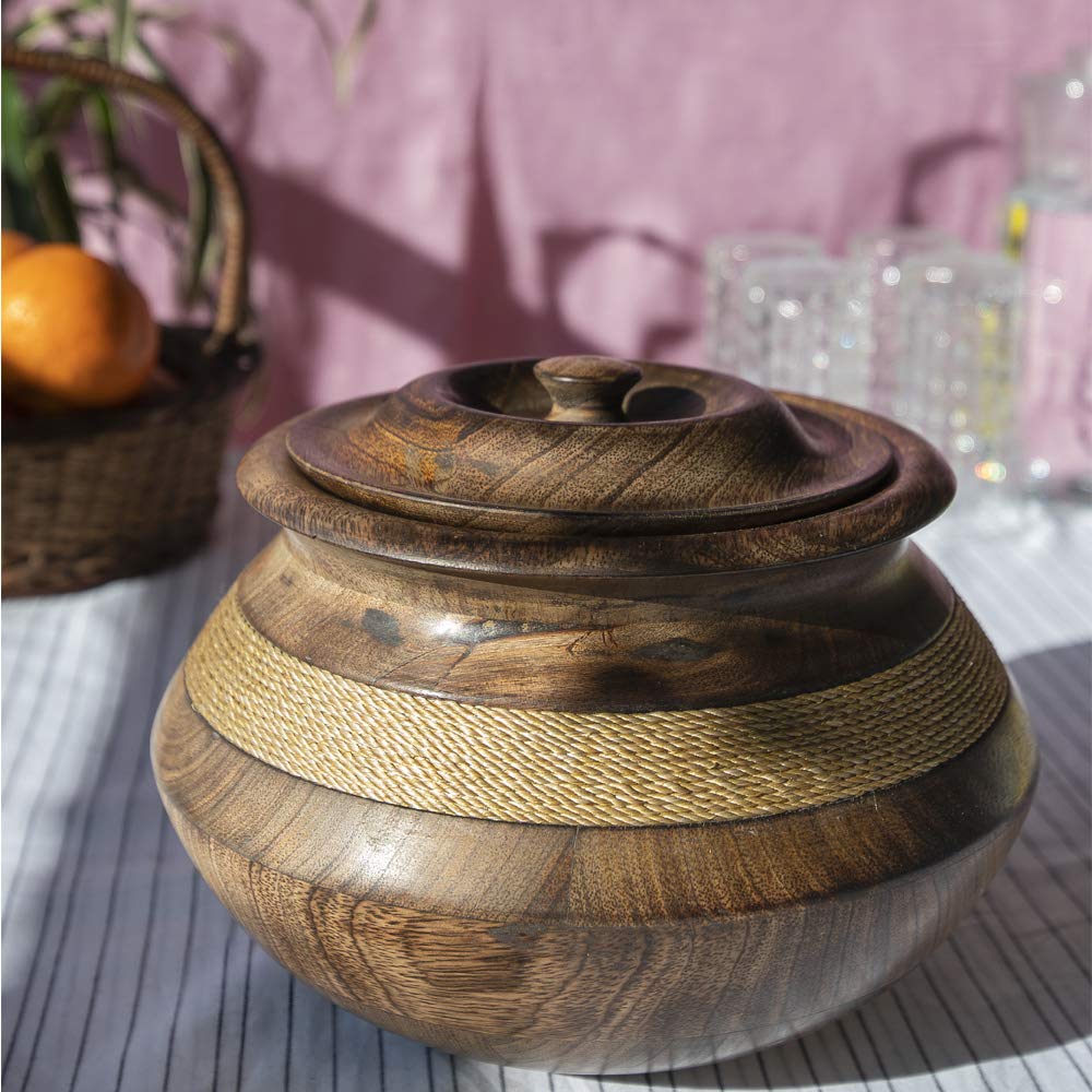 SAHARANPUR HANDICRAFTS Handmade Wooden Handicraft Serving Bowl with Lid Unique Gift Items Bowl for Snacks Handcrafted wooden handi is made with precision and style to suit the elegance of your home. Designed with a broad patch of jute threat for an ethnic appeal with a round lid it has appropriate dimensions(6x 5 inches).Organic healthy environment friendly wooden handi is made with herbal polishing to keep food items and varied indian dishes. It keeps the food warm with an added benefit that the wooden handi does not becomes hot and can be held with hands even when hot. Unique style adds to the range of modern and different utensils.