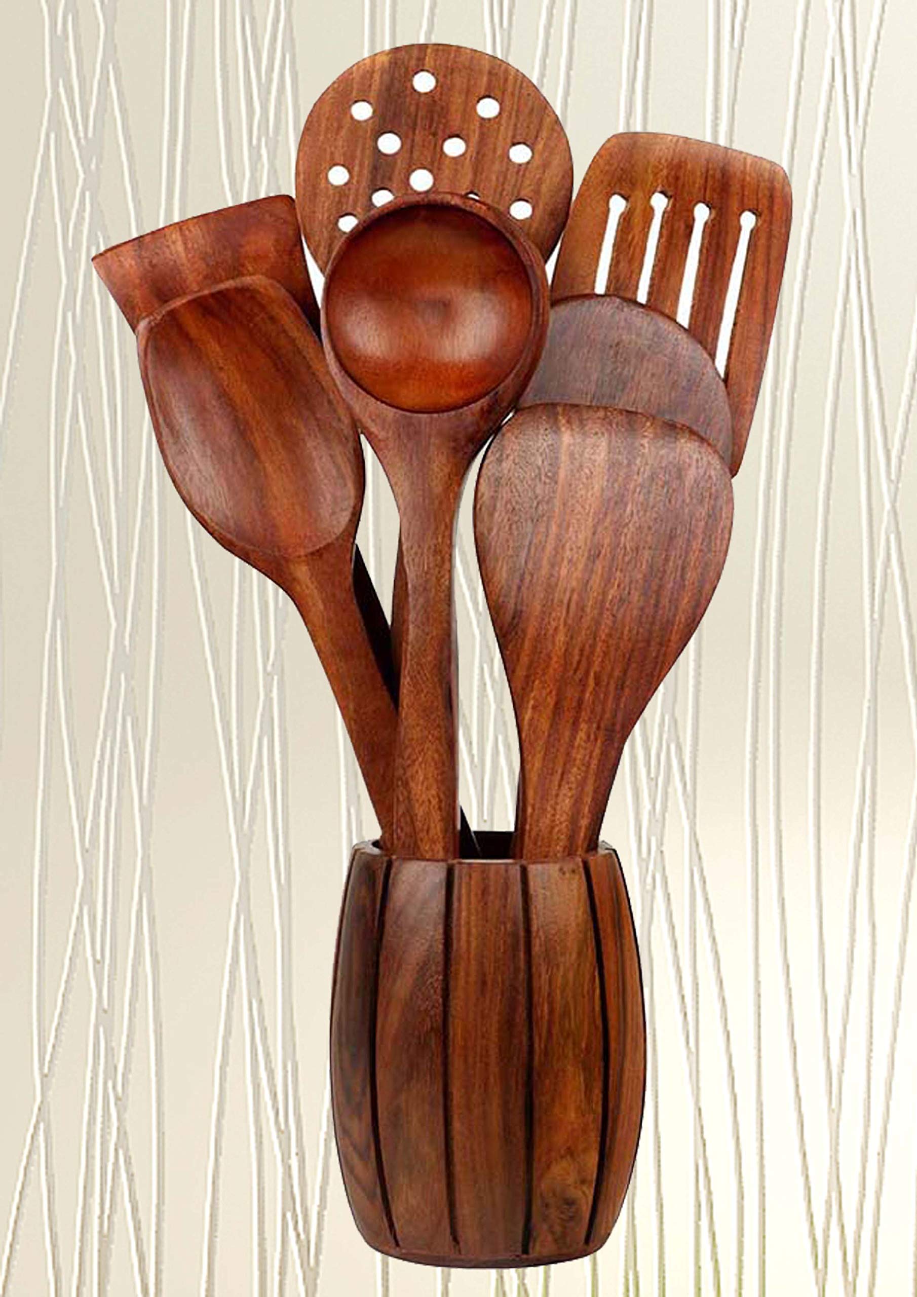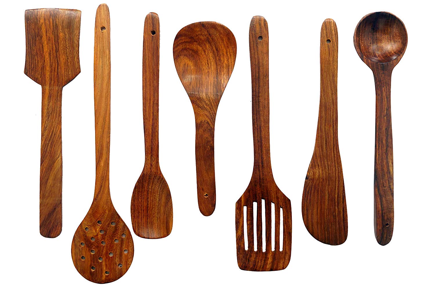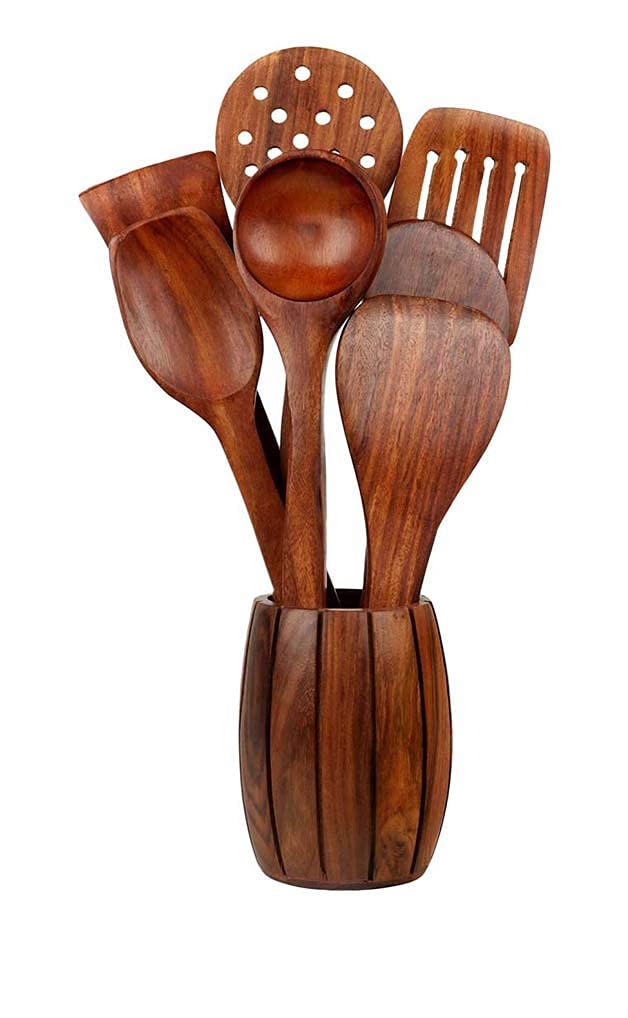 SAHARANPUR HANDICRAFTSMultipurpose serving and cooking spoon set your cooking and dining experience can be greatly enhanced by using the right set of spoon sets. Made from pure wood the wood art store handmade wooden spoon set is an ideal solution for cooking as well as serving your favourite dishes. Available in a set of 7 different spoons that can be used for serving various items such as rice dal sabzi and for cooking rotis dosas omelettes and more this set is a great addition to your kitchen tool set. Made from material ideal for daily use constructed using high quality wood the wood art store handmade wooden serving and cooking spoon set is perfect for cooking use as unlike plastic it does not leech harmful chemicals into your food. Also its non-abrasive wooden construction makes it ideal for use with non-stick cooking utensils unlike metal-based spoons. Elegant and ergonomic design easy to maintain furthermore the ergonomic design of these spoons makes them easy to use and handle for daily purposes. Featuring lengths between 10 and 15 inches